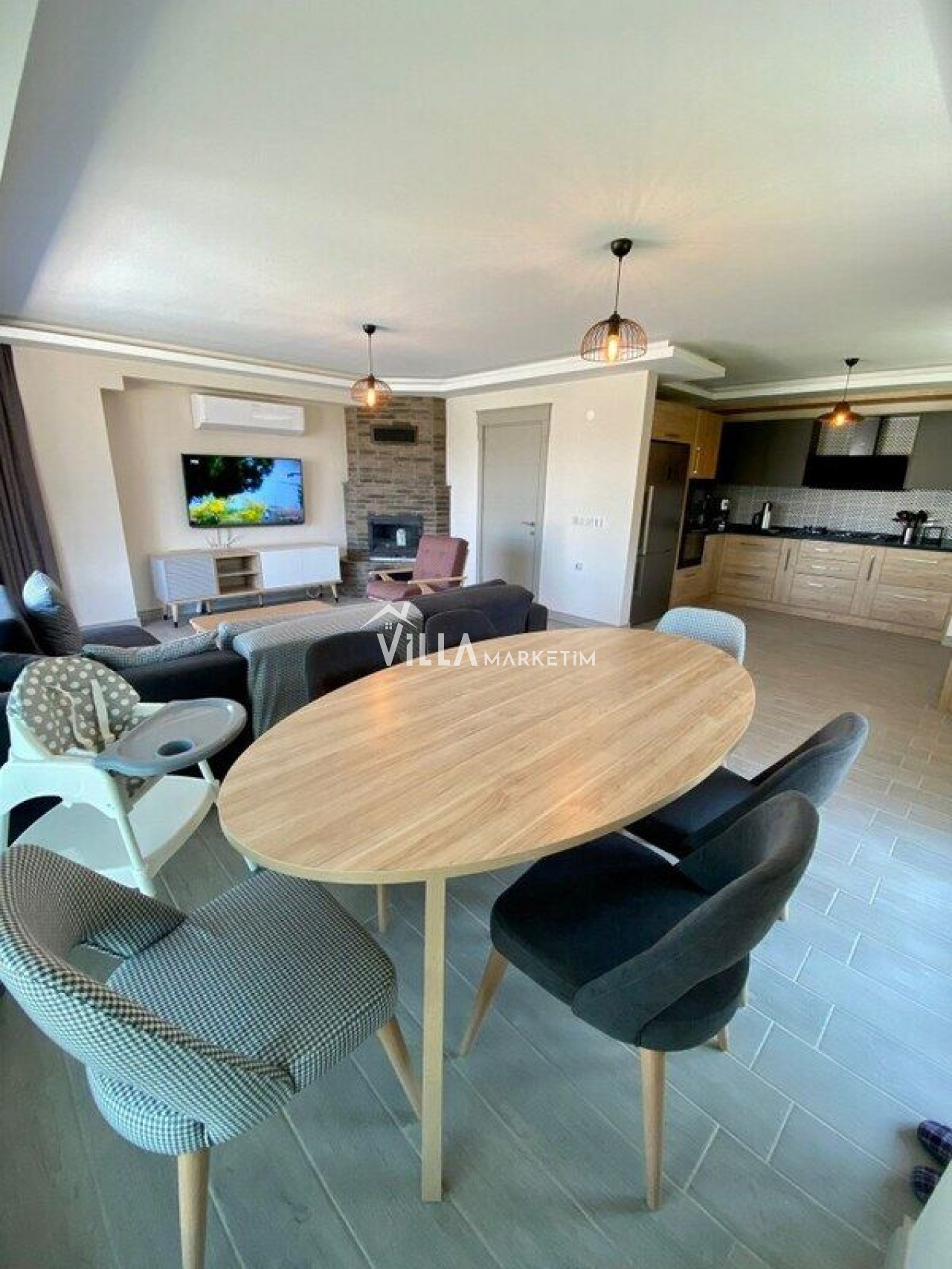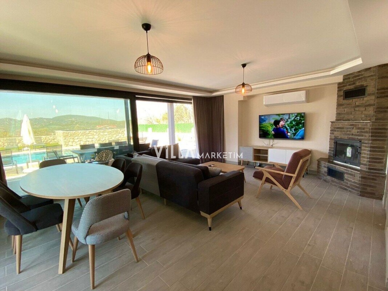 Salon : Oturma grubu, klima, TV, TV ünitesi, yemek masası ve sandaleyeleri, şömine, havuz terasına çıkış bulunmaktadır.