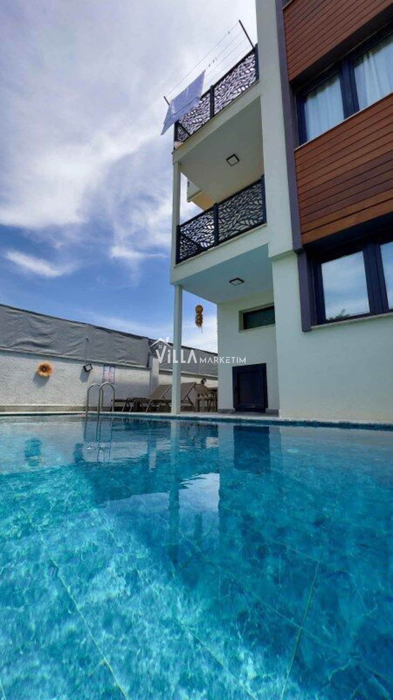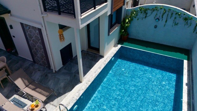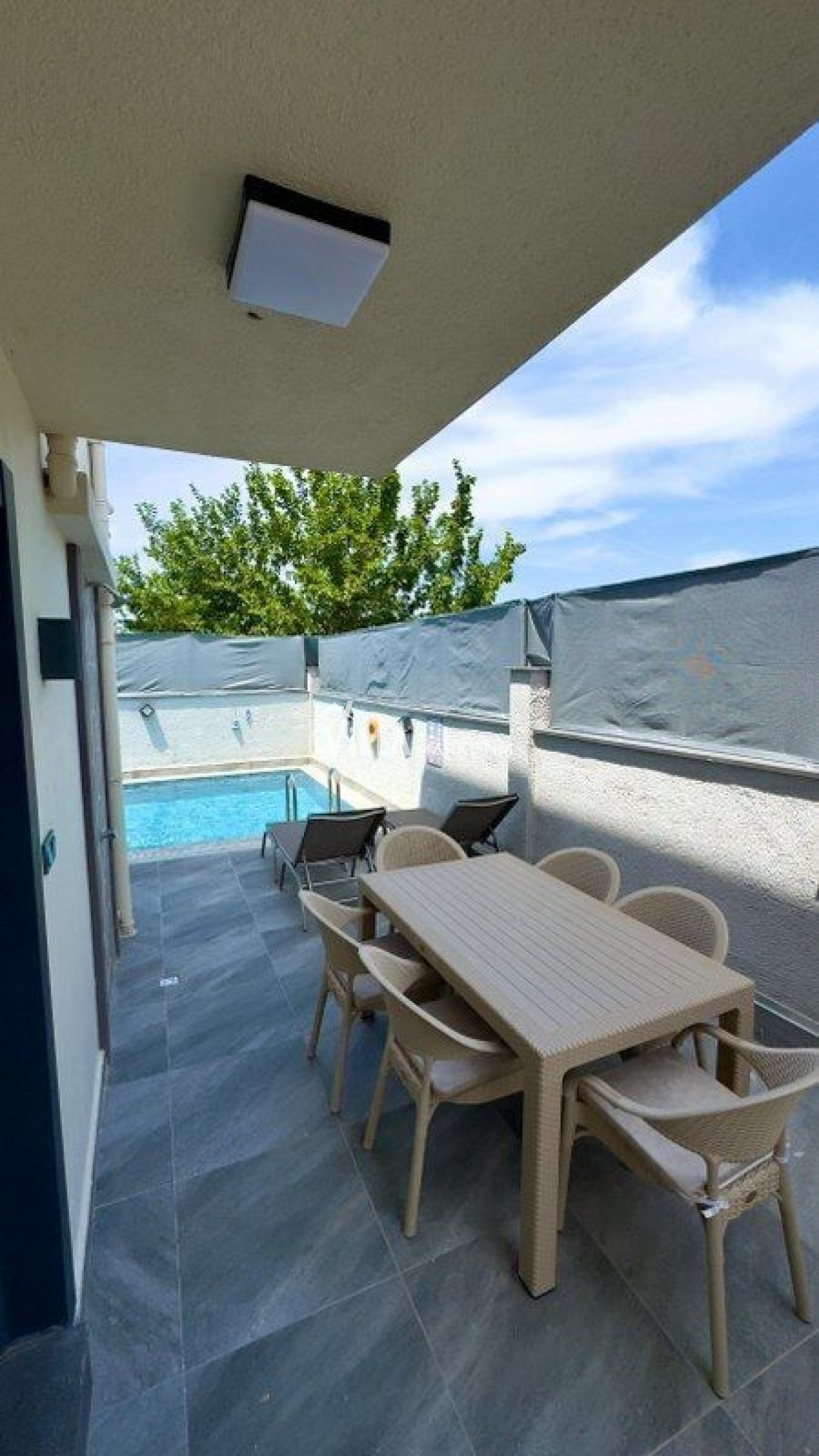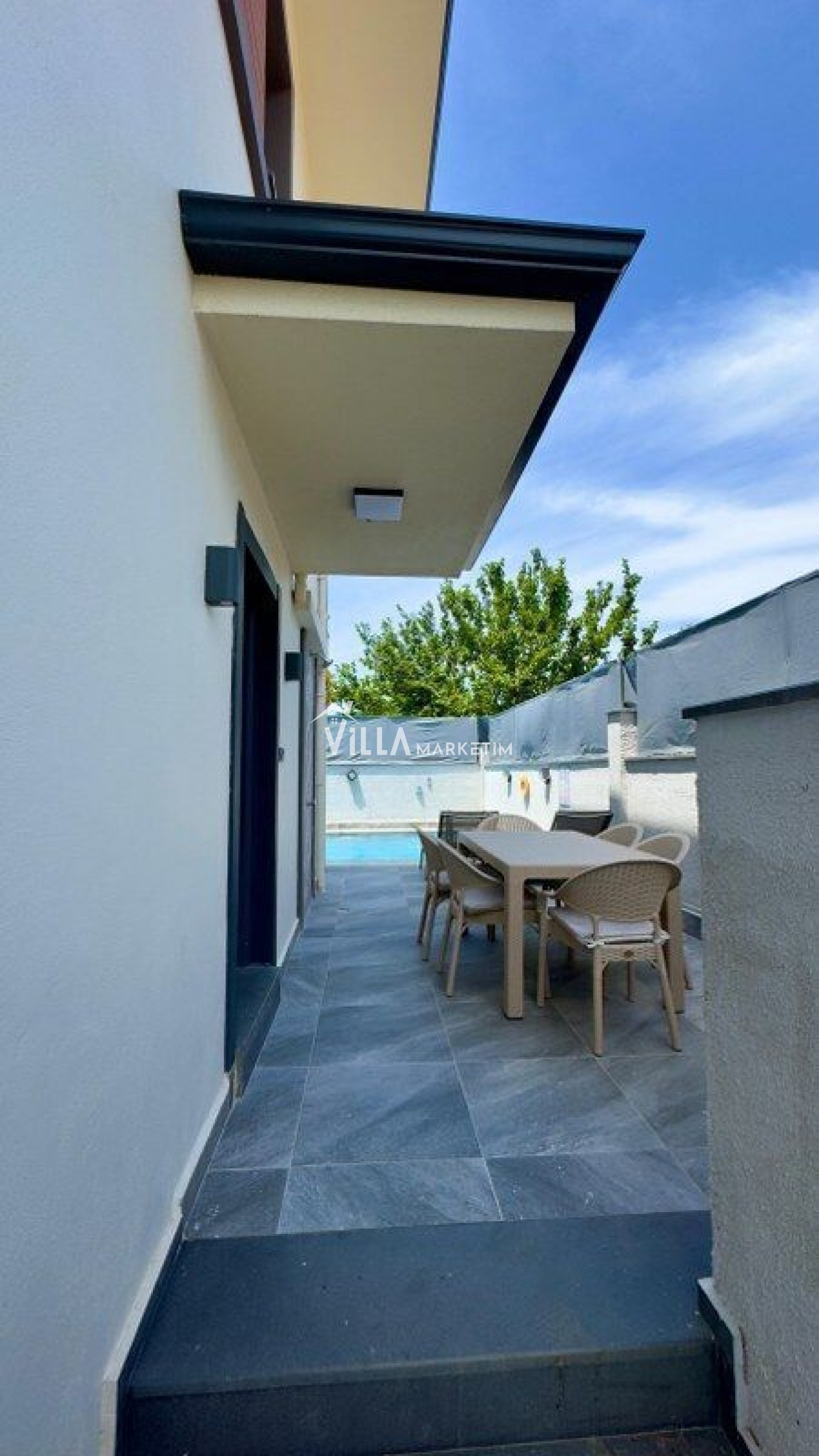 Havuz ve Bahçe: 9 x 3 metre ve 1.50 metre derinliğinde yüzme havuzu, 2 şezlong, şemsiye, veranda, bahçe oturma grubu, salıncak, mangal, masa ve sandalye, Bahçe ve havuz bakımı günde 1 kez sabah yapılır.