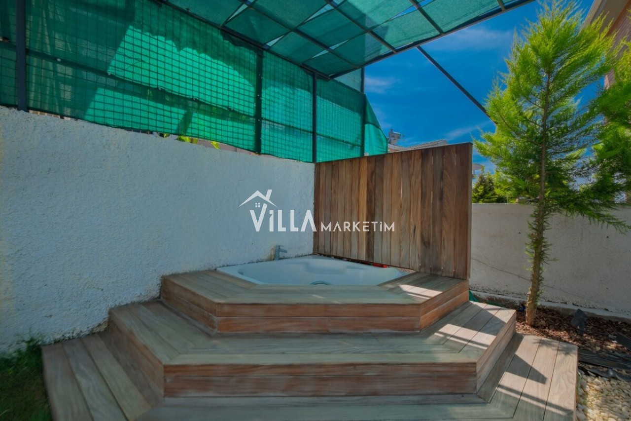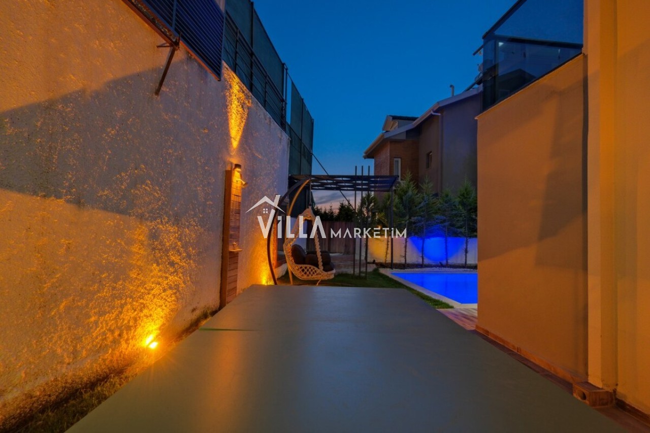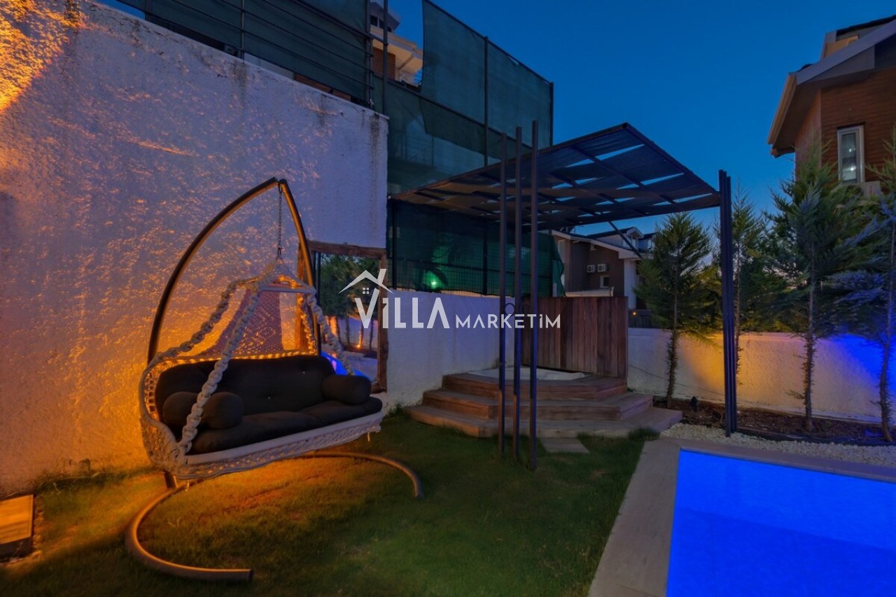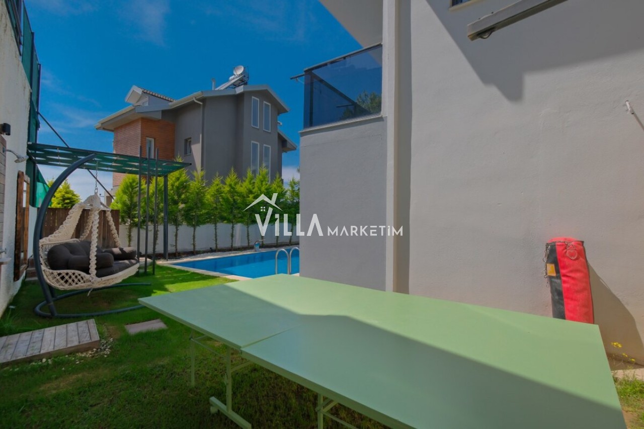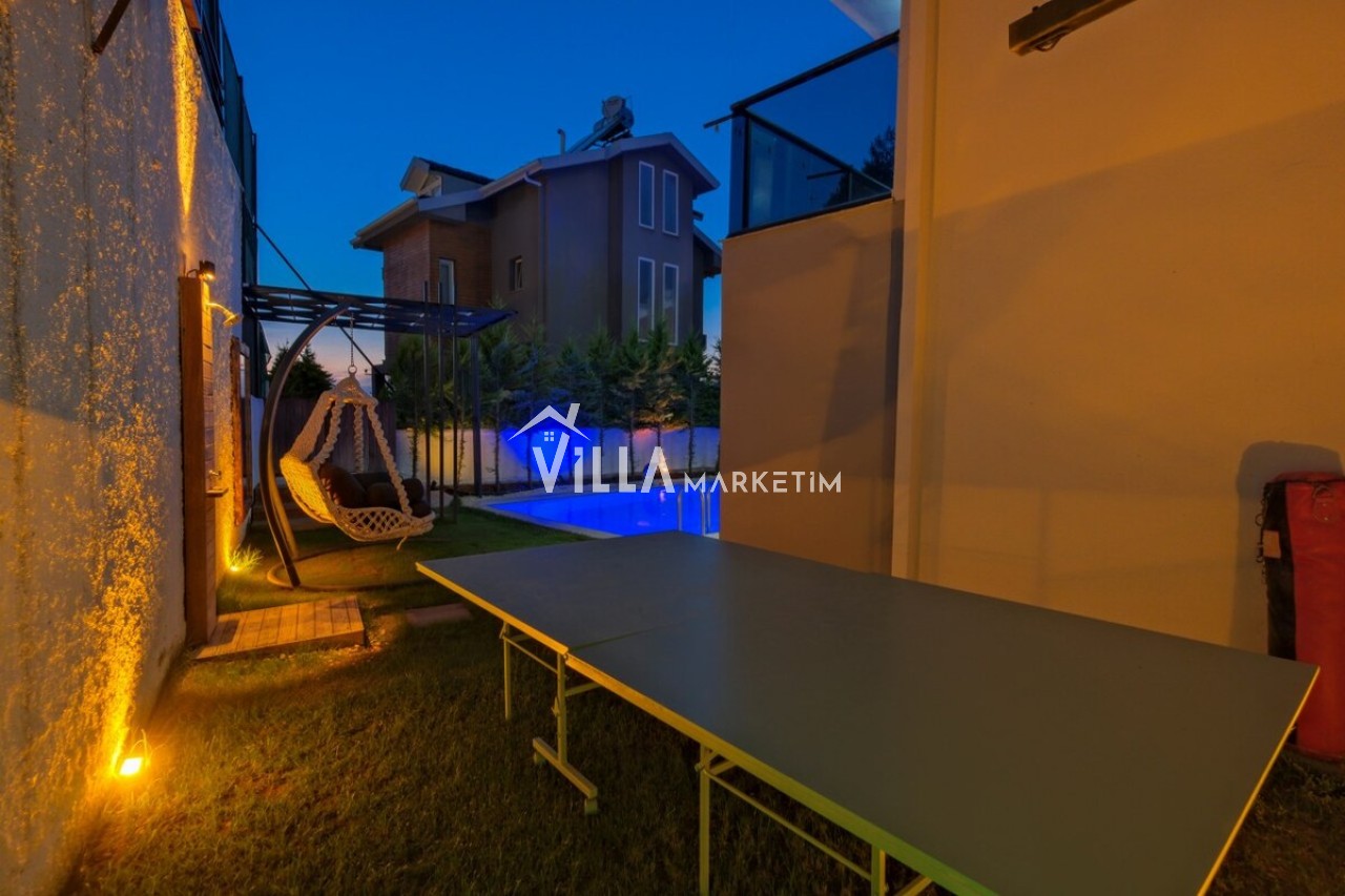 Özel Bahçe : Özel bahçede özel yüzme havuzu, masa tenisi, salıncak, şezlong, güneş şemsiyesi, bahçe oturma grubu, bahçe yemek masası, mutfak tezgahı, TV ve taş barbekü bulunmaktadır.