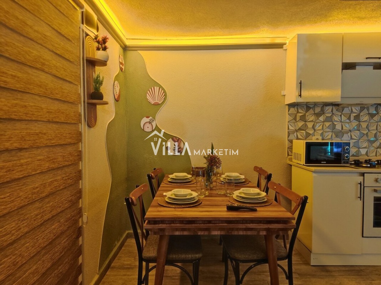 Mutfak : Modernliği yakalayan Amerikan mutfak içerisinde buzdolabı, bulaşık makinesi, ocak, fırın, mikrodalga fırın, su ısıtıcısı, tost makinesi, yemek takımı, çatal bıçak takımı, bardaklar ve yemek pişirme araç gereçleri yer almaktadır.
