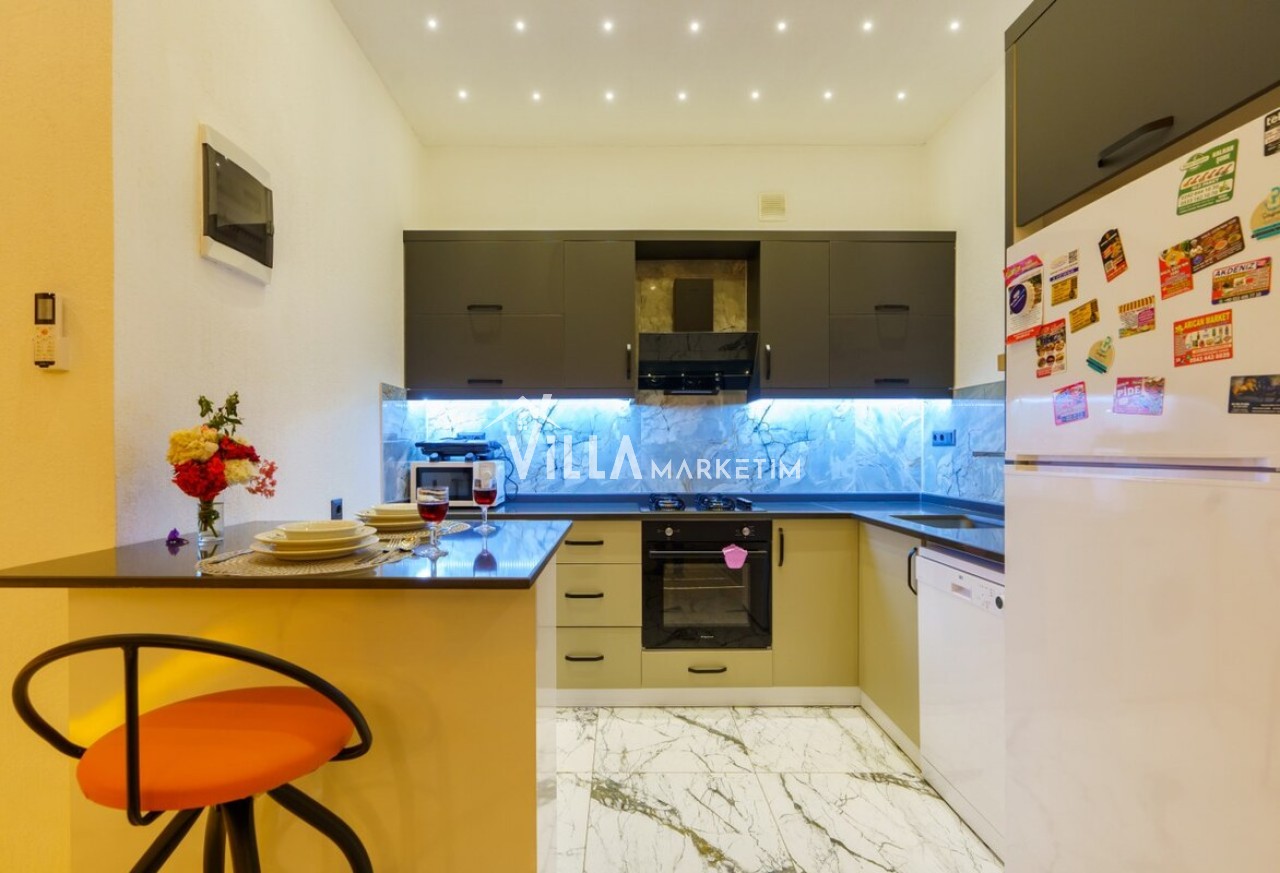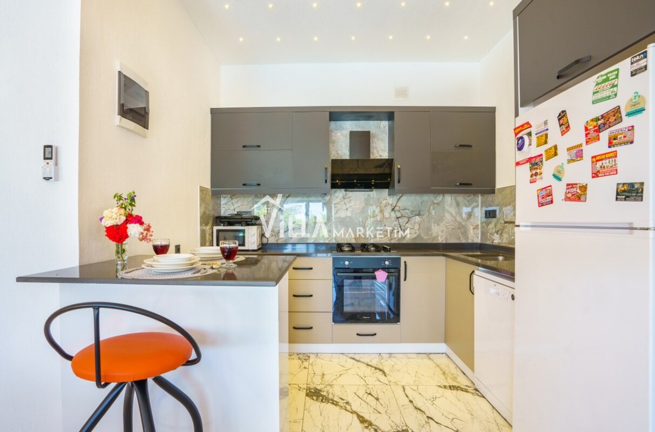 Mutfak : Modern Amerikan mutfaktır. Buzdolabı, bulaşık makinesi, mikrodalga fırın, ankastre 4’lü ocak, çamaşır makinesi, fırın, tost makinesi, tava ve tencere takımı, elektrikli su ısıtıcısı(kettle), cezve, çaydanlık, yemek masası ve sandalyeler, yemek takımı, çatal kaşık bıçak takımı, su ve çay bardağı takımları yer almaktadır. Mutfak havuz katındadır.
