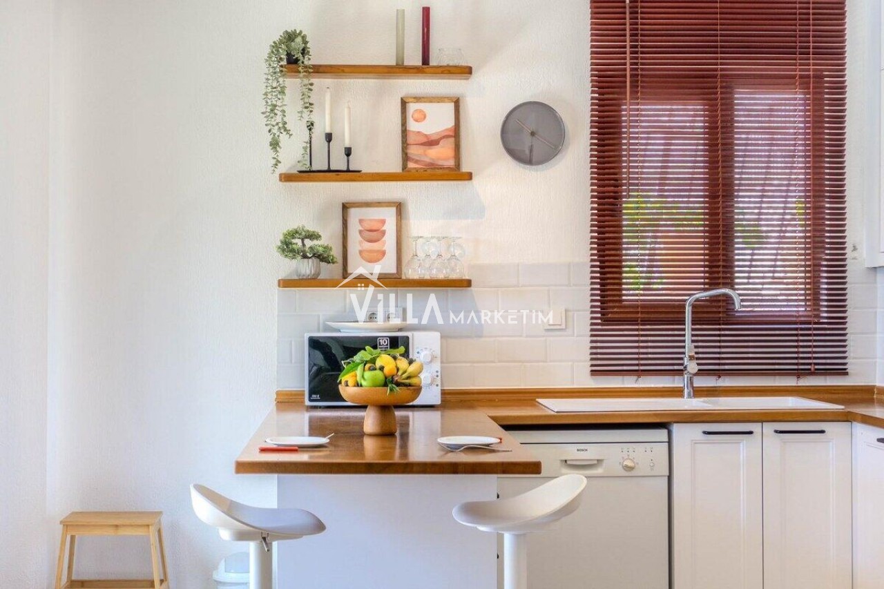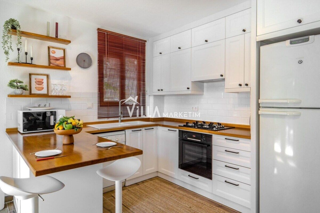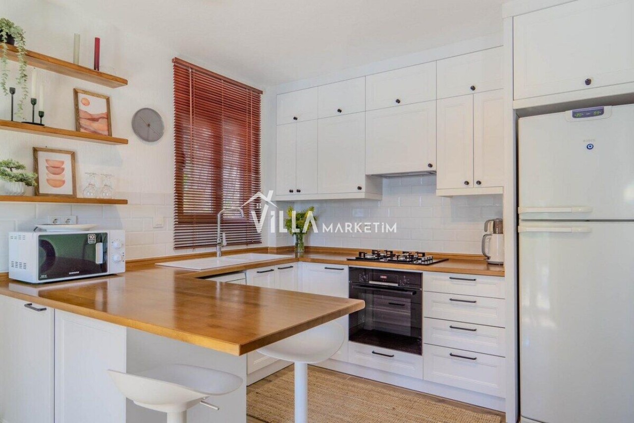 Mutfak : Modern Amerikan mutfaktır. Bulaşık makinesi, ankastre 4’lü ocak, buzdolabı, kaşık çatal seti, çamaşır makinesi, ankastre fırın, 6 kişilik yemek takımı, elektrikli su ısıtıcısı (kettle), tencere tava takımı ve bardaklar bulunmaktadır. Mutfak havuz katındadır.