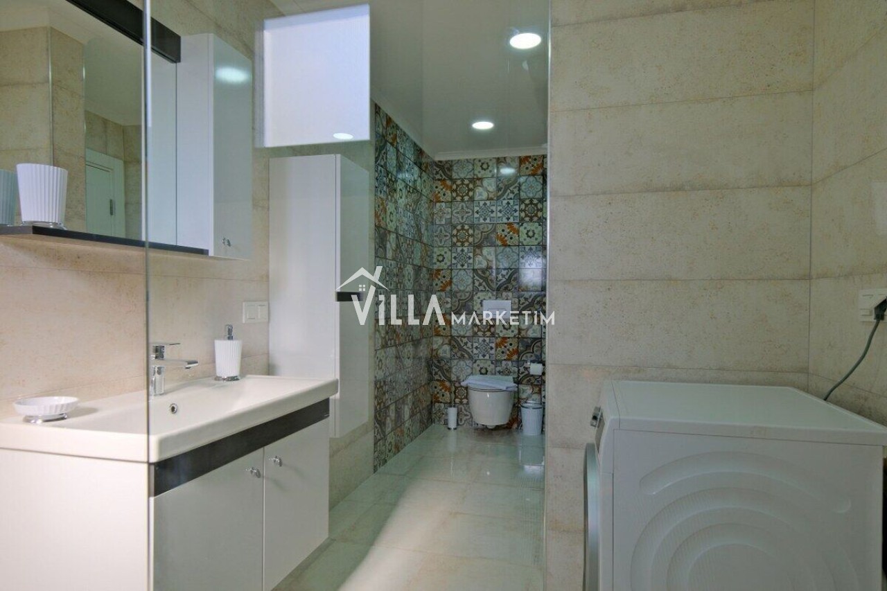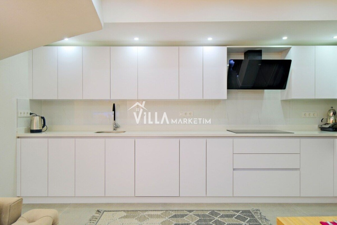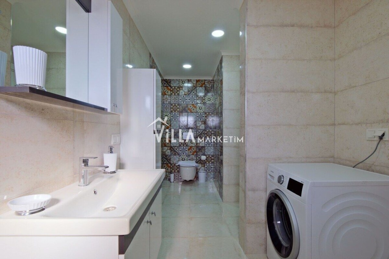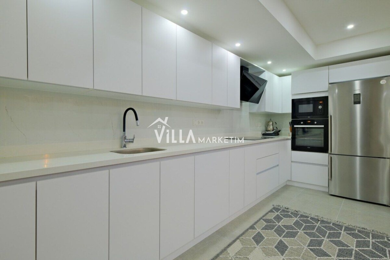 Mutfak : Modern Amerikan mutfakta buzdolabı, bulaşık makinesi, çamaşr makşnesi, ankastre 4’lü ocak, kettle, çatal ve bıçak takımı, elektrikli su ısıtıcısı, tencere ve tavalar, 6 kişilik yemek takımı, su ve çay bardakları, 6kişilik yemek masası ve sandalyeleri yer almaktadır.