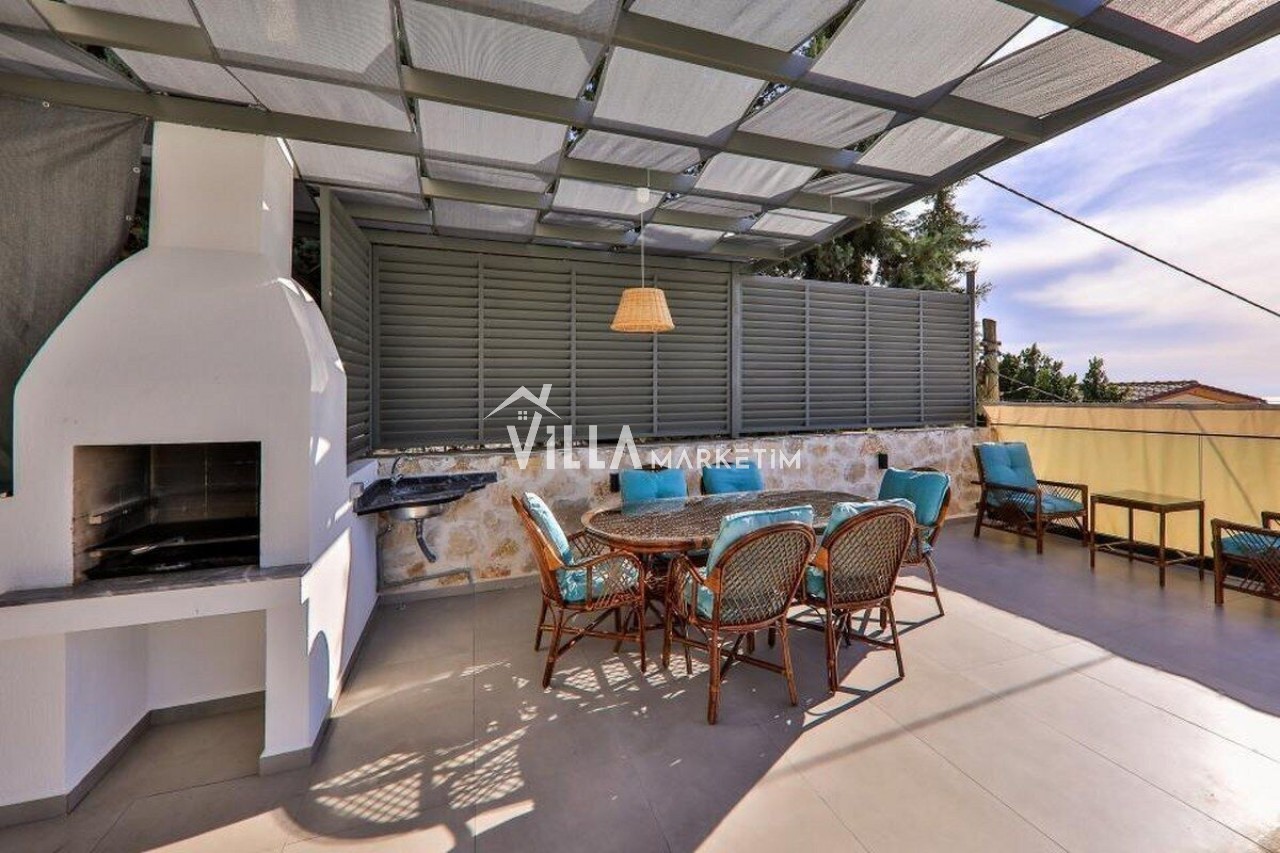 Bahçe : Özel bahçe içerisinde yüzme havuzu, güneşlenme terası, 4 adet şezlong, güneş şemsiyesi, bahçe oturma grubu, 6 kişilik yemek masası ve taş barbekü bulunmaktadır.