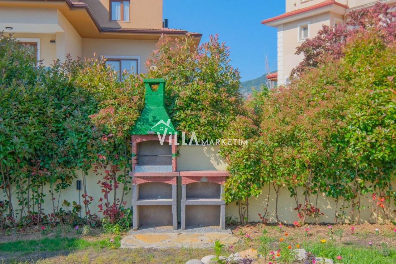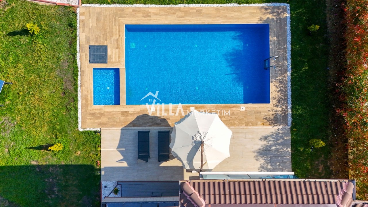 Bahçe : Bahçe içerisinde havuz, çocuk havuzu, 4adet şezlong, masa tenisi, şemsiye, salıncak, oturma grubu, yemek masası ve sandalyeler ve barbekü yer almaktadır.