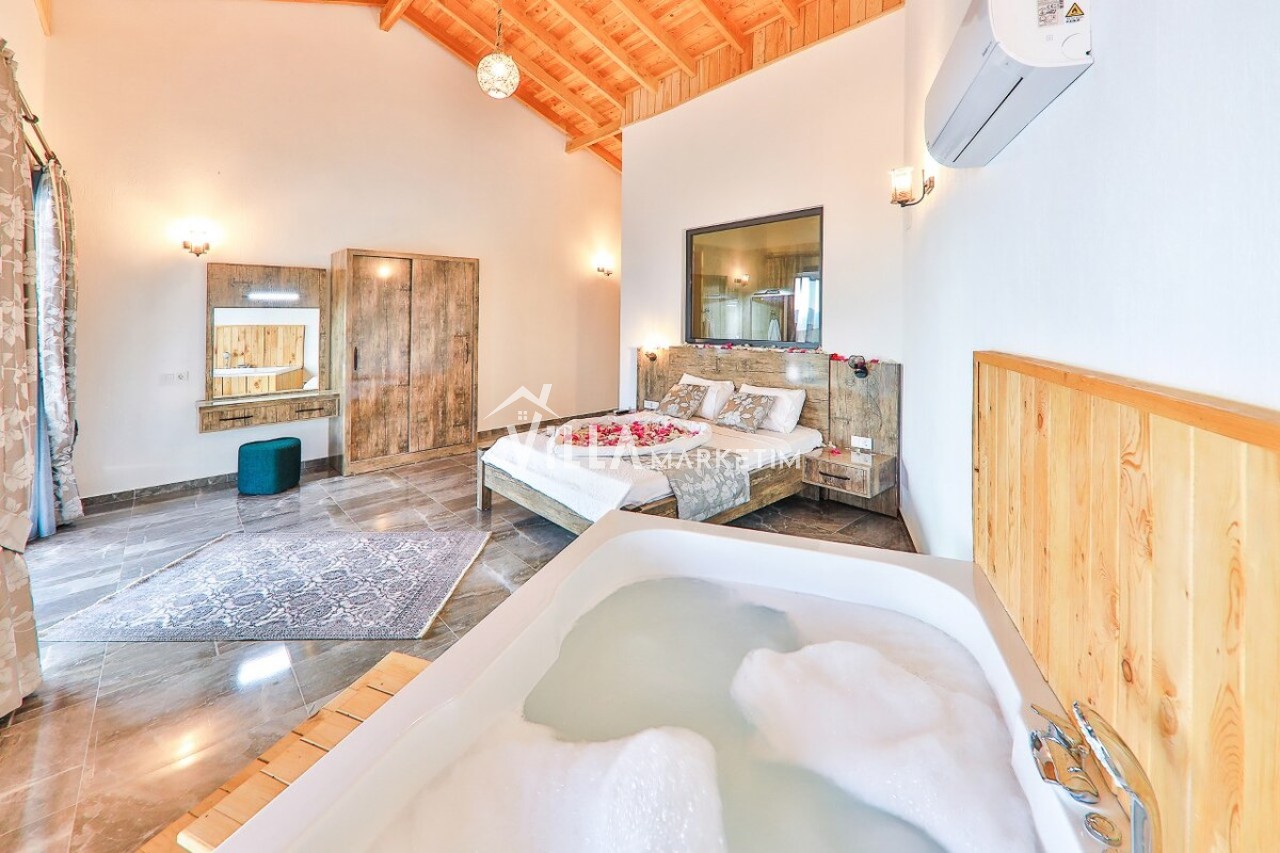 1. Yatak Odası: 1 adet çift kişilik yatak, klima, komodin, makyaj masası, elbise dolabı, TV, jakuzi ve banyo, tuvalet bulunmaktadır.
