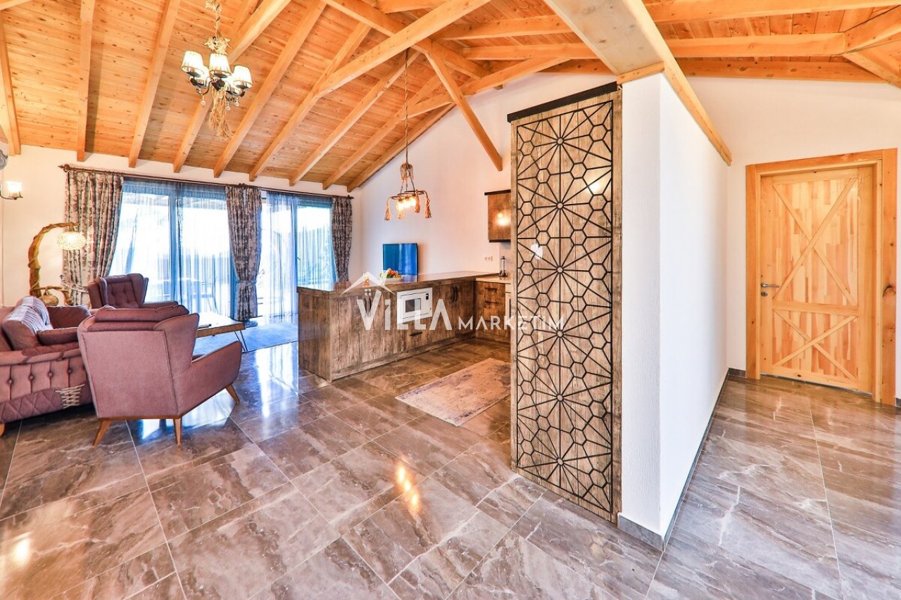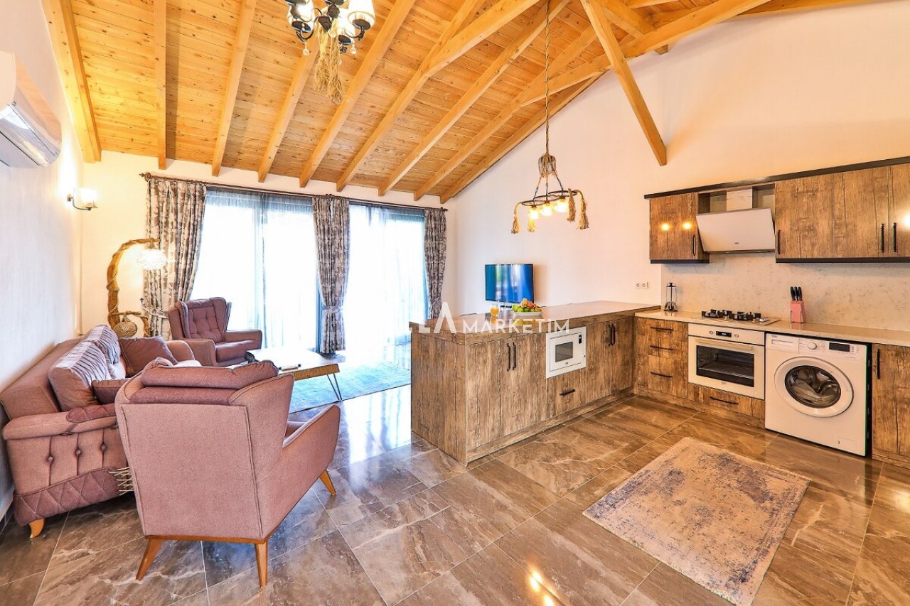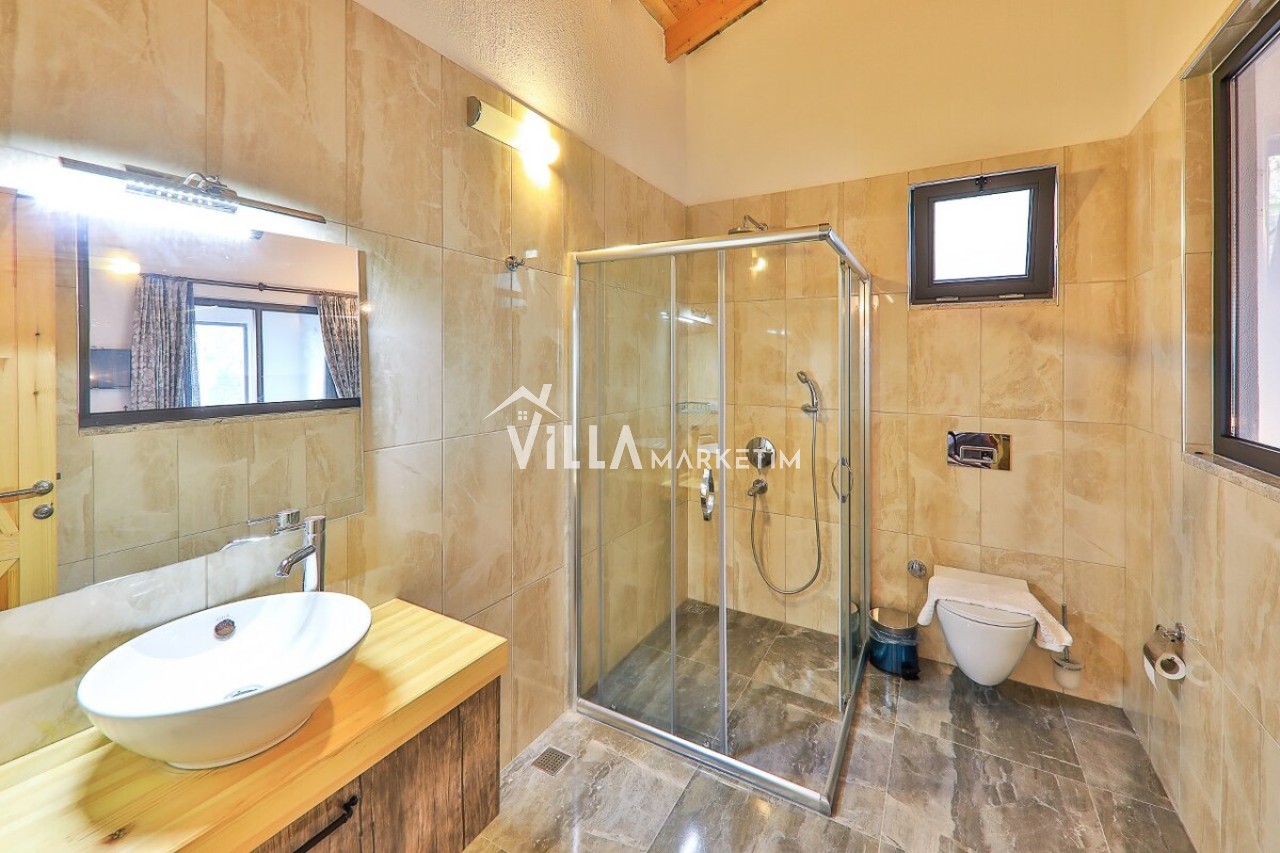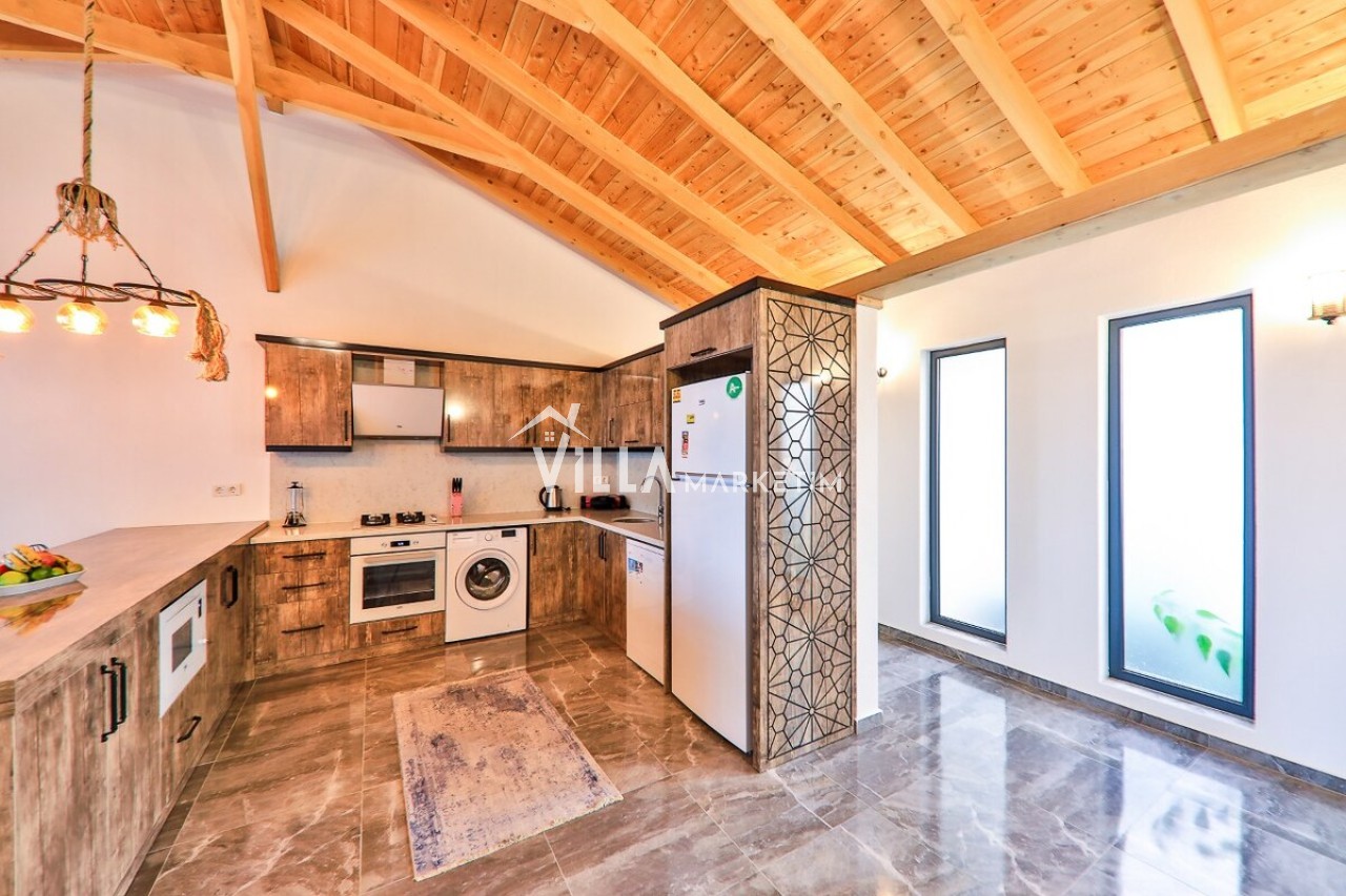 Mutfak: Modern çizgilerin biraz dışına çıkmış olan villamız ahşap yapısı ve özellikle manzarası ile mutfağındanda hiç çıkmak istemeyeceksiniz. Villamızın mutfağında; buzdolabı, bulaşık makinesi, çamaşır makinesi, ankastre fırın, ankastre 4’lü ocak, elektrikli su ısıtıcısı, yemek takımı, çatal-kaşık takımı, tencereler, tavalar, bardaklar, yemek masası ve sandalyeler bulunmaktadır.