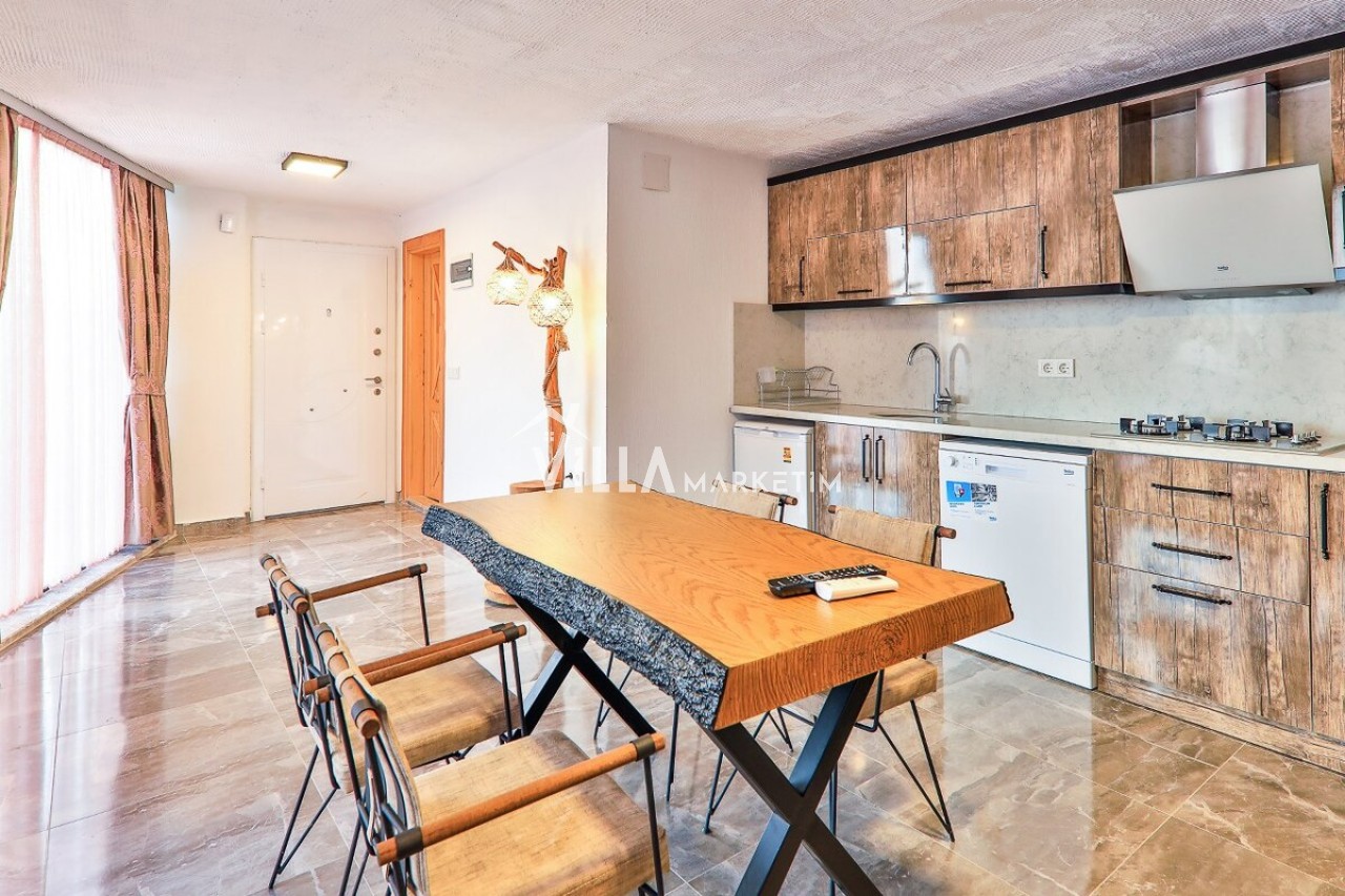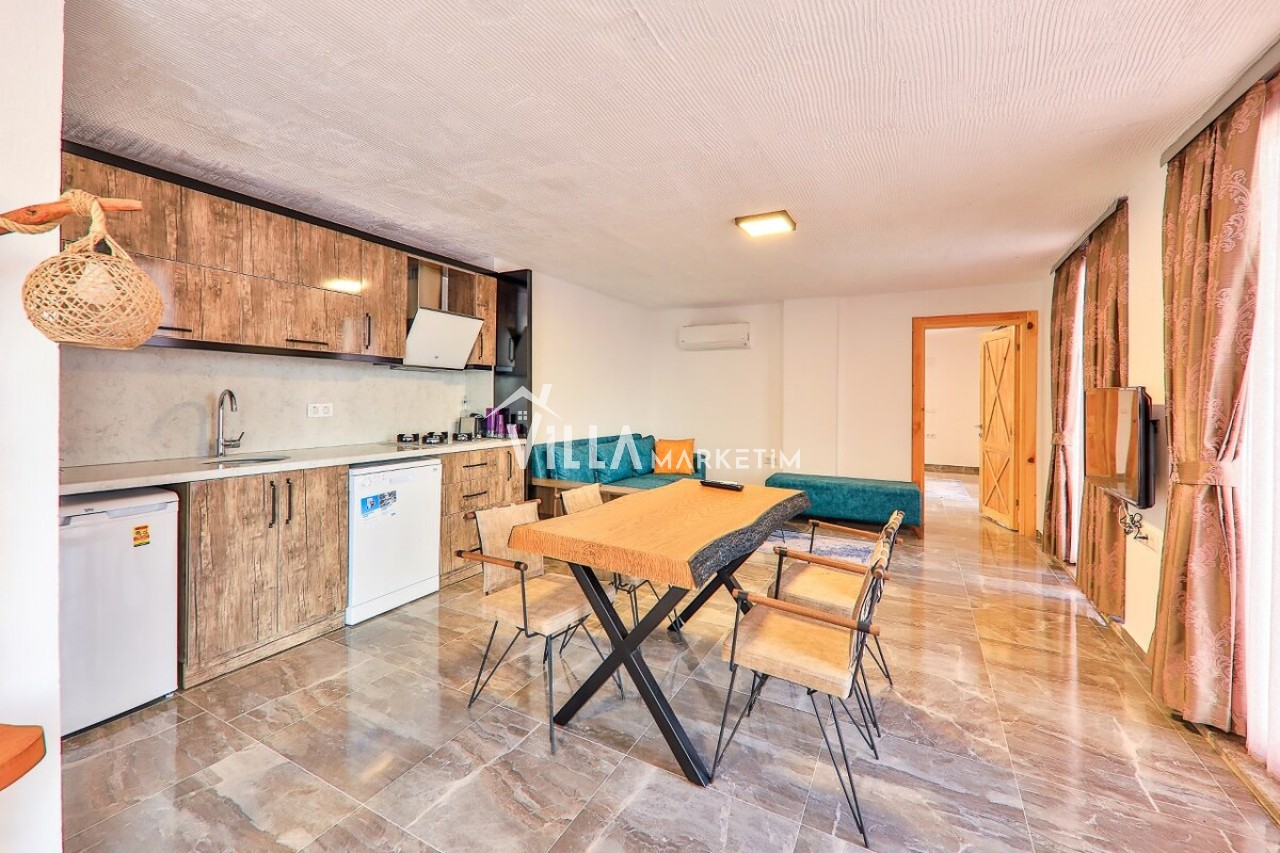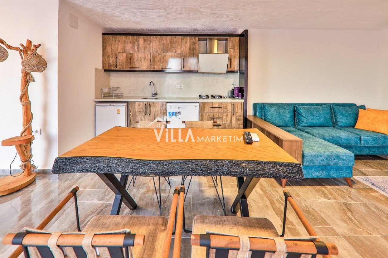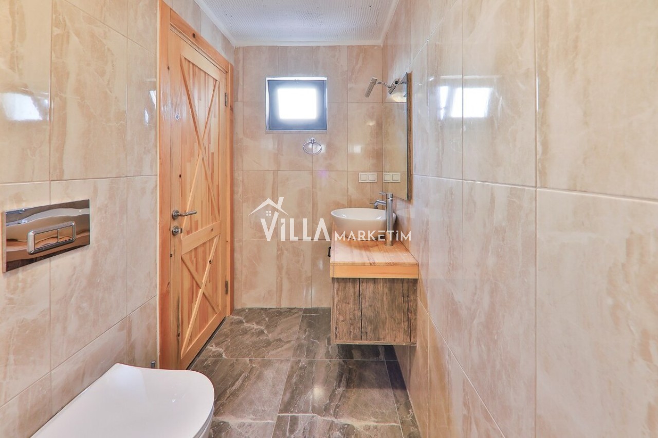 Mutfak: Modern çizgilerin biraz dışına çıkmış olan villamız ahşap yapısı ve özellikle manzarası ile mutfağındanda hiç çıkmak istemeyeceksiniz. Villamızın mutfağında; buzdolabı, bulaşık makinesi, çamaşır makinesi, ankastre fırın, ankastre 4’lü ocak, elektrikli su ısıtıcısı, yemek takımı, çatal-kaşık takımı, tencereler, tavalar, bardaklar, yemek masası ve sandalyeler bulunmaktadır.