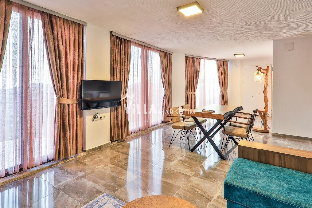 Salon: Aileniz ile keyifli zamanlar geçirebileceğiniz villamızın salonunda oturma grubu, TV, uydu alıcısı, klima, sehpa ve kablosuz modem yer almaktadır.