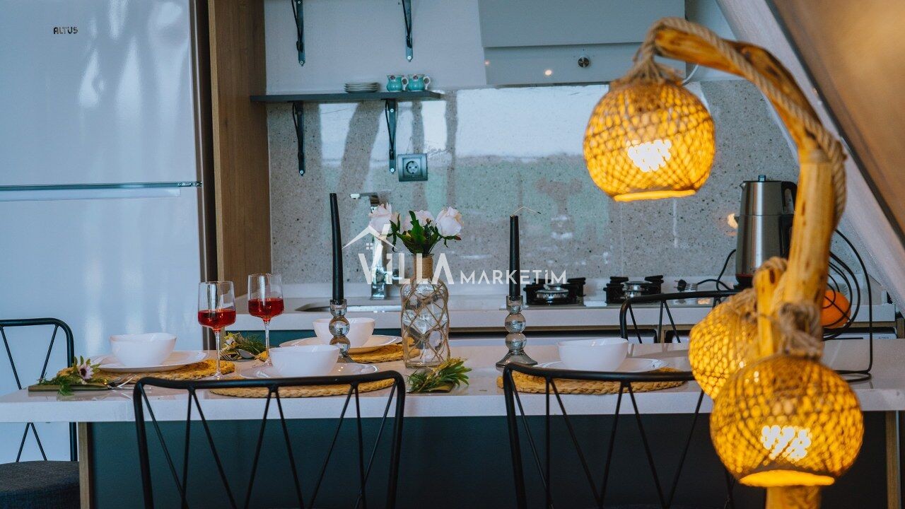 Mutfak : Modern Amerikan mutfaktır. Bulaşık makinesi, ankastre 4’lü ocak, buzdolabı, kaşık çatal seti, çamaşır makinesi, ankastre fırın, 3 kişilik yemek takımı, elektrikli su ısıtıcısı (kettle), tencere tava takımı ve bardaklar bulunmaktadır. Mutfak havuz katındadır.
