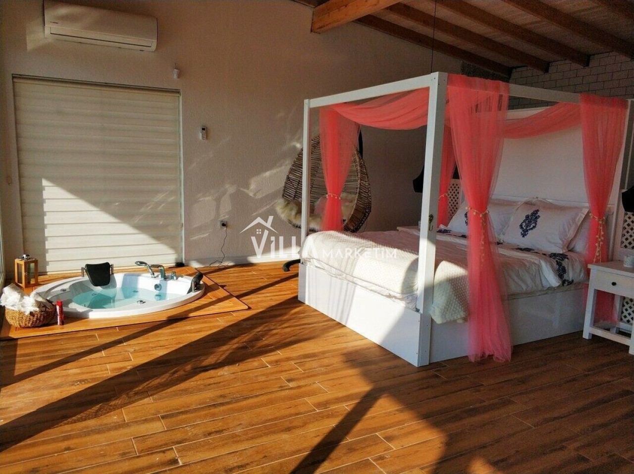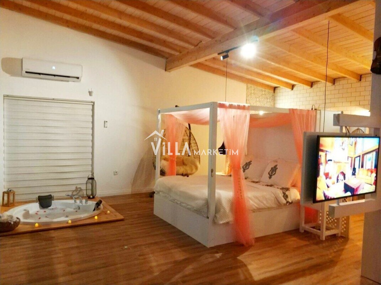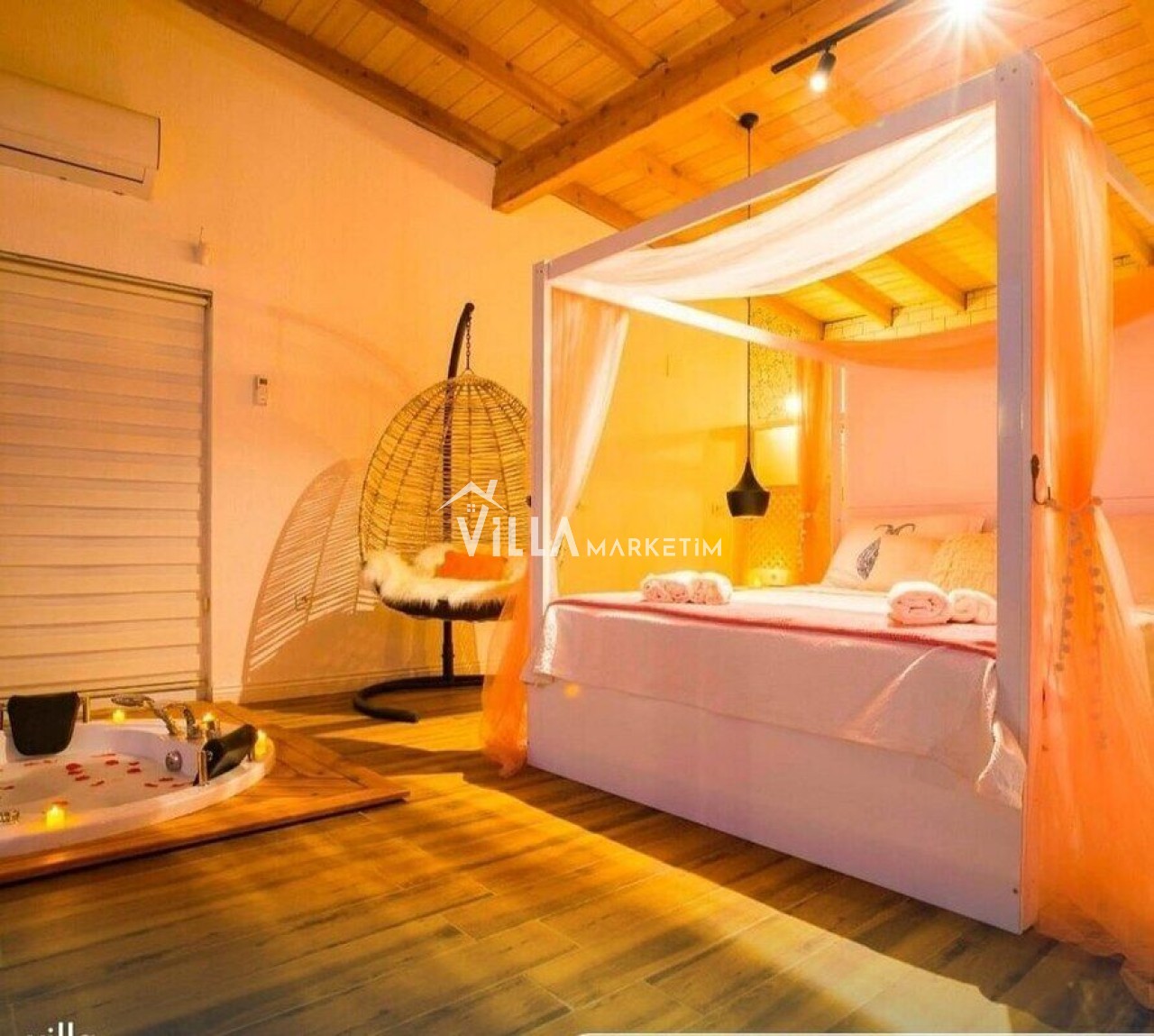 Yatak odası 1 : Master suit yatak odasıdır. 1 adet yuvarlak çift kişilik yatak, 2 adet komodin, makyaj masası, klima, banyo ve tuvalet, ısıtmalı havuz bulunmaktadır.
