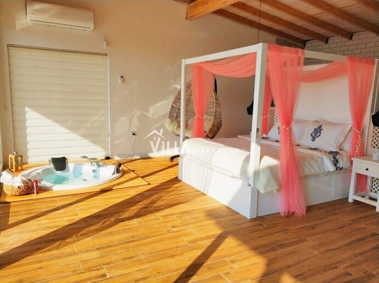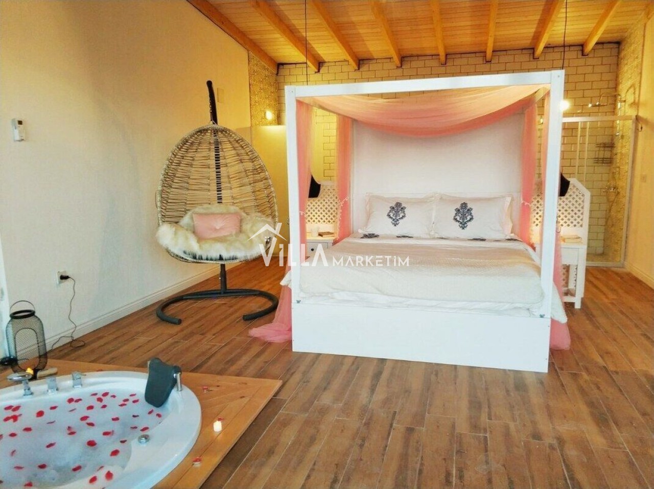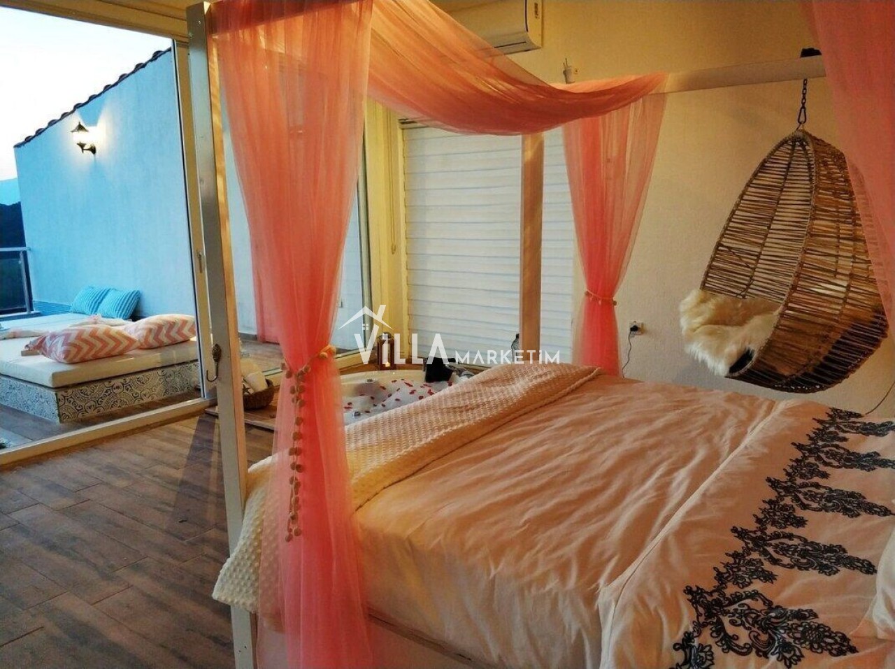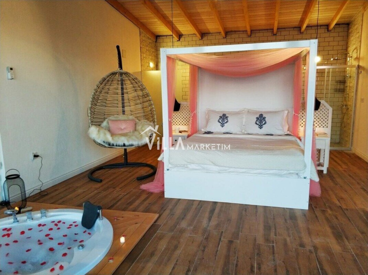 Yatak odası 1 : Master suit yatak odasıdır. 1 adet yuvarlak çift kişilik yatak, 2 adet komodin, makyaj masası, klima, banyo ve tuvalet, ısıtmalı havuz bulunmaktadır.