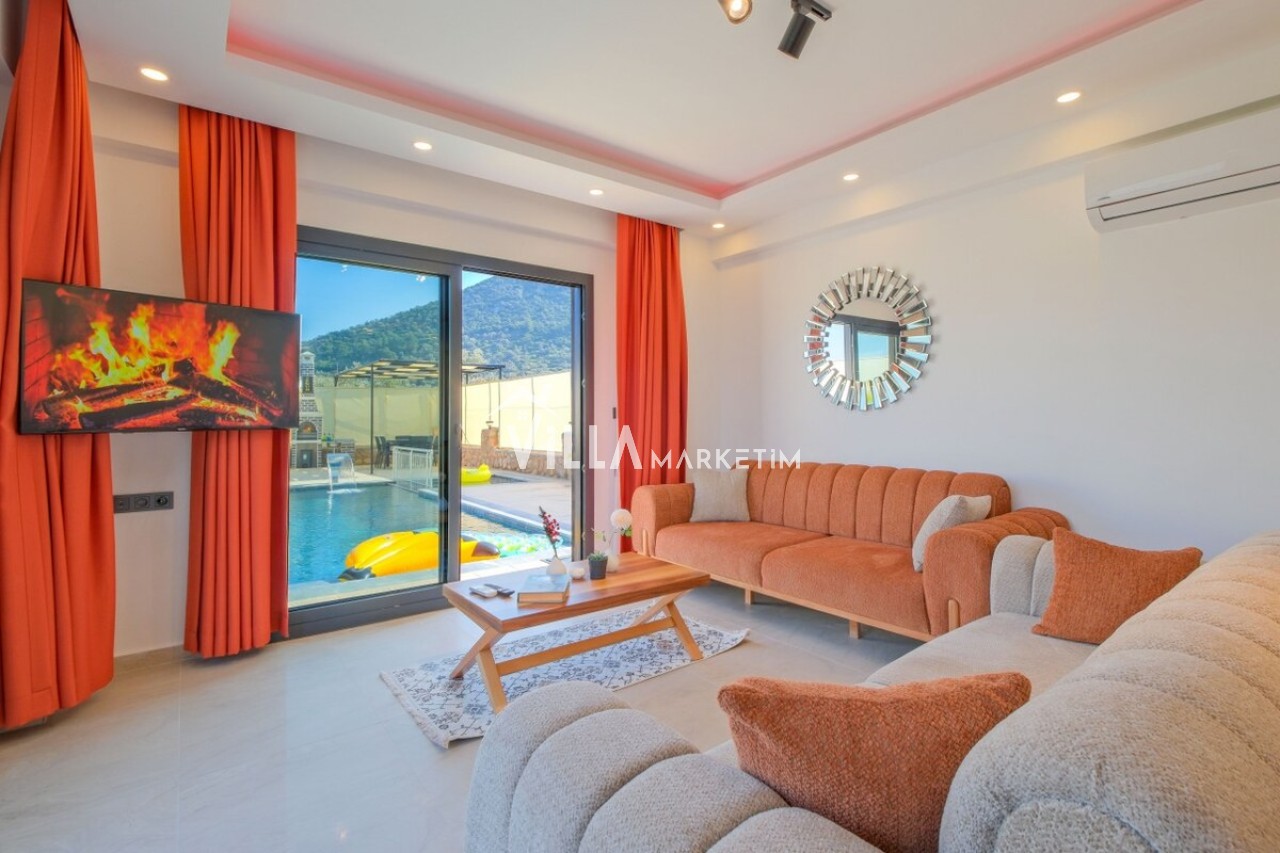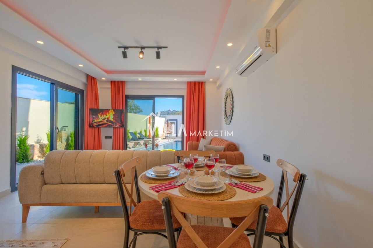 Salon: Özenle döşenmiş açık mutfaklı salon, klima, modern koltuklar, 6 kişilik yemek masası, Led tv, uydu alıcısı, havuz ve bahçeye açılan kapısı bulunmaktadır.