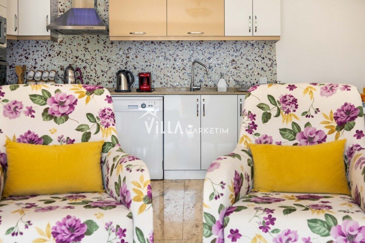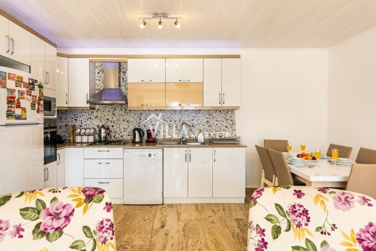 Mutfak : Ferah ve Modern Dizayn Edilmiş Amerikan Mutfak, Buzdolabı, Bulaşık Makinesi,Fırın, 4’lü Ocak (ankastre), elektrikli su ısıtıcı, tava & tencere vb. mutfak ekipmanları,yemek takımı bulunmaktadır.