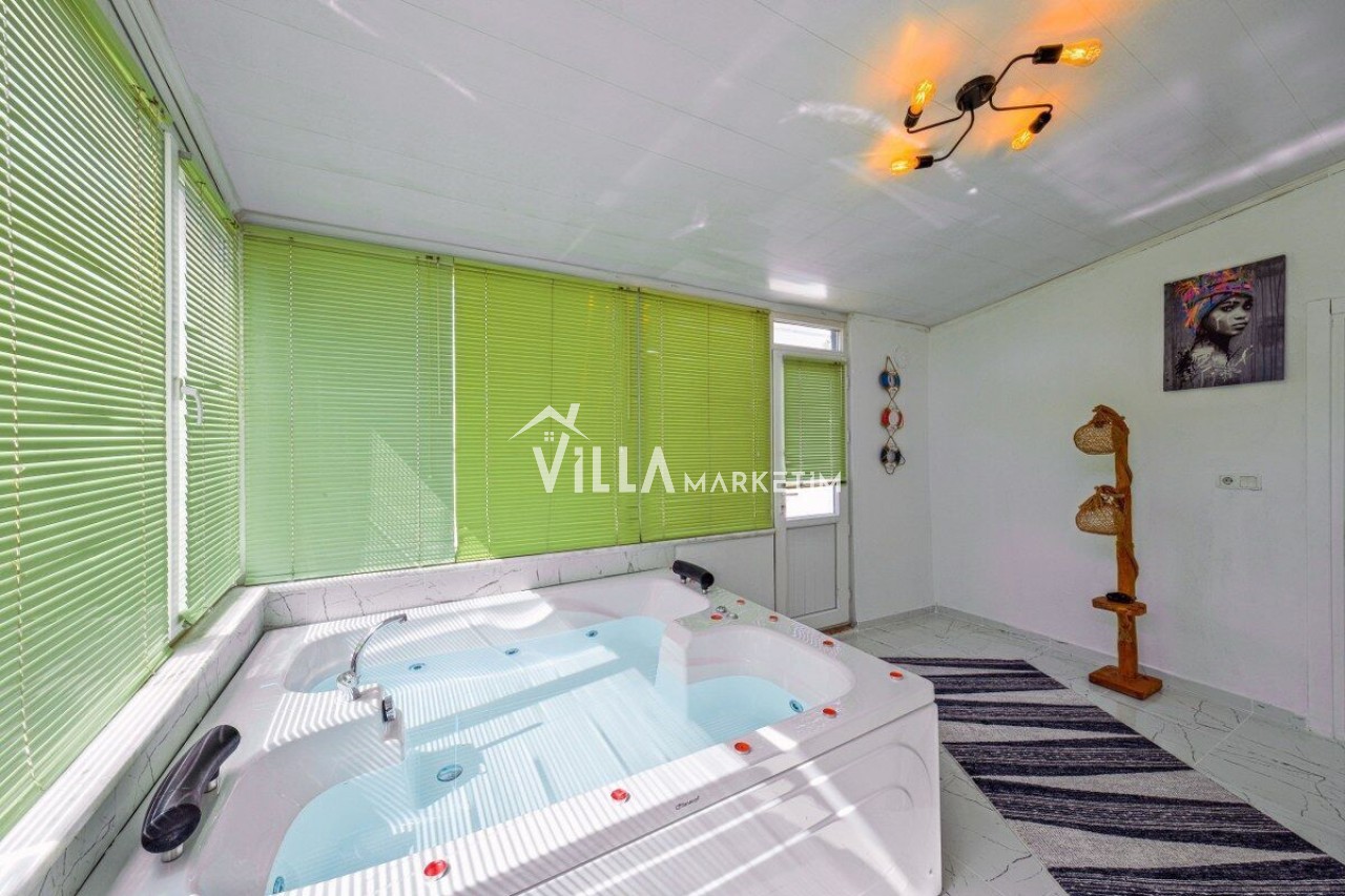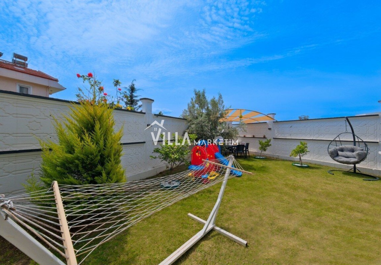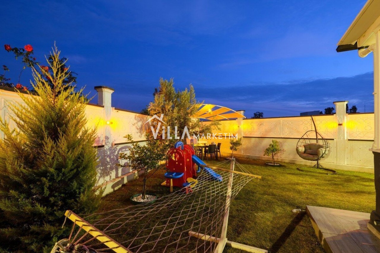 Bahçe : Özel yüzme havuzu, 4 ad. şezlong, 2 ad. güneş şemsiyesi çocuk oyun alanı, bahçe yemek masası, hamak, damla salıncak, veranda altı masa ve sandalyeler ve barbekü yer almaktadır.
