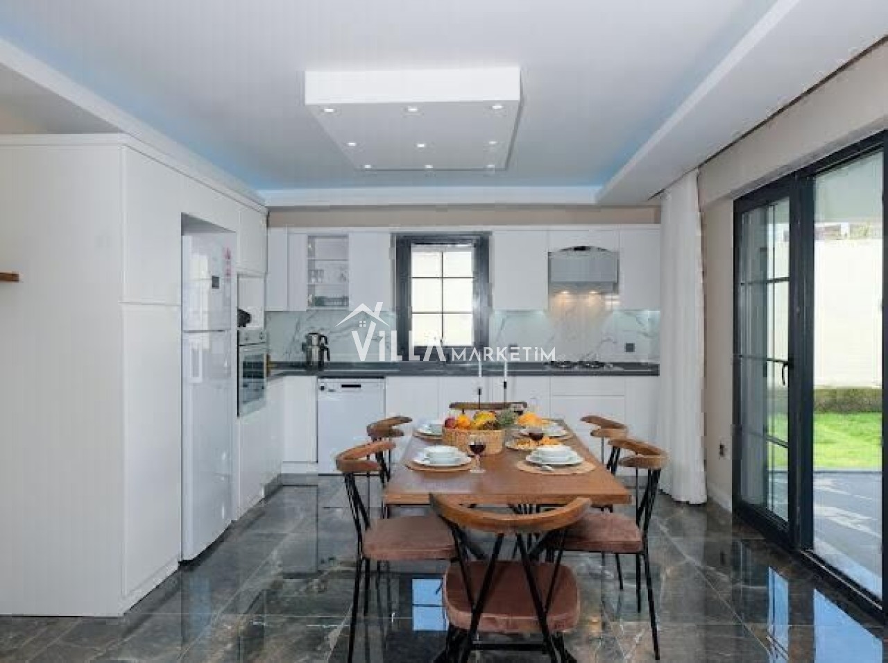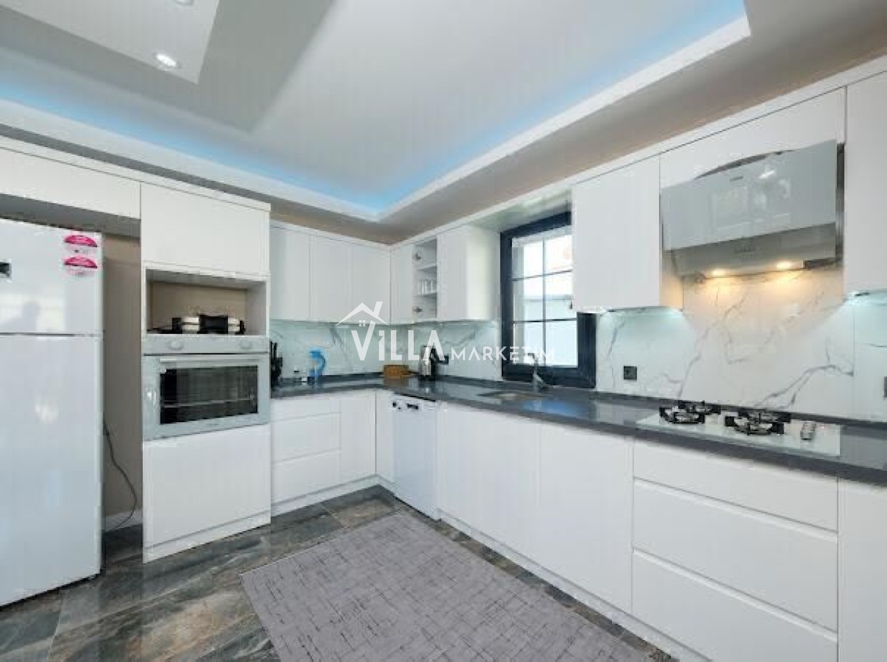 Mutfak : Modern Amerikan mutfak içerisinde buzdolabı, bulaşık makinesi, çamaşır makinesi, çay makinesi, kahve makinesi, fırın, 6 kişilik yemek masası, mutfak araç gereçleri bulunmaktadır.
