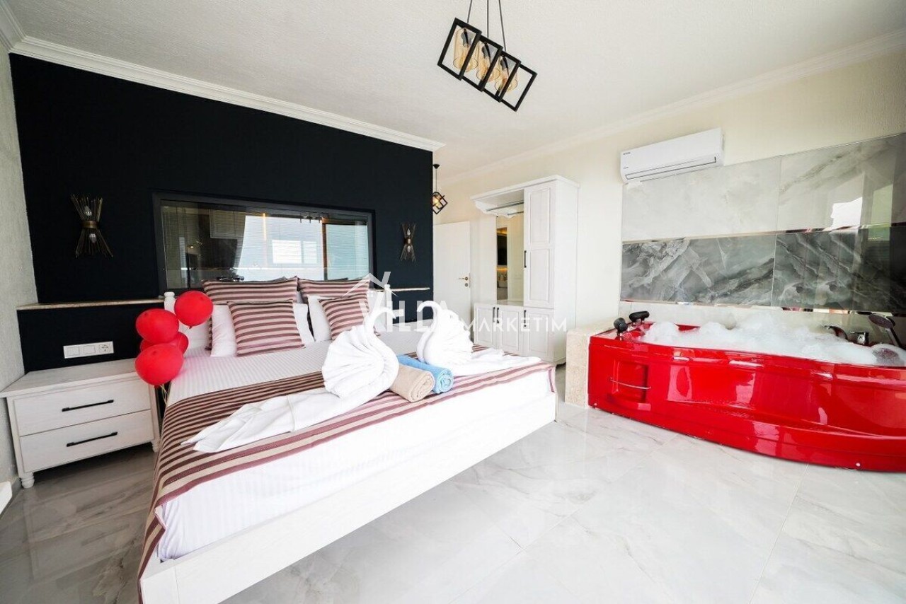 1. Yatak Odası : Çift kişilik yatak, komodin, klima, jakuzi, elbise dolabı, makyaj masası, banyo & wc ve havuz terasına çıkış bulunmaktadır.