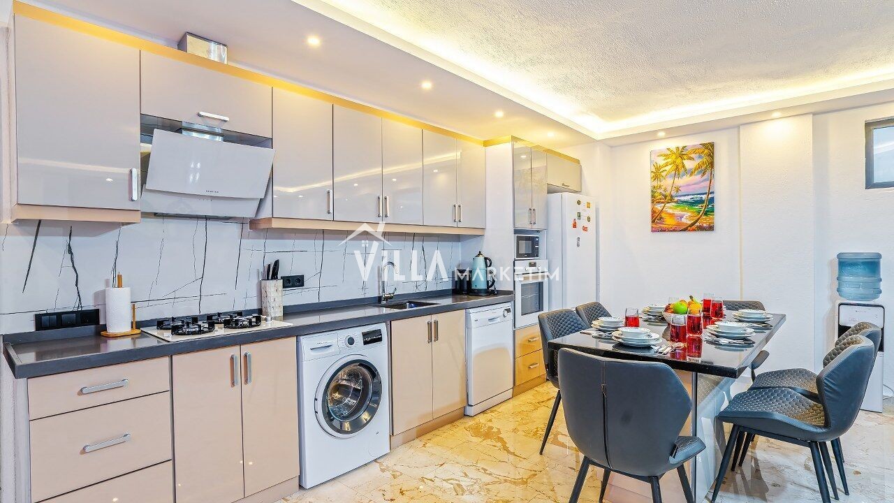 Mutfak : Modern Amerikan mutfaktır. Mutfak içerisinde mama sandalyesi, bulaşık makinesi, çamaşır makinesi, buzdolabı, Su sebili, elektrikli su ısıtıcısı(kettle),kahve makinesi , çay makinesi, fırın, 4 lü ocak, tost makinesi, kaşık çatal bıçak takımı, tencere ve tava takımı, 4 kişilik yemek takımı ve bardaklar mevcuttur.