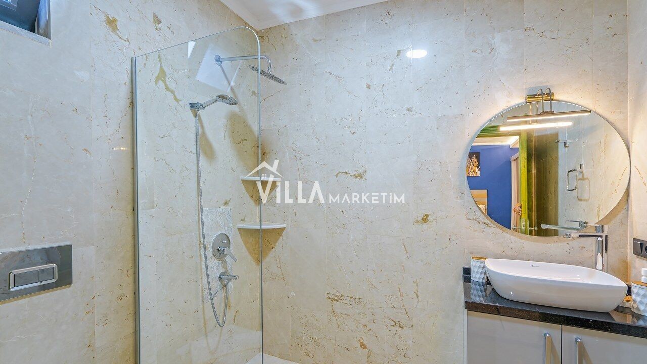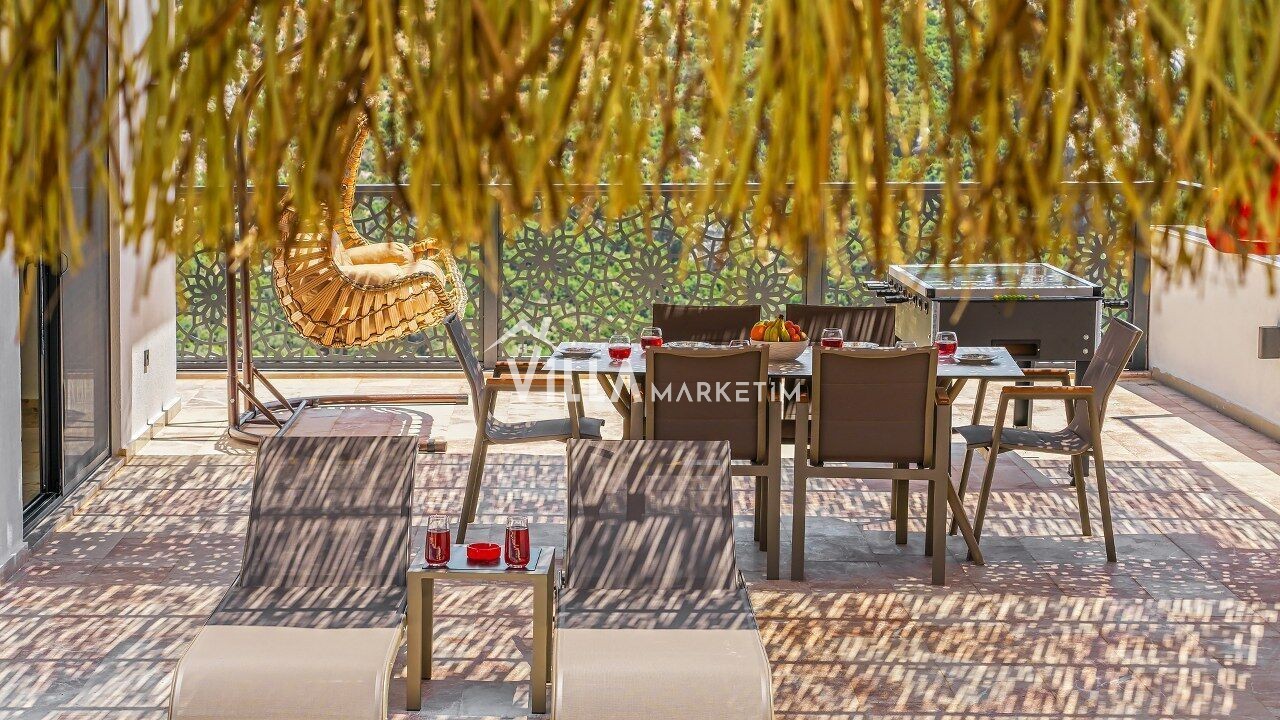 Özel Bahçe : Güneşlenme alanı, özel yüzme havuzu, 4 adet şezlong, 1 adet güneş şemsiyesi, 4 kişilik bahçe masası, sandalyeler , damla salıncak , oturma köşesi ve barbekü bulunmaktadır. Duş alanı mevcuttur.