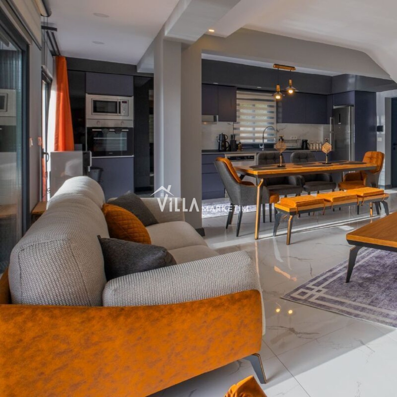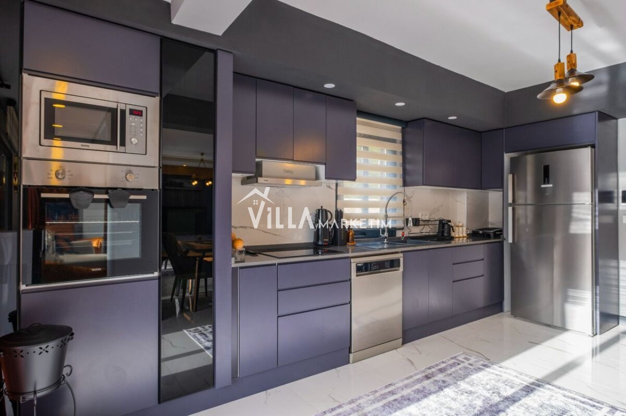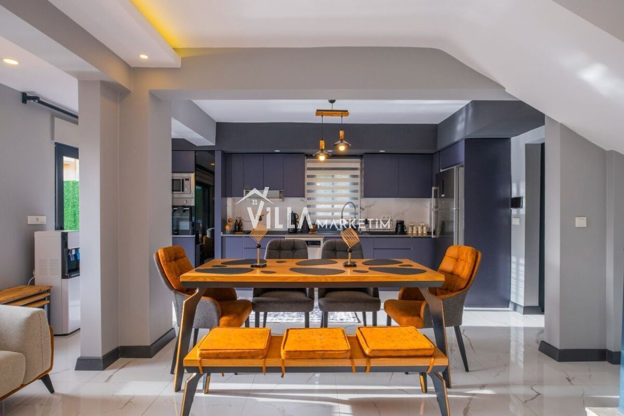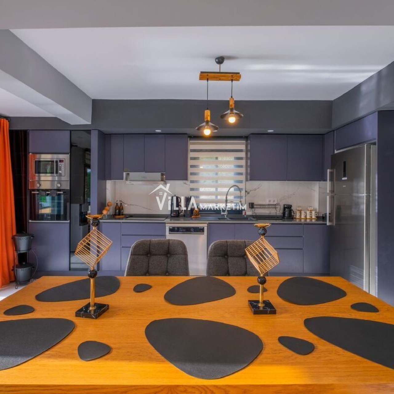 Mutfak : Modern Amerikan mutfak içerisinde, buzdolabı, bulaşık makinesi, çamaşır makinesi, kahve makinesi, çaycı, ocak, ankastre fırın, mikrodalga fırın, su sebili, tost makinesi, mutfak araç gereçleri (tencere, tava, bardak, çatal&bıçak takımı, yemek takımı), yemek masası ve sandalyeleri, havuz terasına çıkış bulunmaktadır.