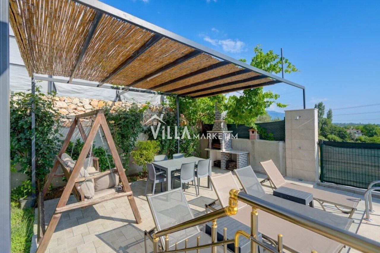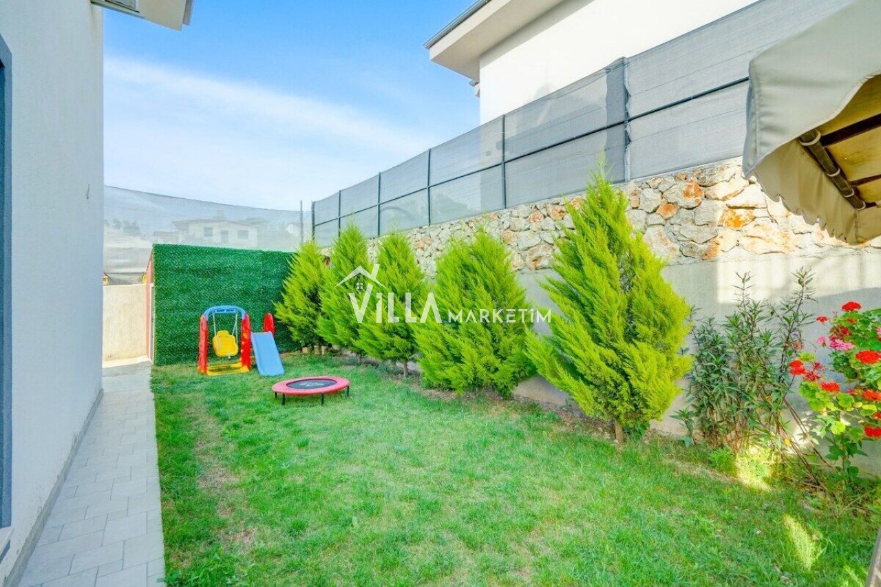 Bahçe: Müstakil bahçe içerisinde özel yüzme havuzu, şezlonglar, barbekü, salıncak ve yemek masası bulunmaktadır.