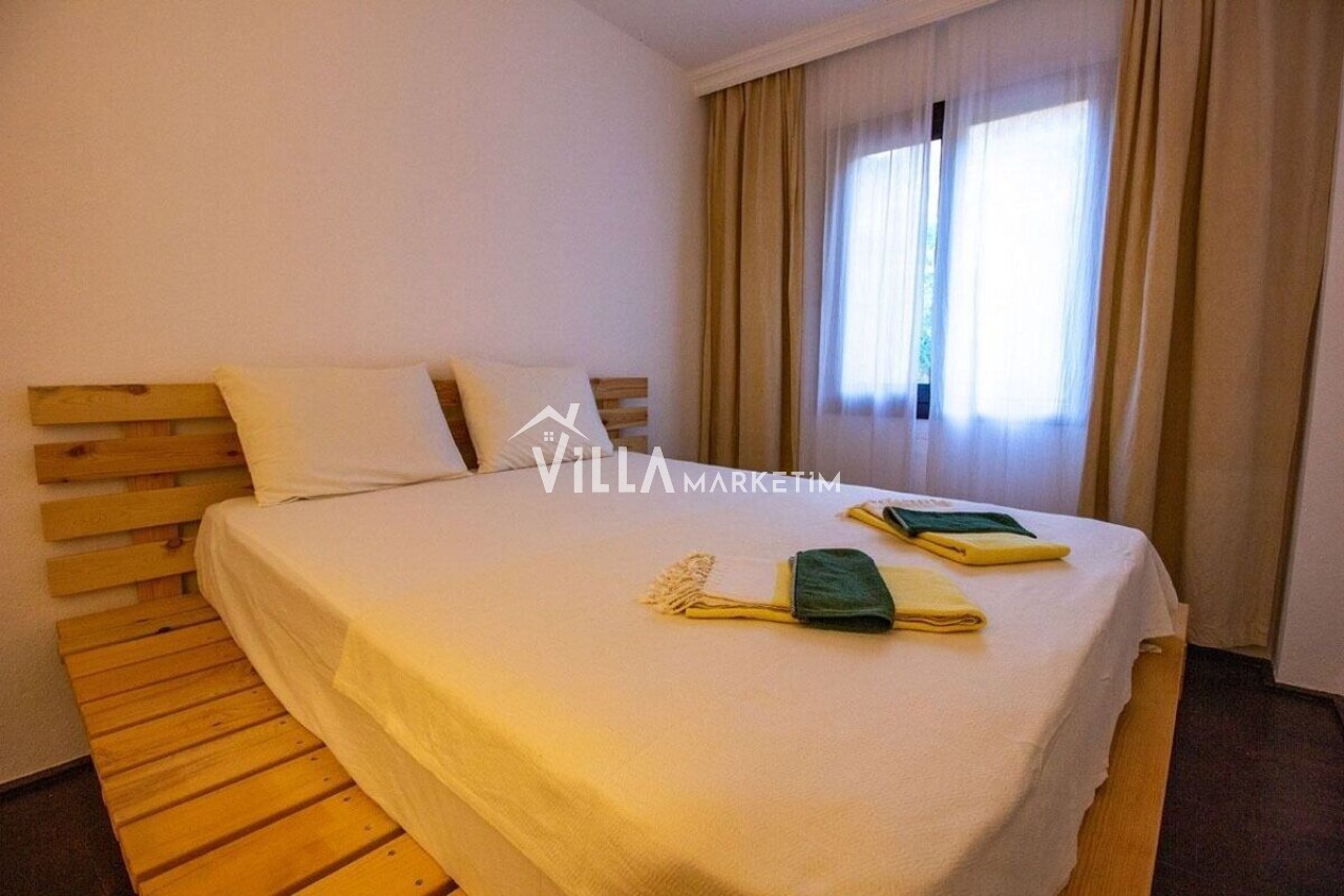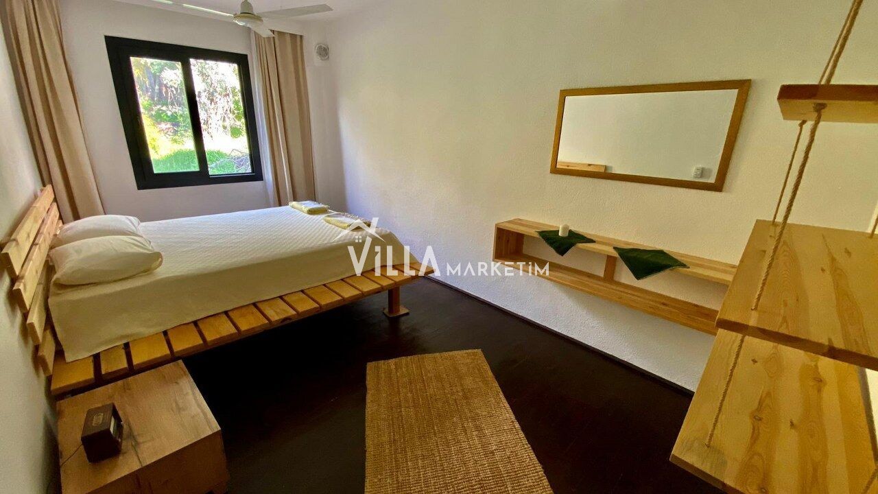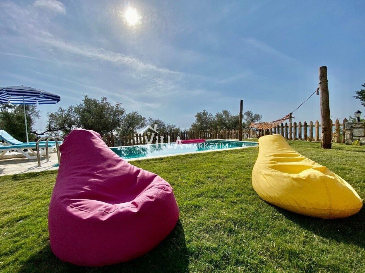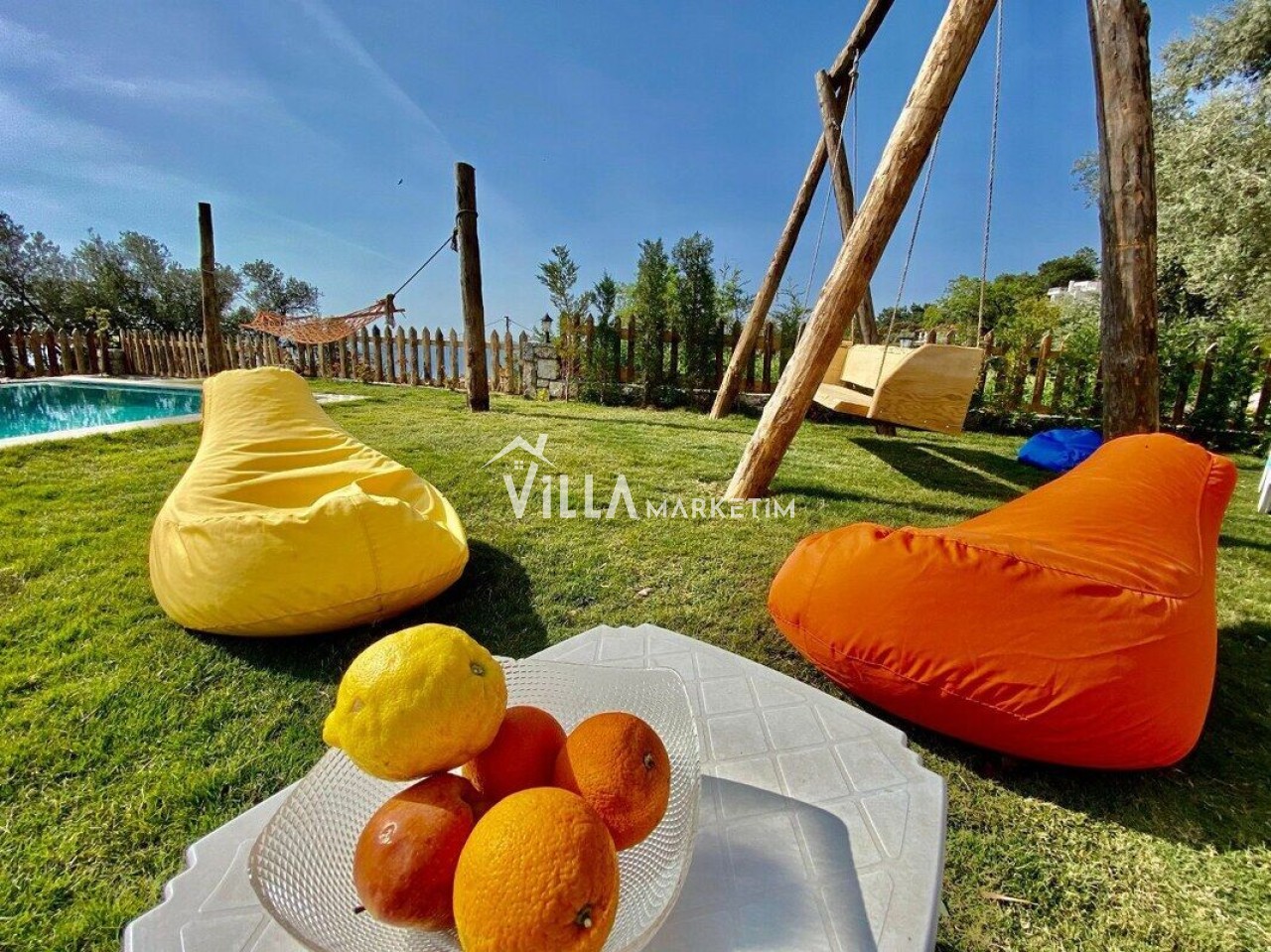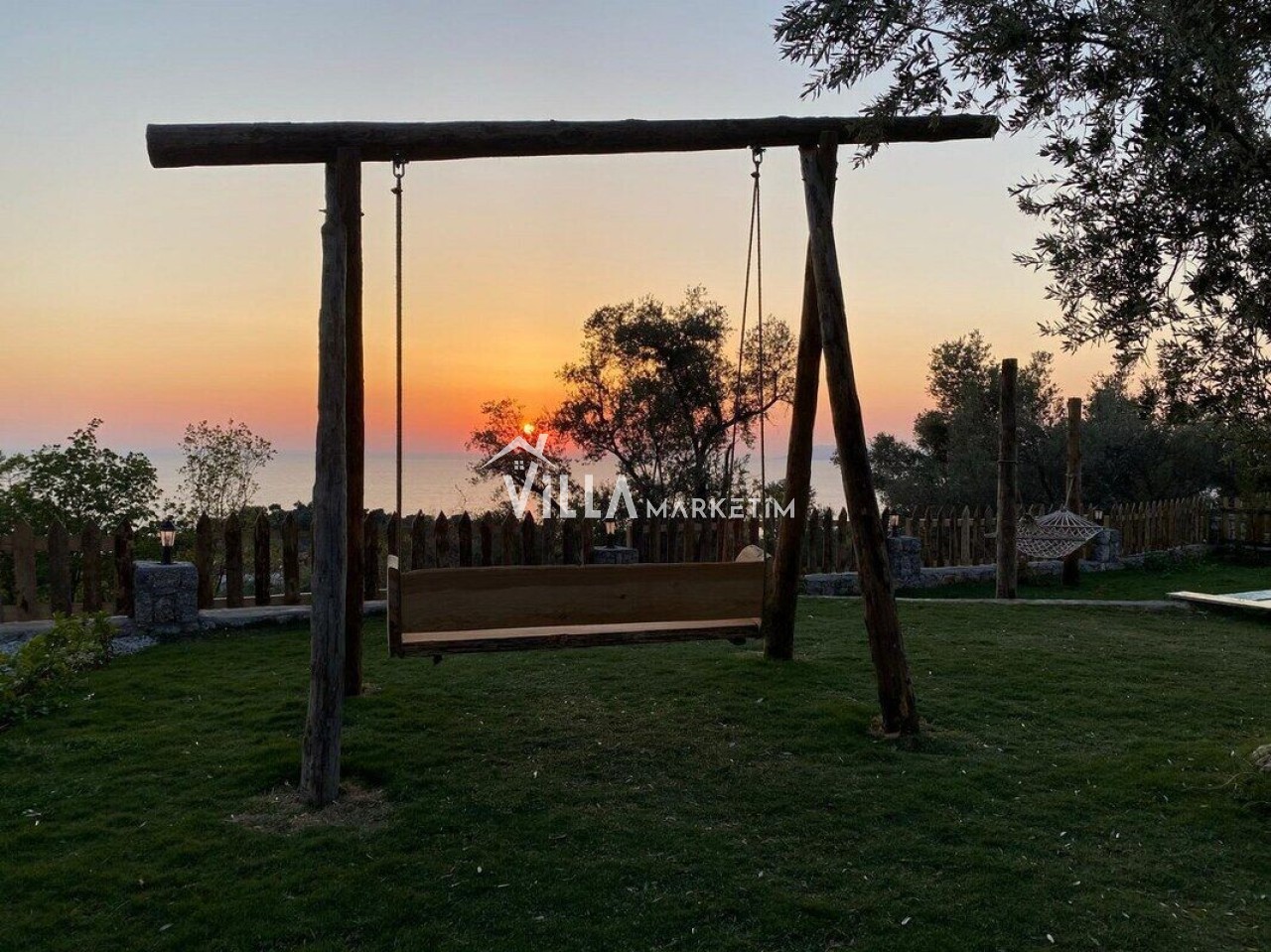 Bahçe : Deniz manzaralı bahçede, 4 adet şezlong, güneş şemsiyesi, sedir, hamak, barbekü, 8 kişilik yemek masası ve sandalyeler bulunmaktadır.