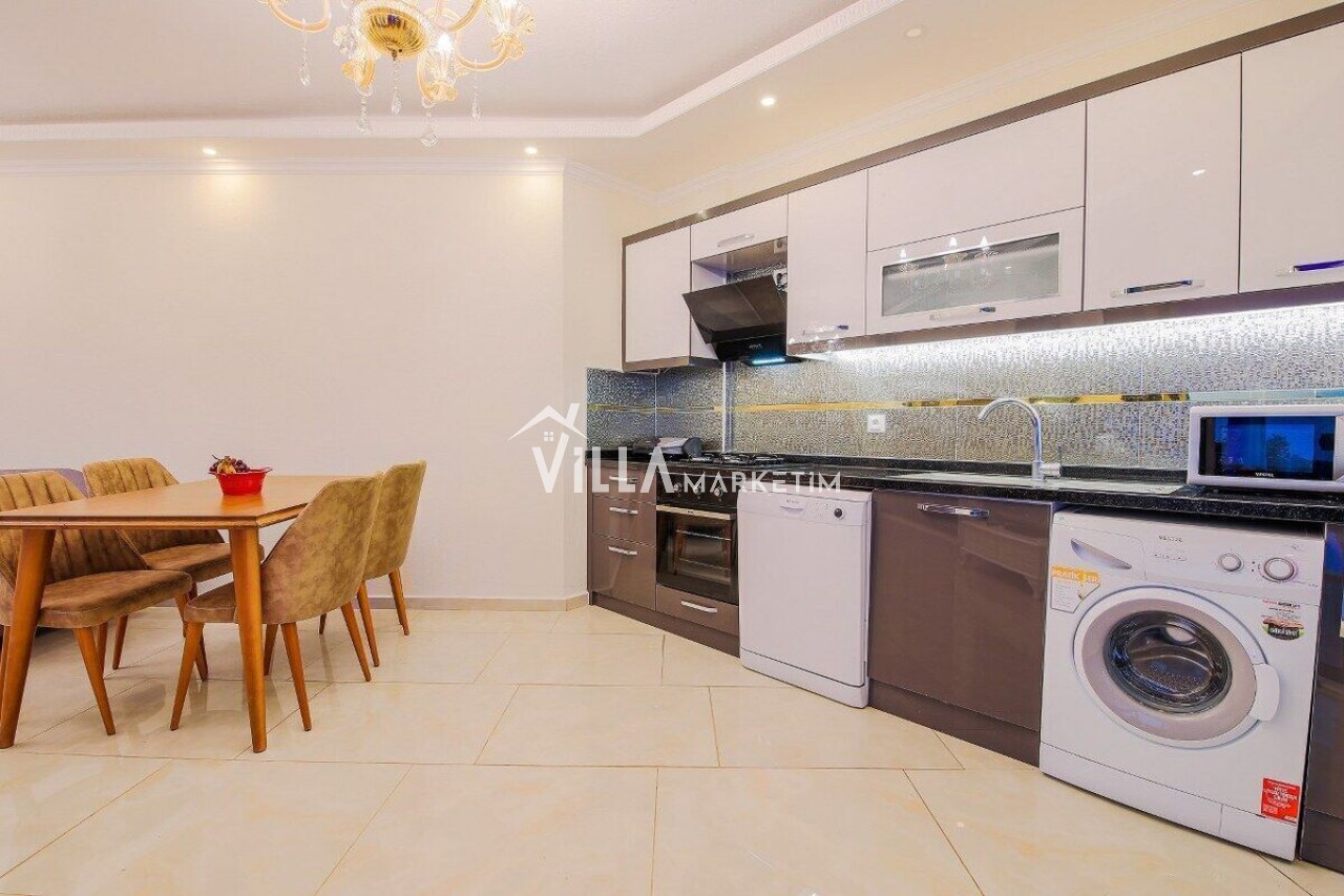 Mutfak : Modern Amerikan mutfak içerisinde buzdolabı, bulaşık makinesi, çamaşır makinesi, ankastre 4’lü ocak, tost makinesi, çay makinesi, fırın, tava tencere takımı, çatal bıçak takımı, su ve çay bardağı takımları yer almaktadır.