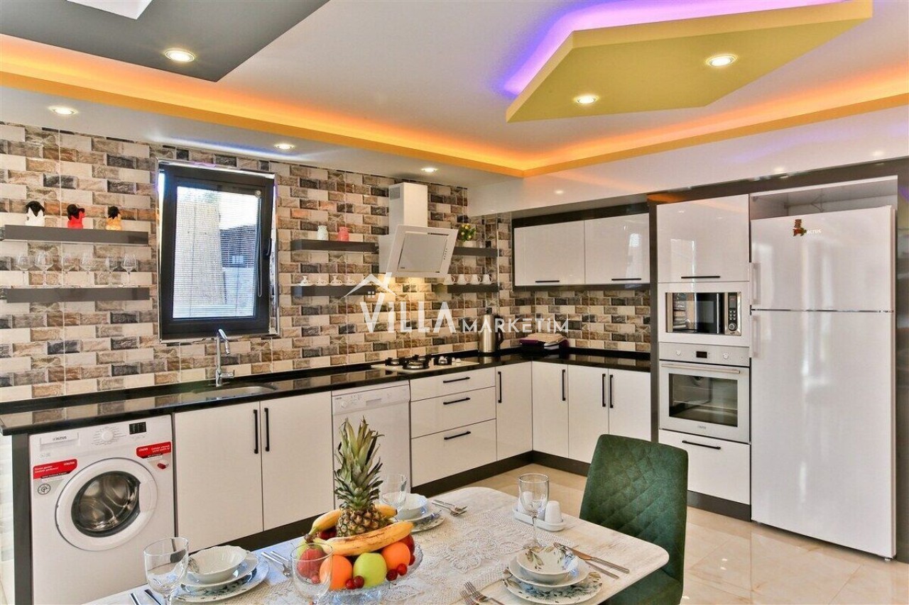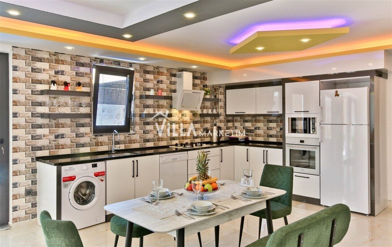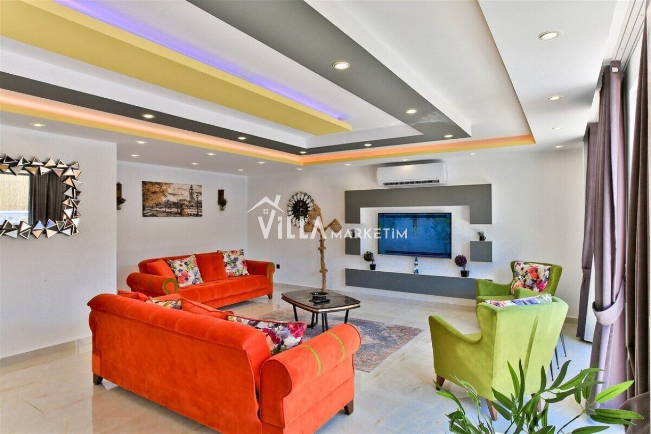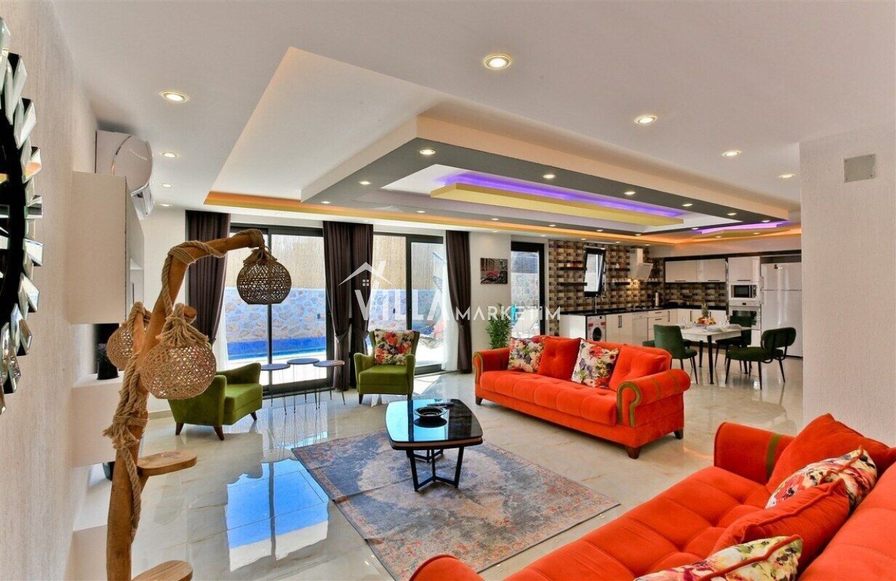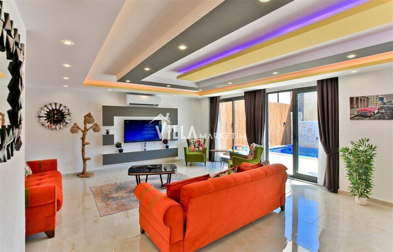 Salon : Salon içerisinde modern oturma grubu, berjer, orta sehpa, yemek masası ve sandalyeleri, uydu alıcı, LCD TV, internet için modem, klima ve havuz terasına çıkış bulunmaktadır.