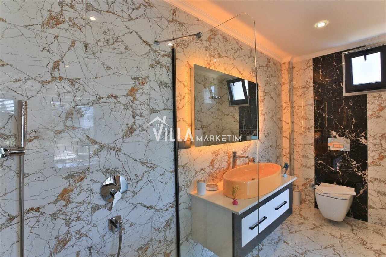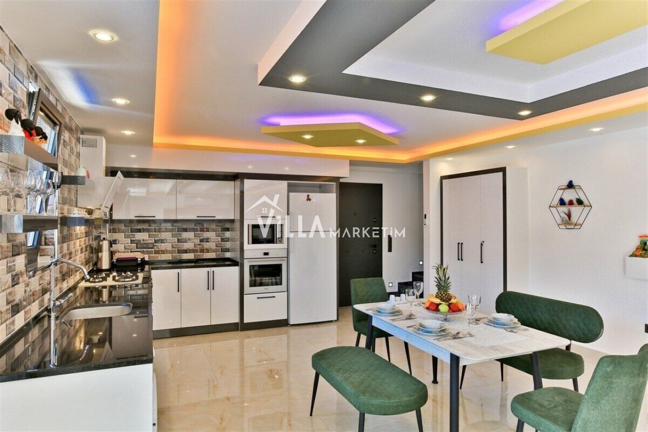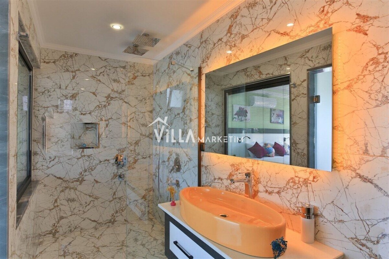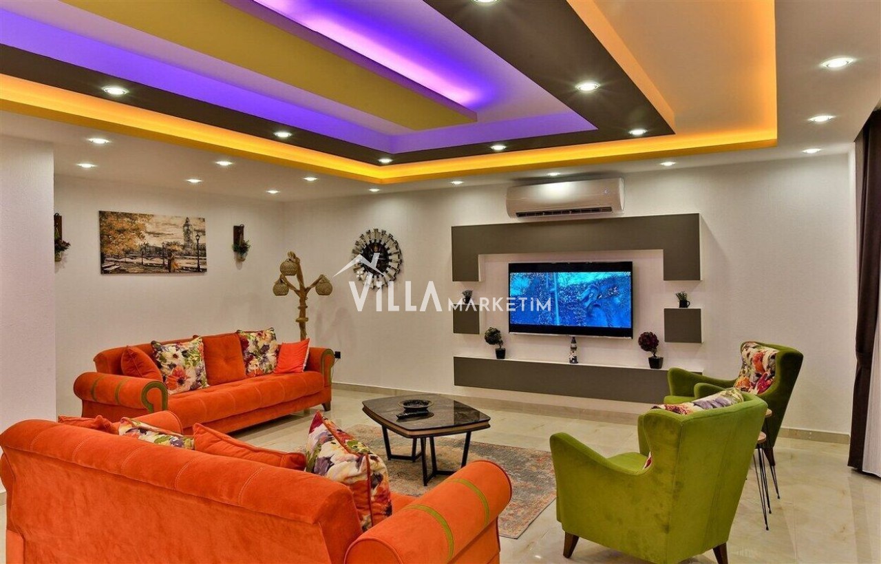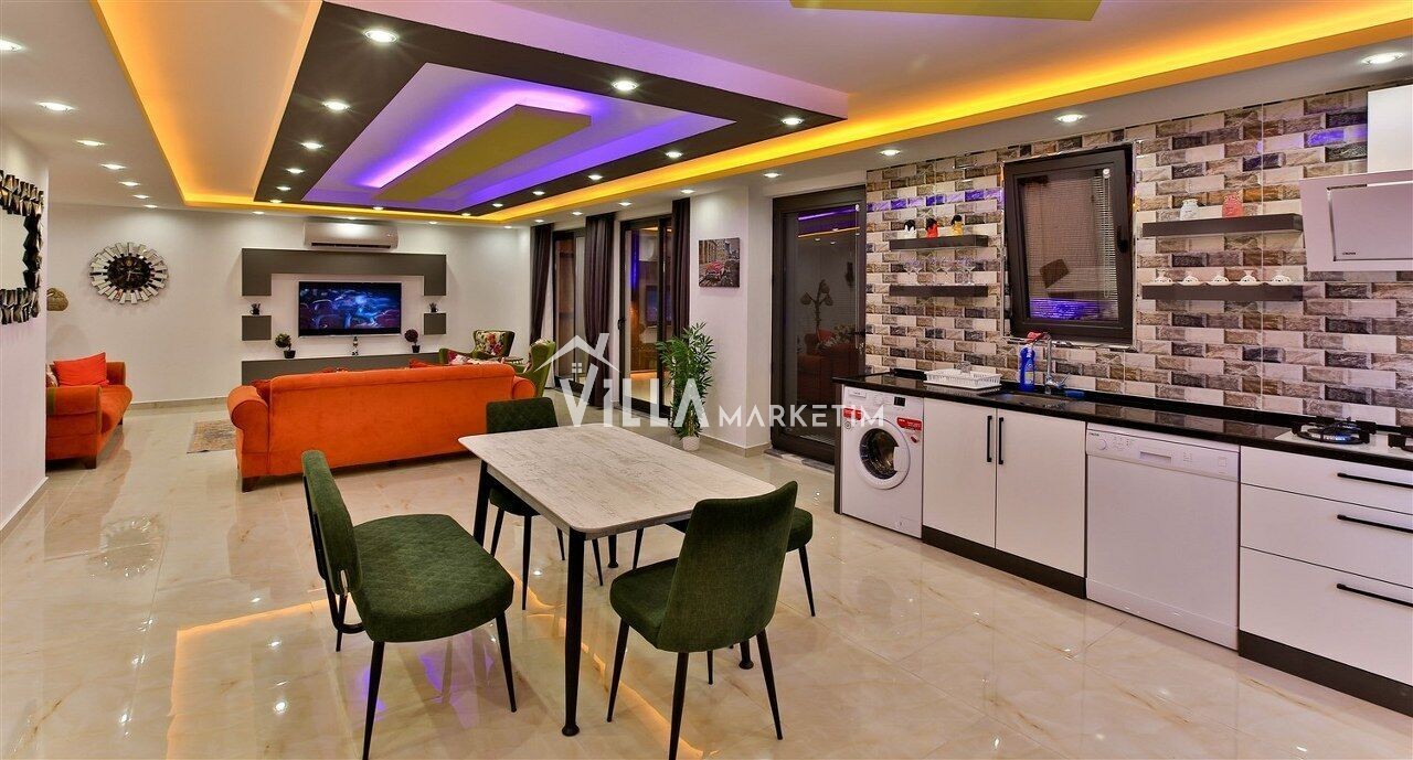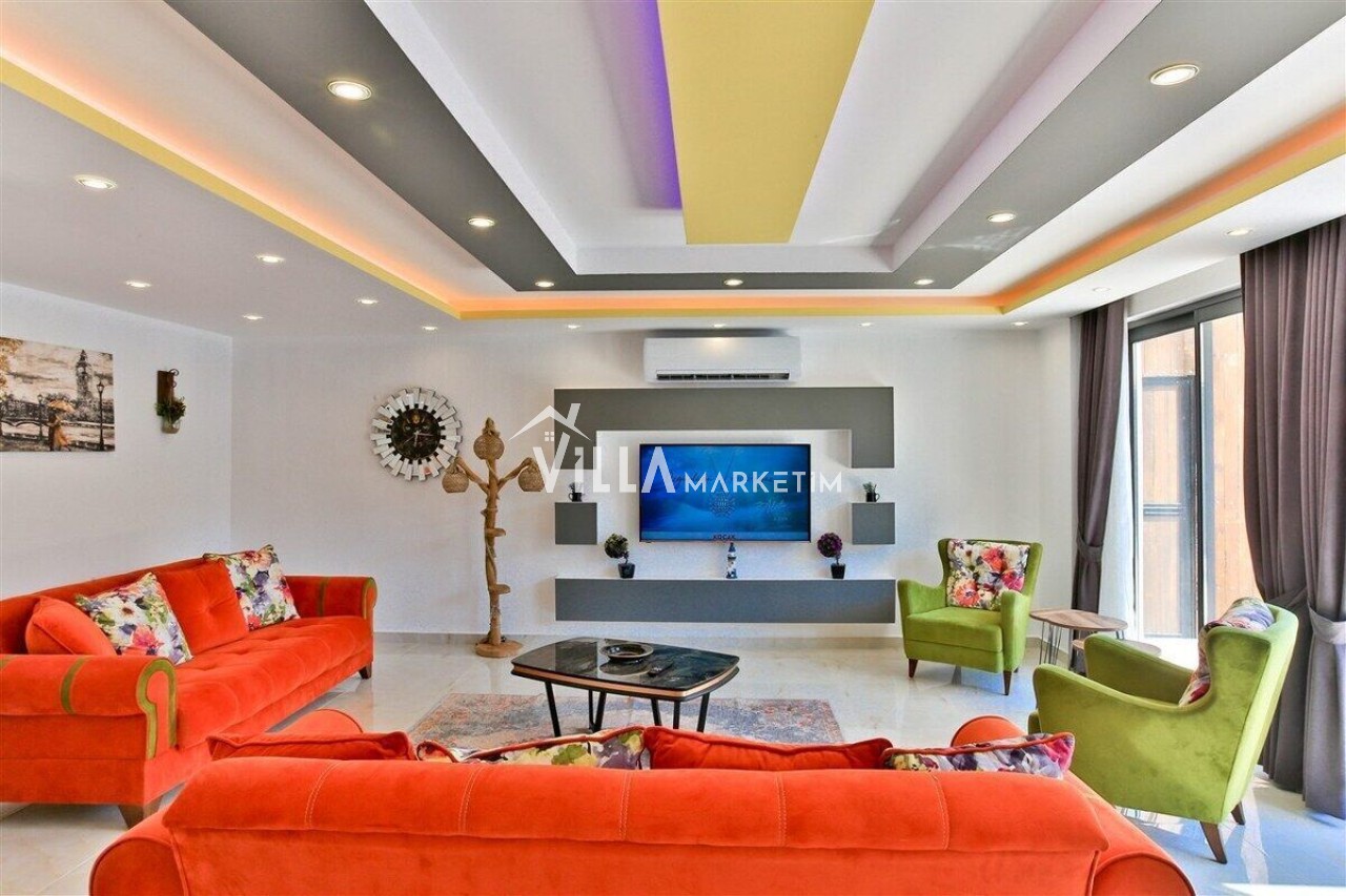 Salon : Salon içerisinde modern oturma grubu, berjer, orta sehpa, yemek masası ve sandalyeleri, uydu alıcı, LCD TV, internet için modem, klima ve havuz terasına çıkış bulunmaktadır.