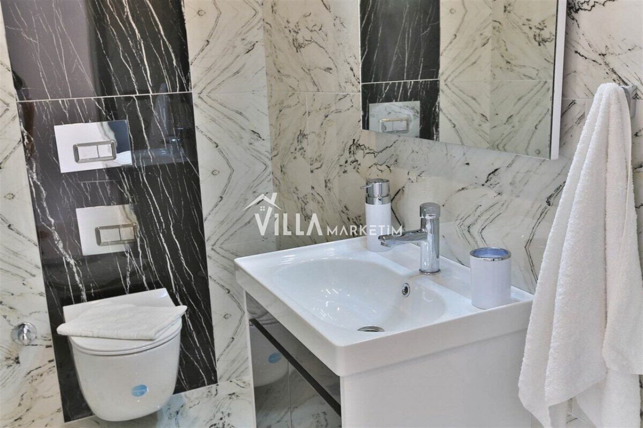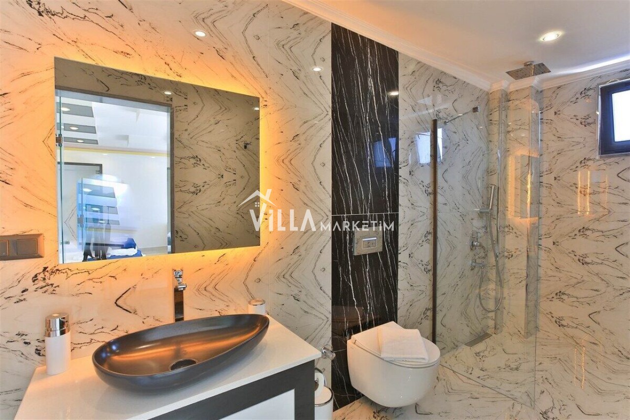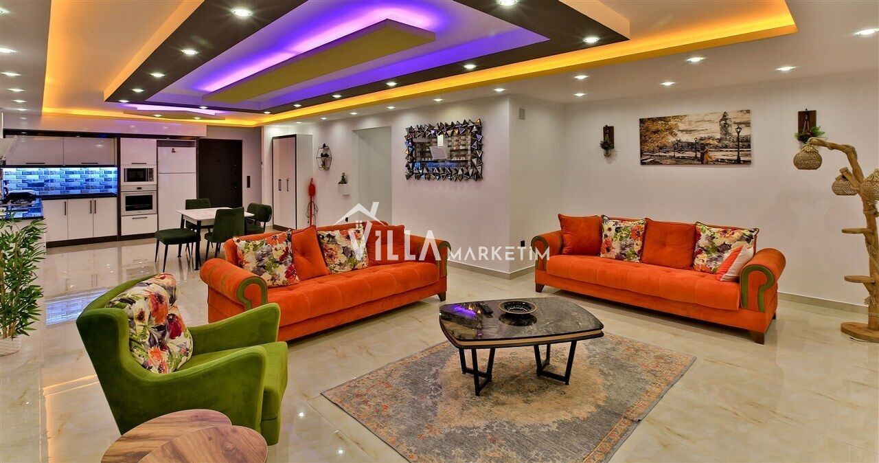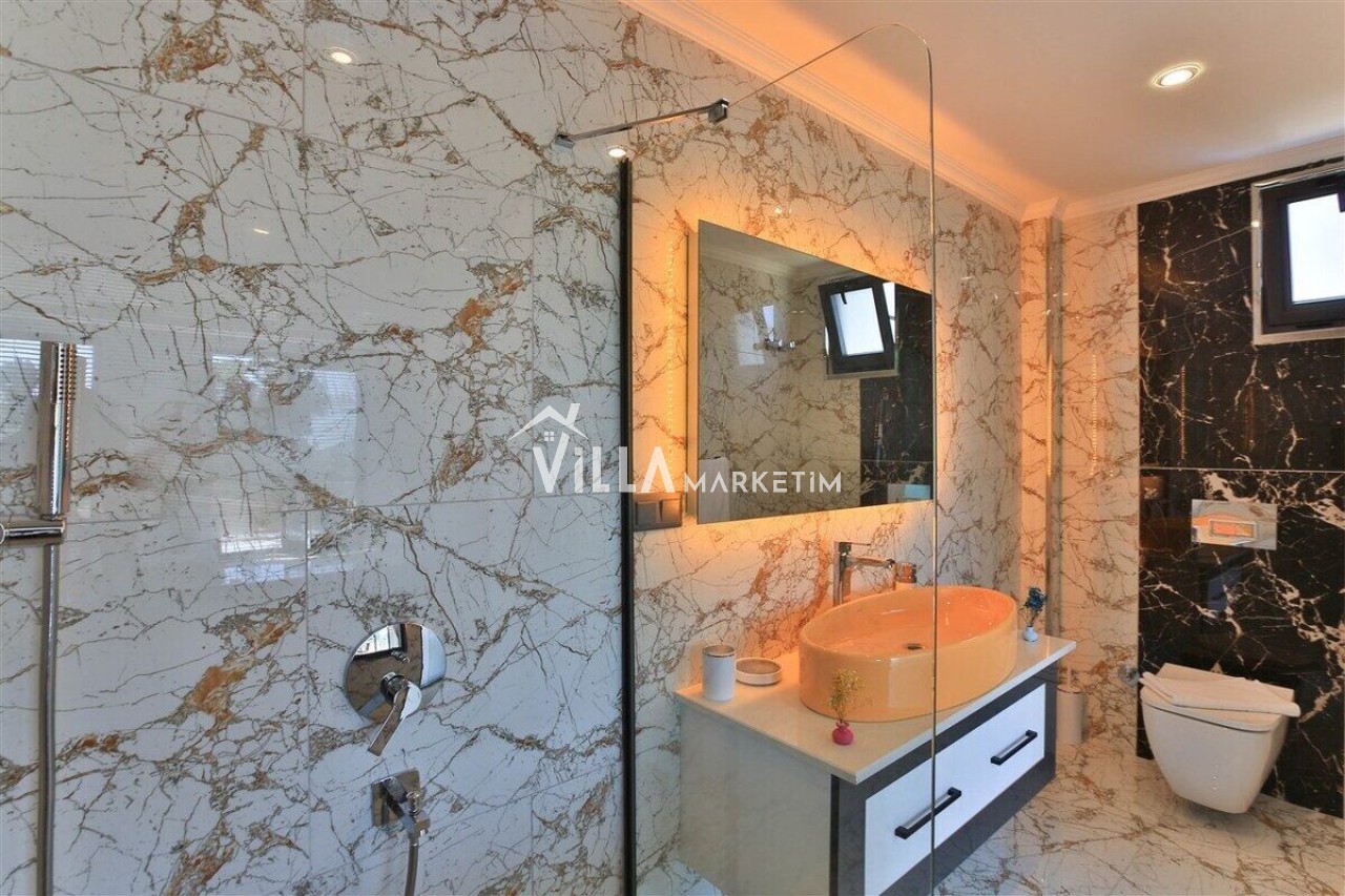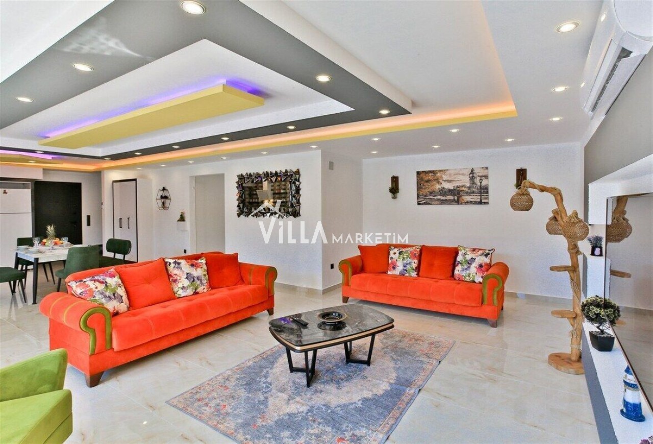 Salon : Salon içerisinde modern oturma grubu, berjer, orta sehpa, yemek masası ve sandalyeleri, uydu alıcı, LCD TV, internet için modem, klima ve havuz terasına çıkış bulunmaktadır.