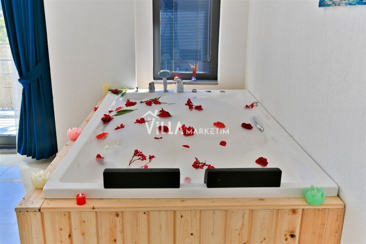 Bahçe : Bahçe içerisinde korunaklı özel yüzme havuzu, güneşlenme terası, oturma grubu, 4 kişilik masa ve sandalye, salıncak, langırt, çocuk oyun parkı, barbekü, şezlong ve şemsiye bulunmaktadır.