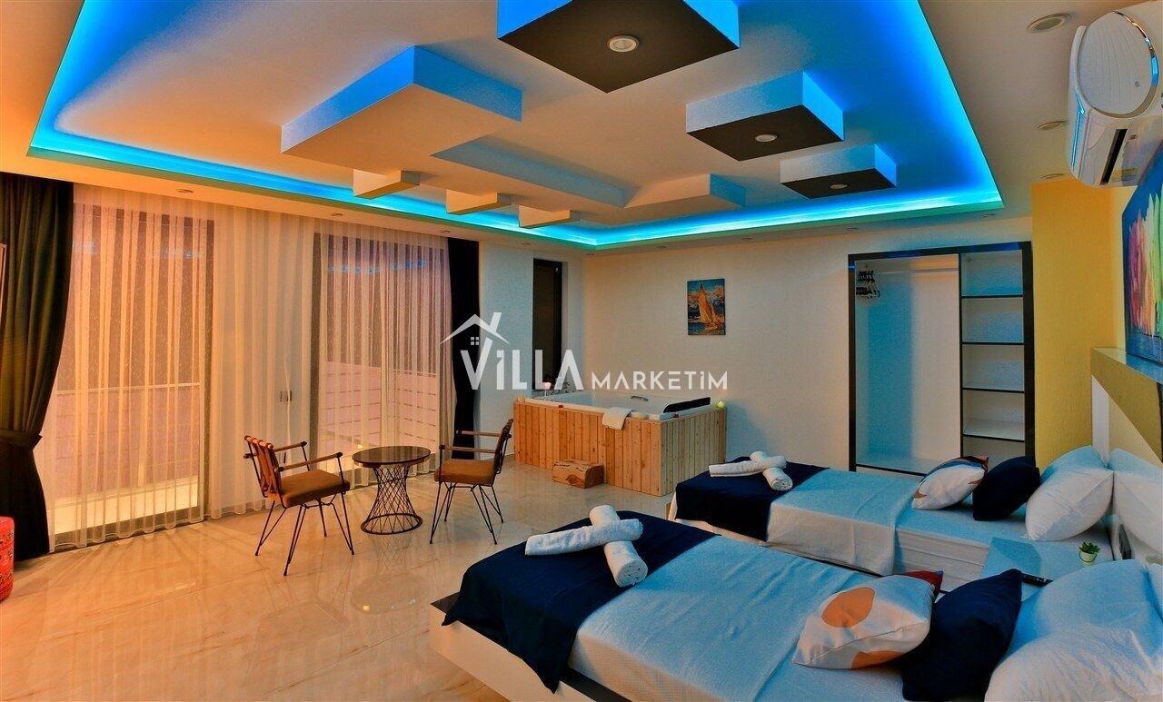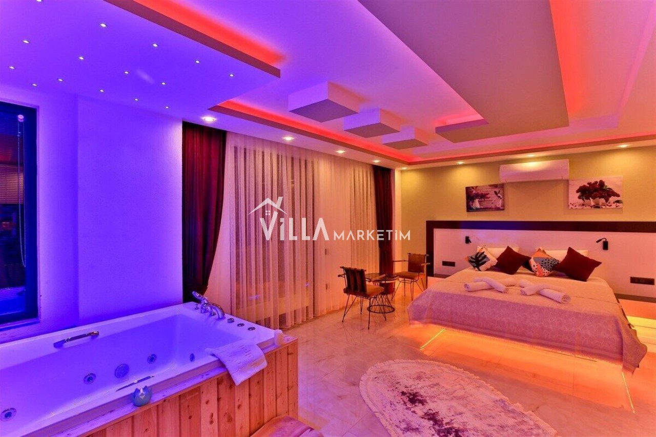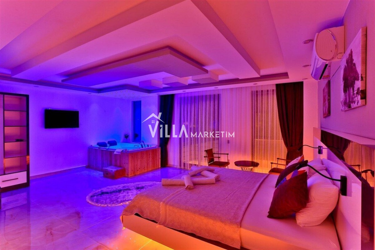 1. Yatak Odası: Suit aile yatak odası olup, 1 adet çift kişilik yatak, jakuzi, makyaj masası, TV, elbise dolabı, klima ve banyo/tuvalet, balkon (2 kişilik oturma grubu) bulunmaktadır.