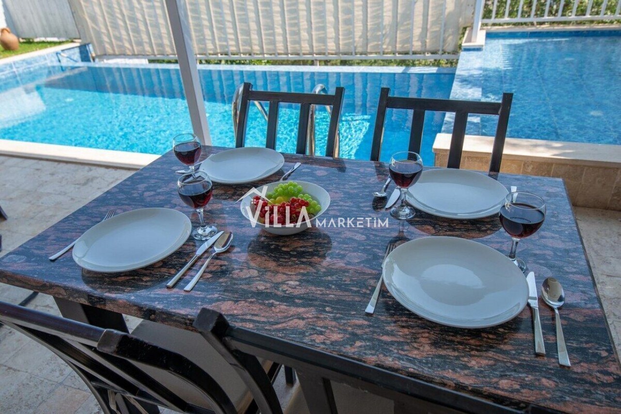 Havuz ve Bahçe : 7.5 x 3.5 metre ve 1.50 metre derinliğinde yüzme havuzu, şezlong, şemsiye, veranda, bahçe oturma grubu, salıncak, mangal, masa ve sandalye, Bahçe ve havuz bakımı günde 1 kez sabah yapılır.