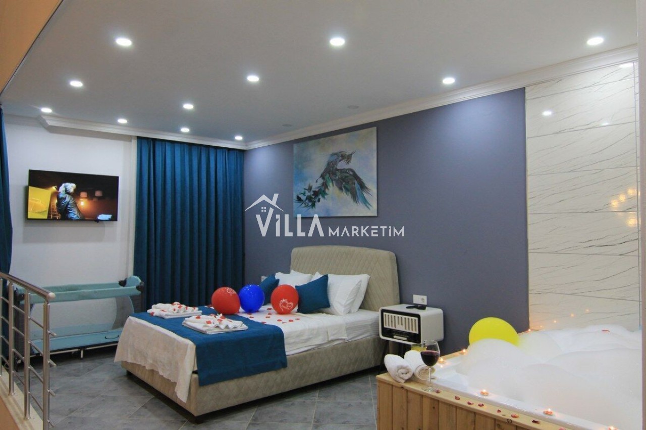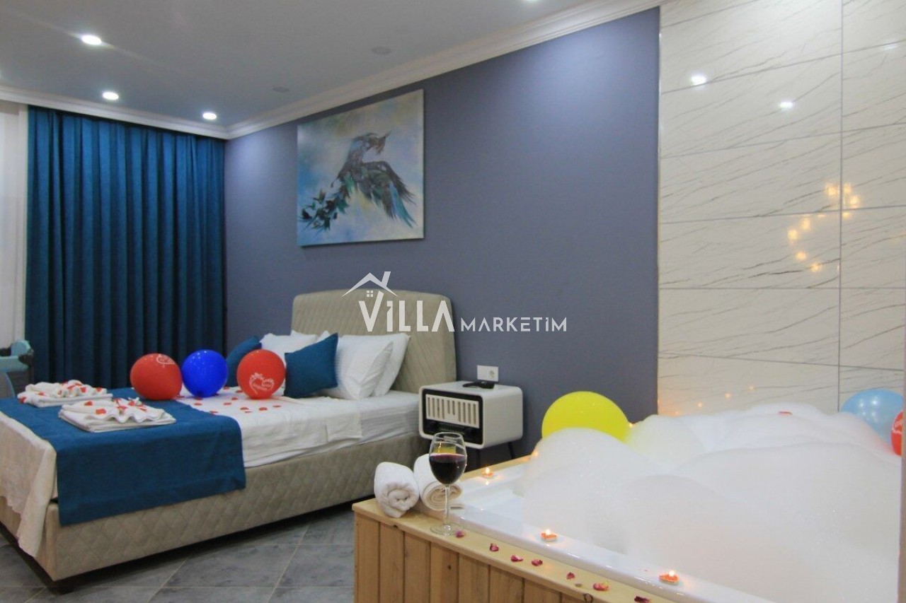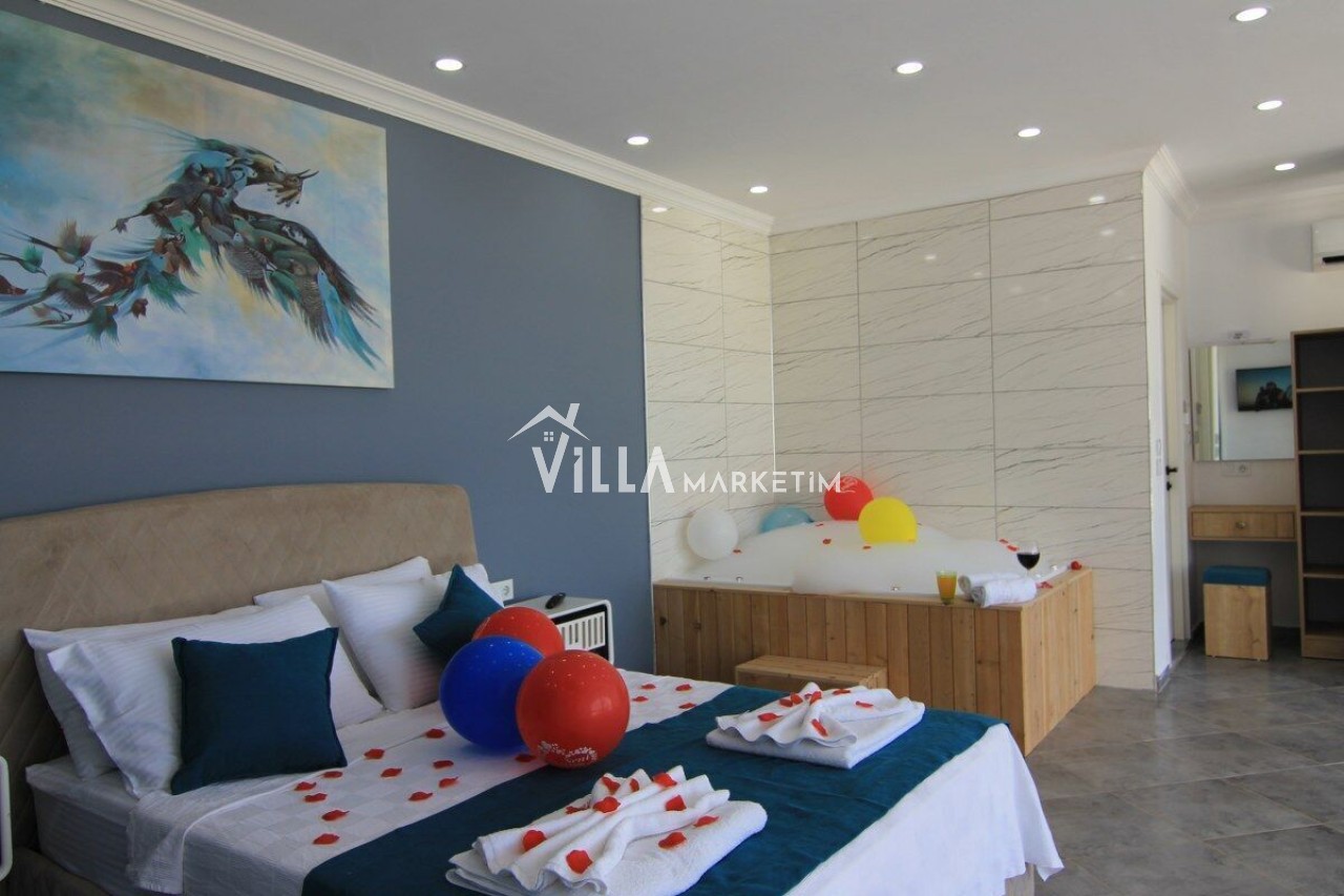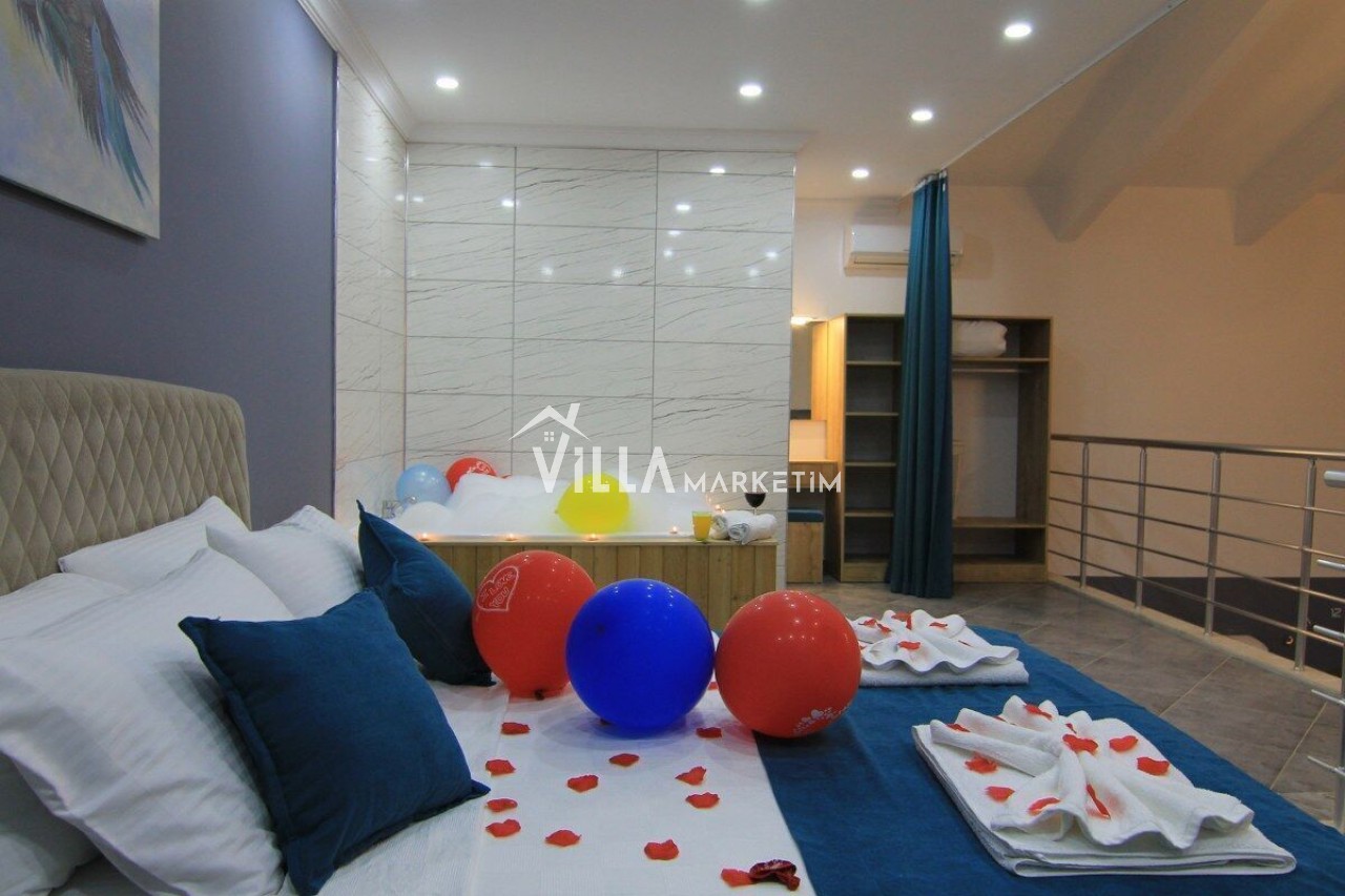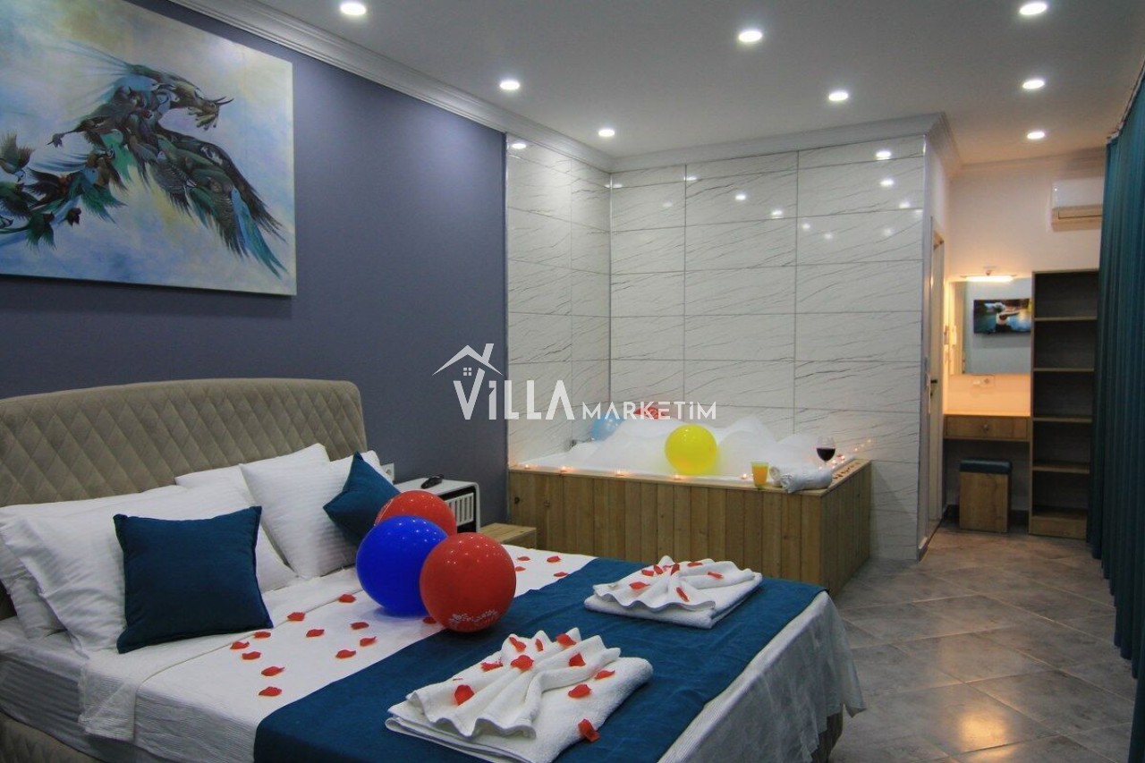 1. Yatak Odası : Süit odada çift kişilik yatak, klima, elbise dolabı, komodin, televizyon, jakuzi , banyo ve tuvalet bulunmaktadır. ( Asma katta bulunmaktadır. )