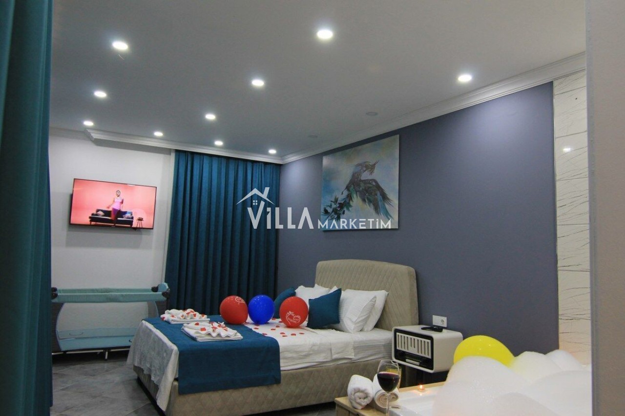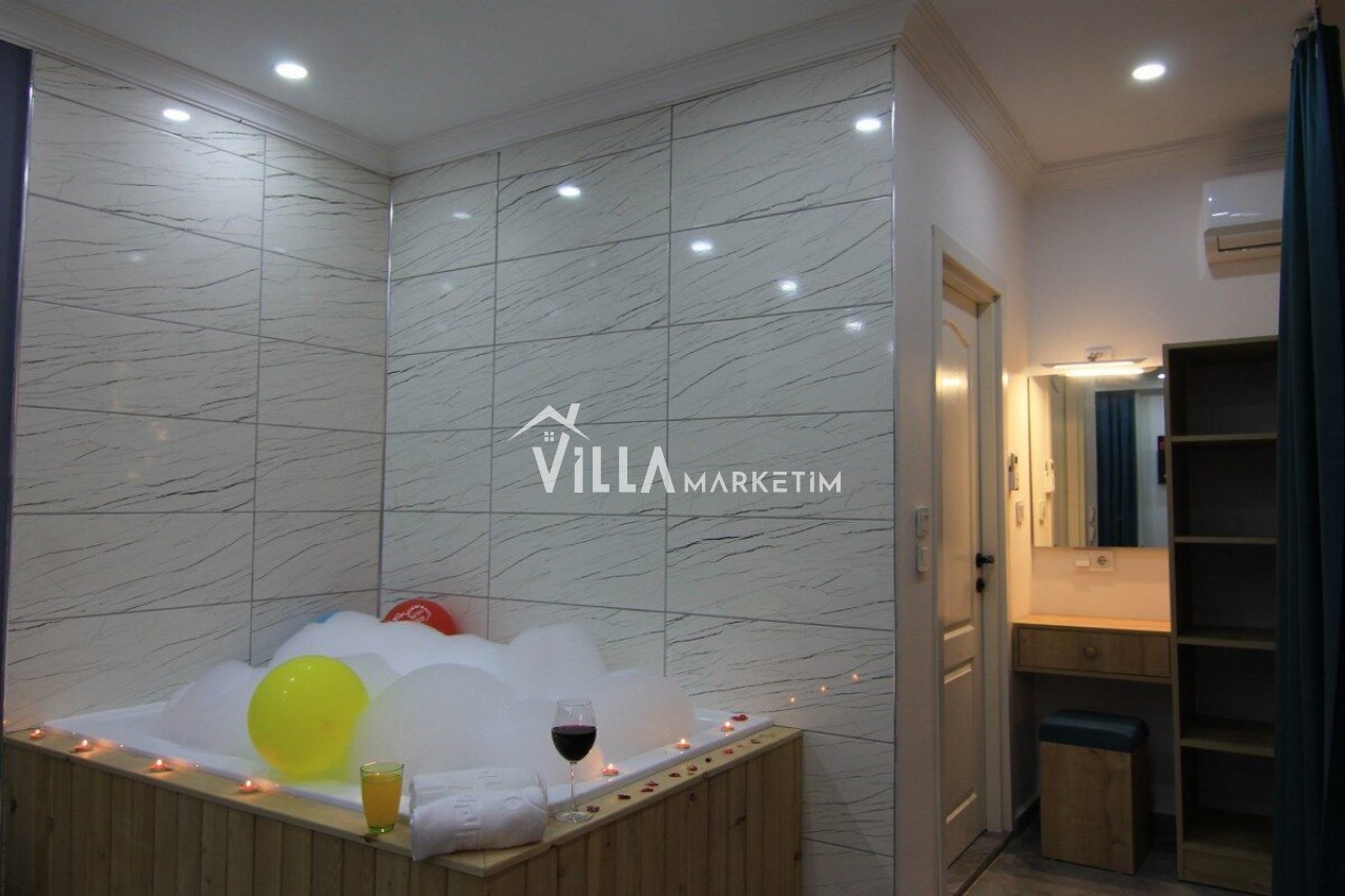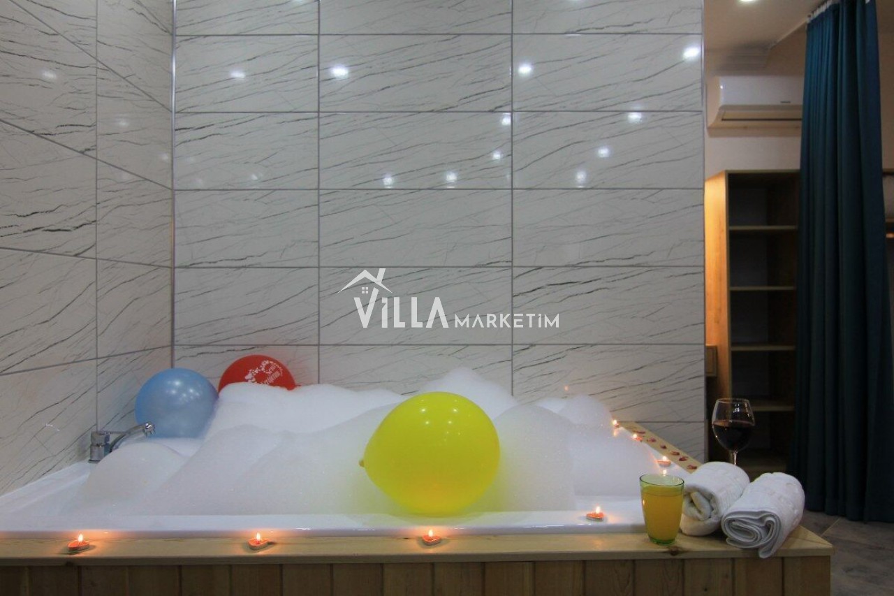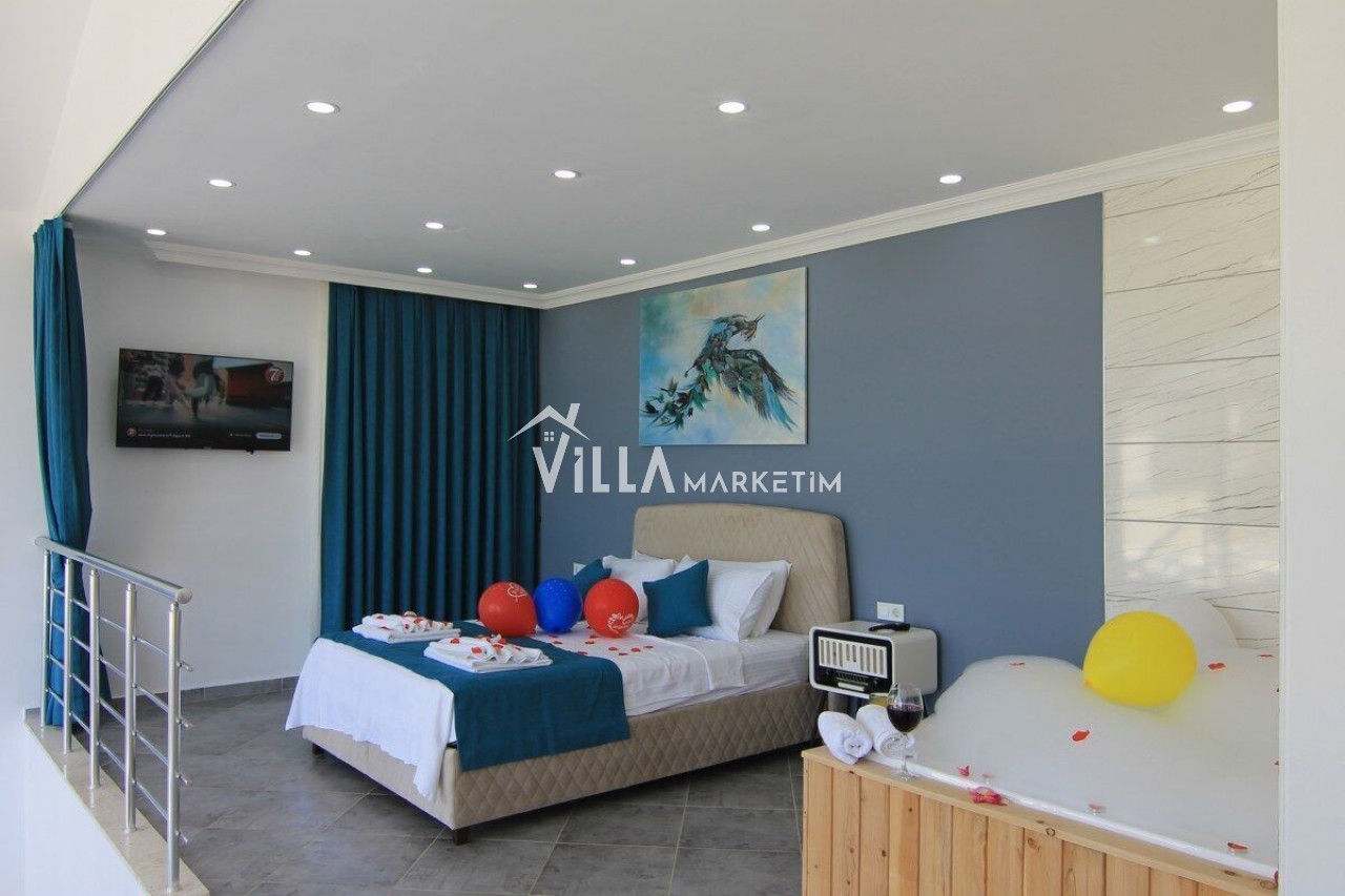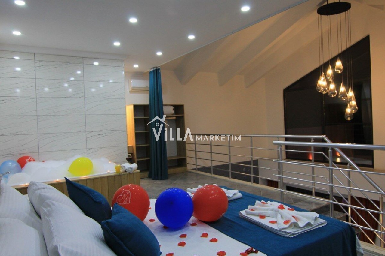 1. Yatak Odası : Süit odada çift kişilik yatak, klima, elbise dolabı, komodin, televizyon, jakuzi , banyo ve tuvalet bulunmaktadır. ( Asma katta bulunmaktadır. )