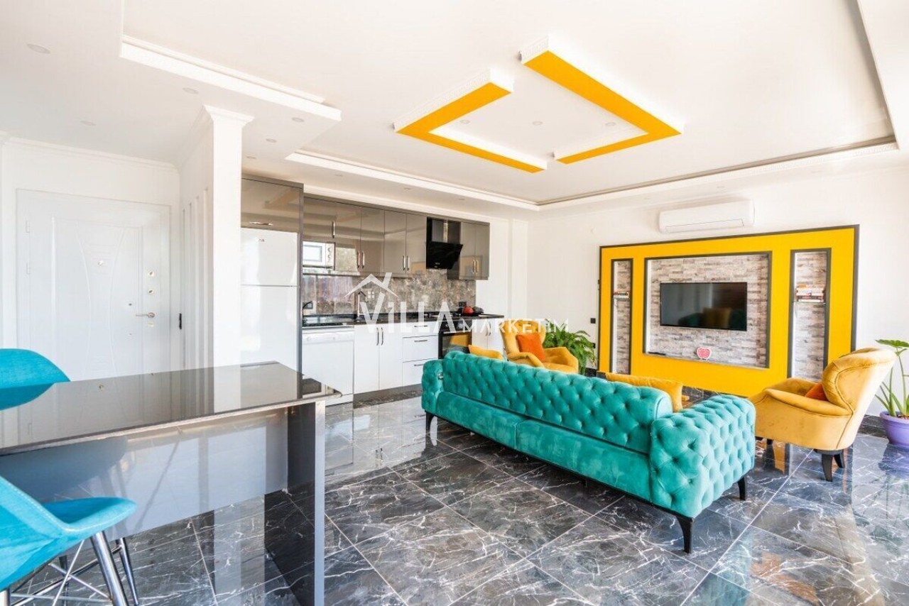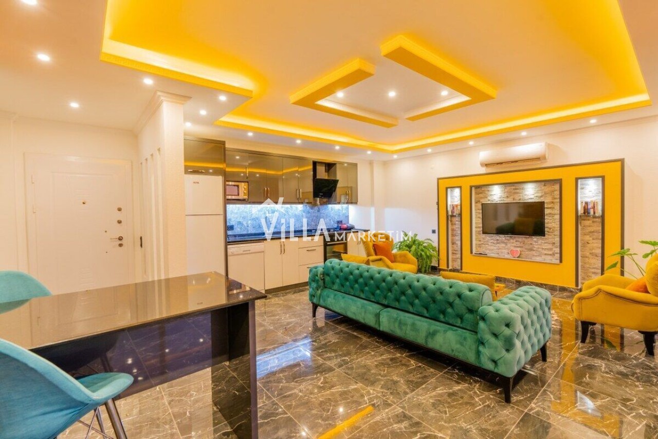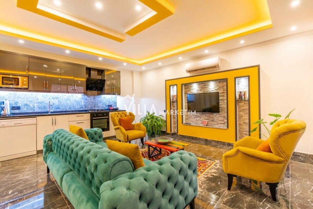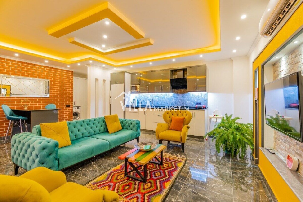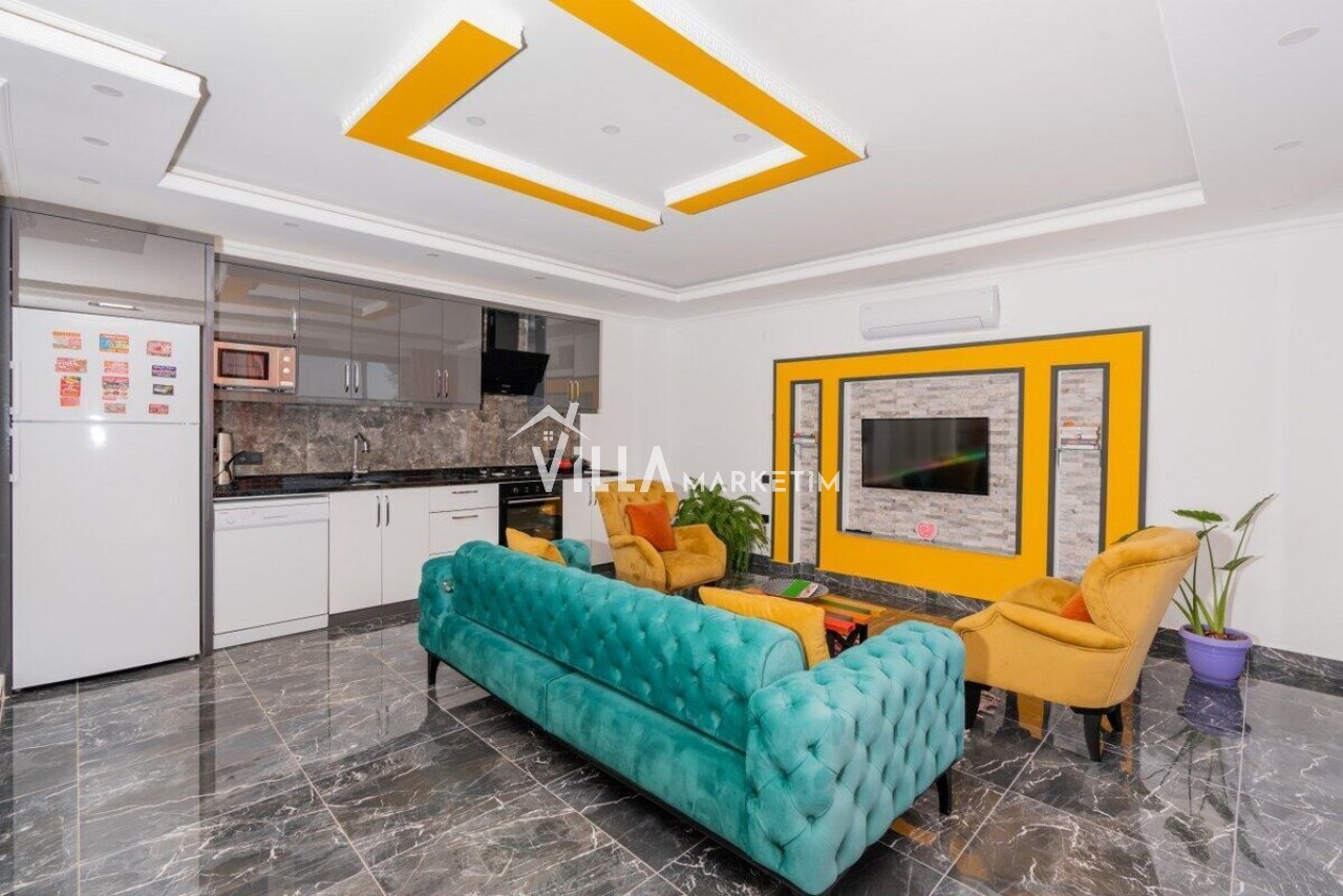 Salon : Modern oturma grubu, televizyon, uydu alıcısı, klima, oturma grubu, yemek masası ve sandalyeler bulunmaktadır.