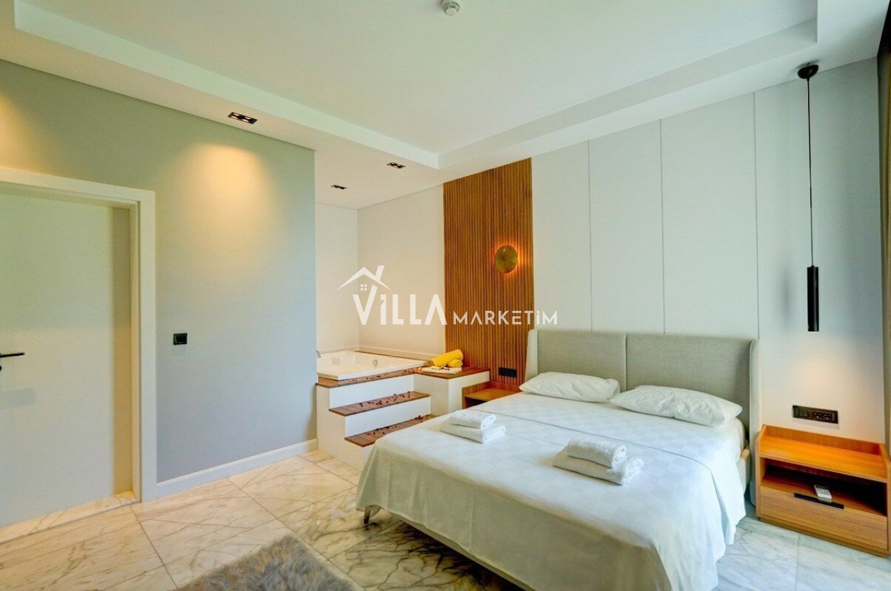 1. Yatak odası : Master suit yatak odası, 1 tane çift kişilik yatak, komodin, klima, elbise dolabı, jakuzi ve banyo / Wc yer almaktadır.