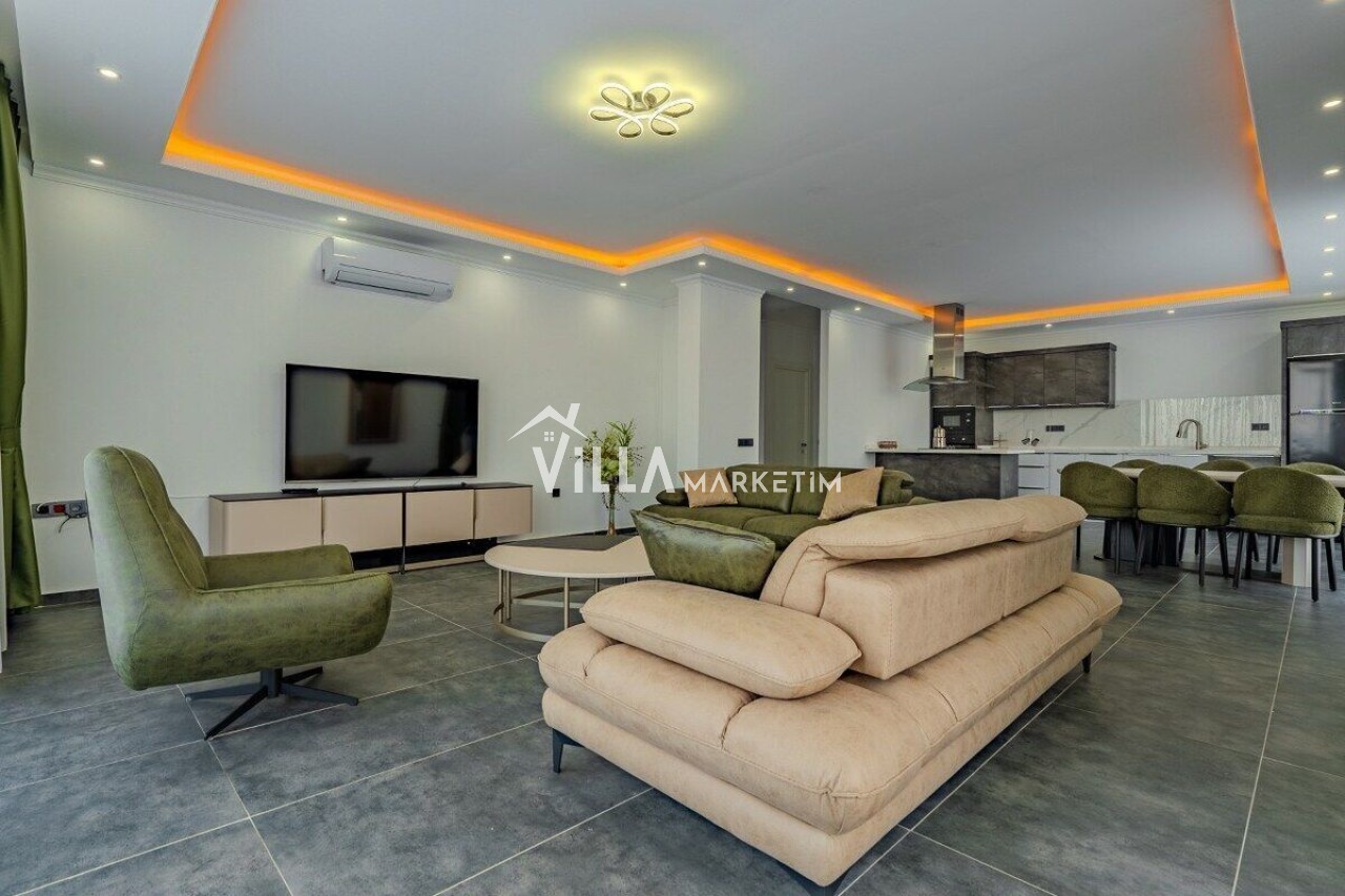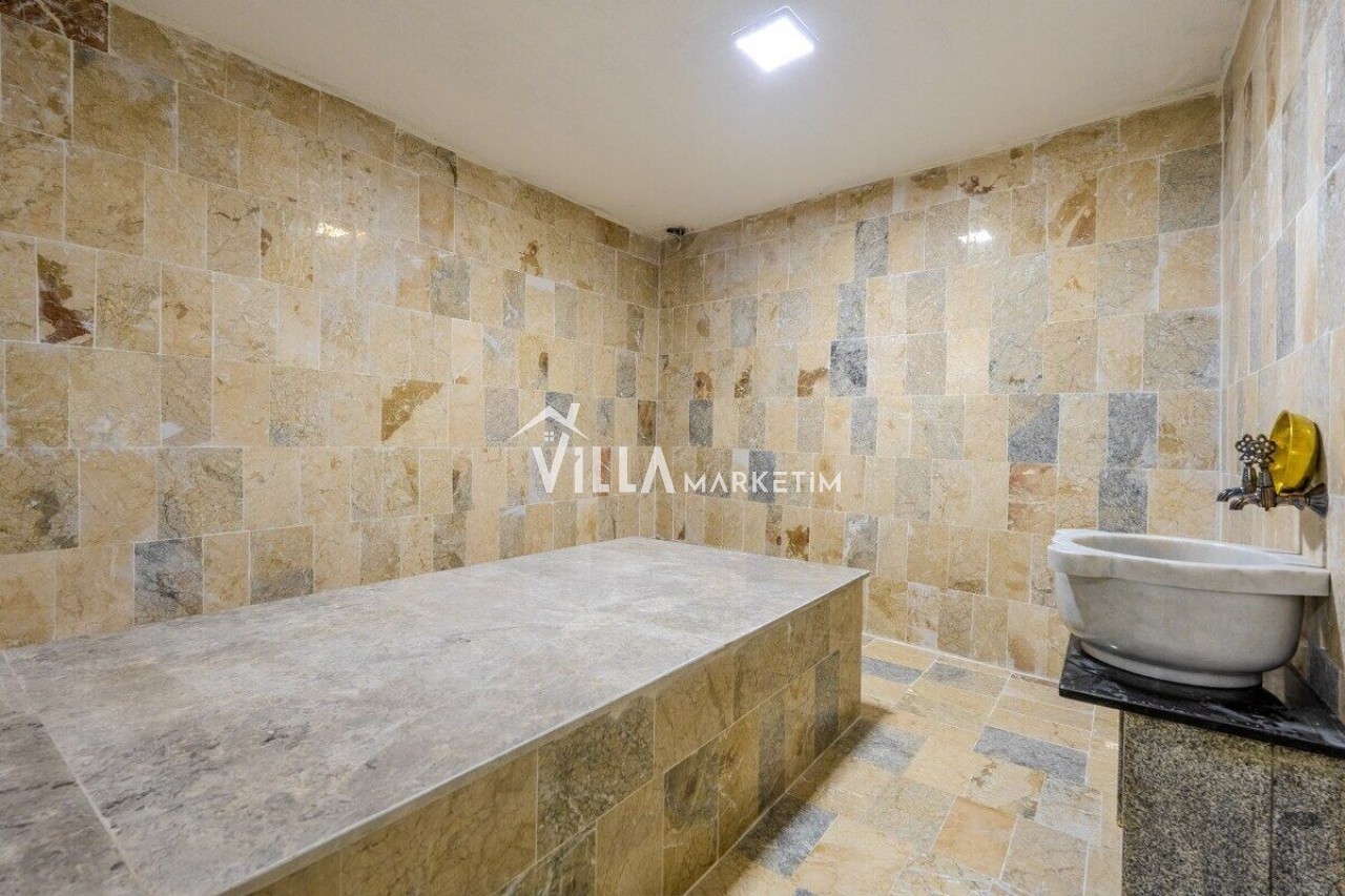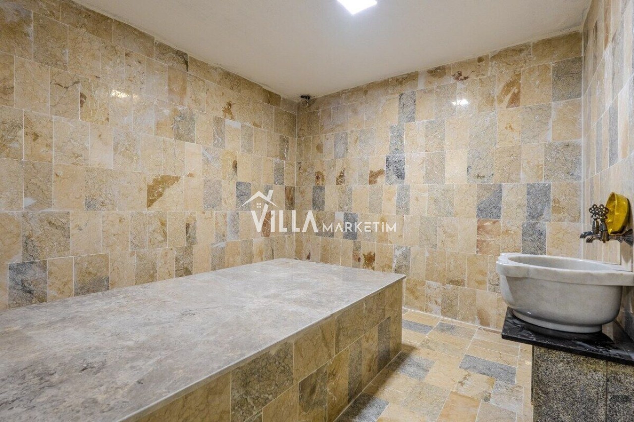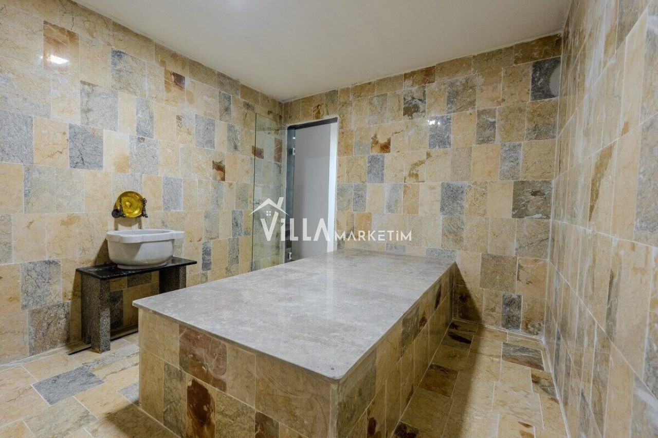 Salon : Modern ve lüks dizayna sahip salon içerisinde konforlu oturma grubu, TV, DVD oynatıcı, klima ve internet yer almaktadır. Salondan havuz terasına geçiş vardır.