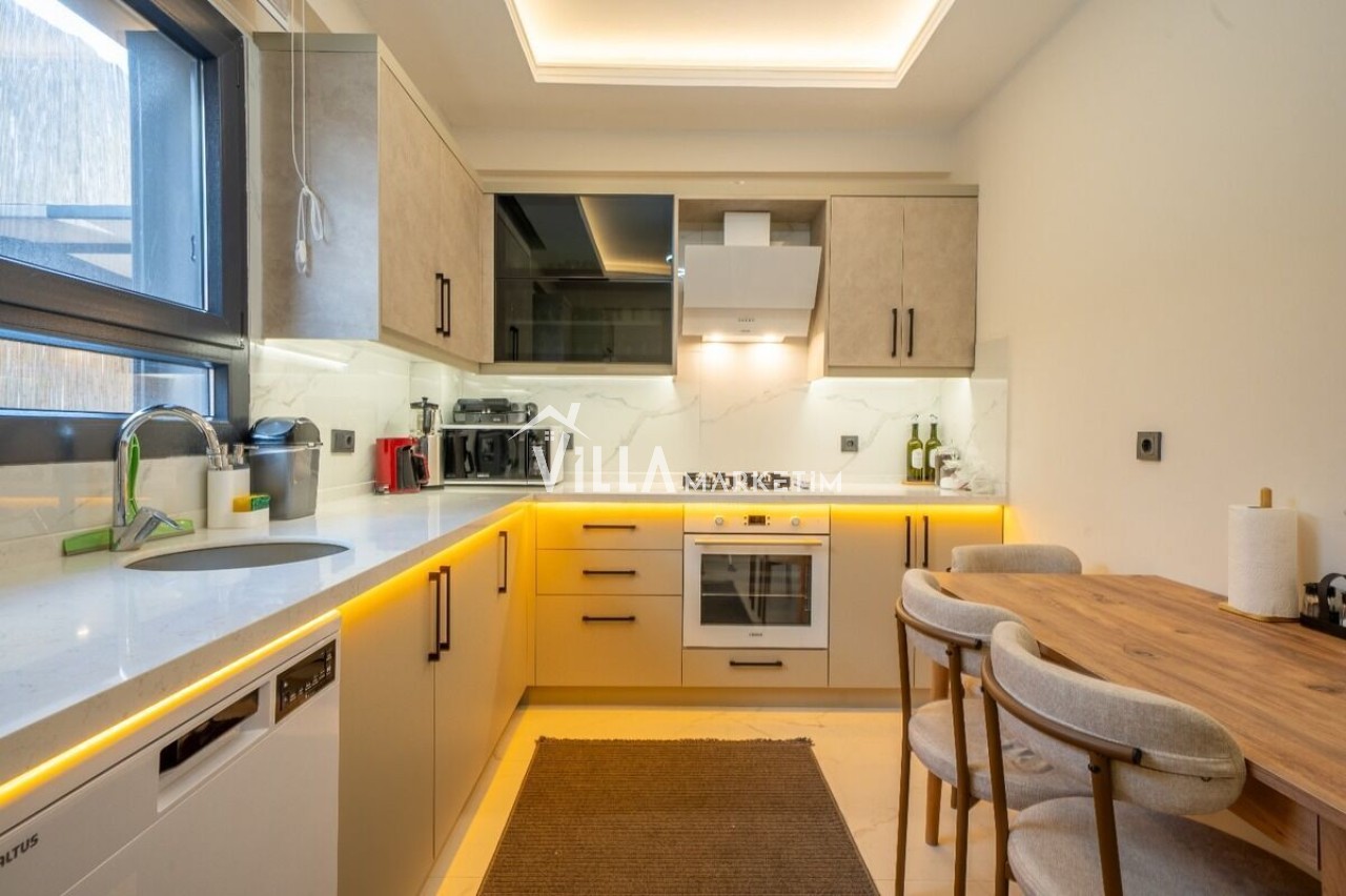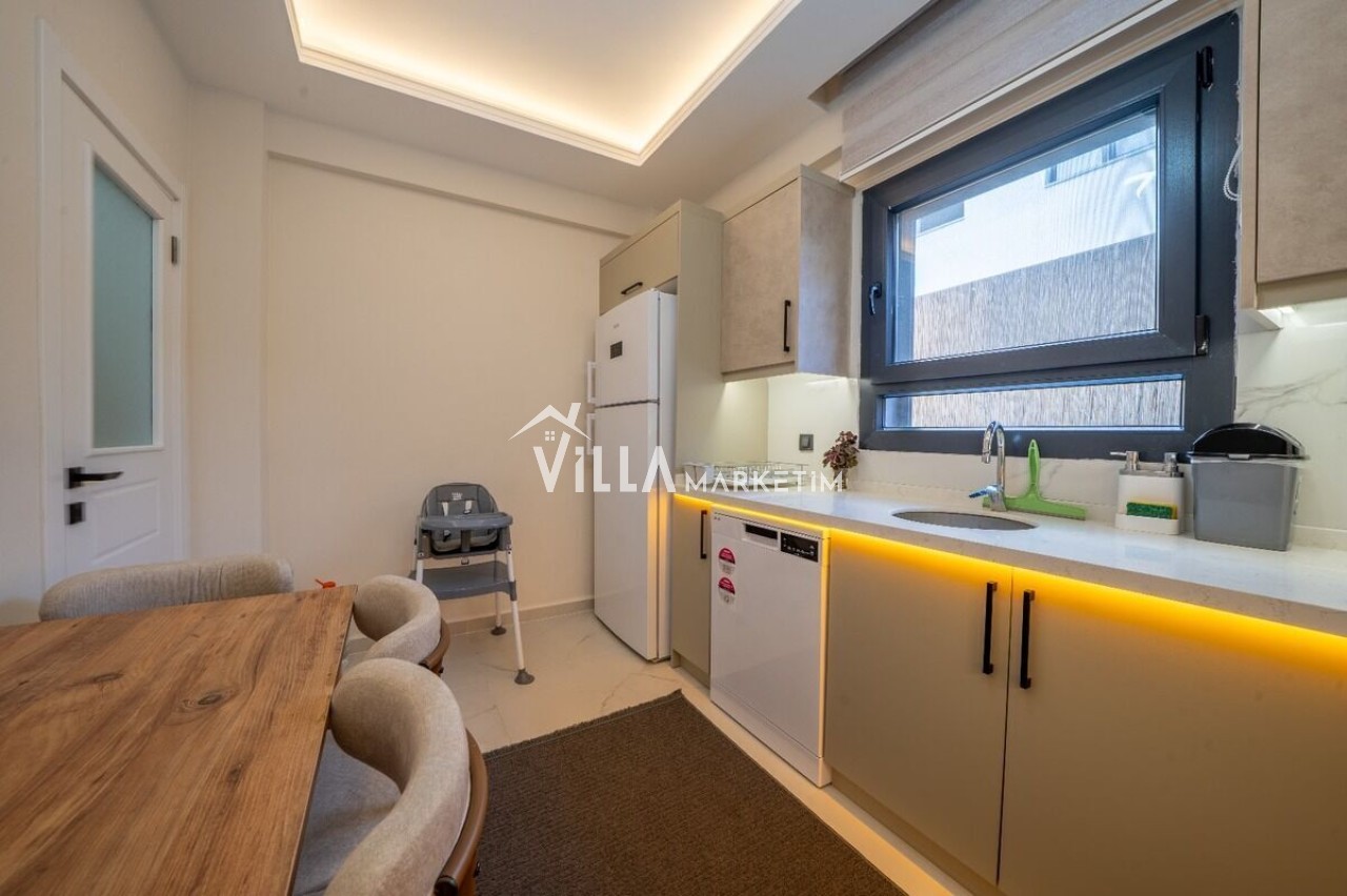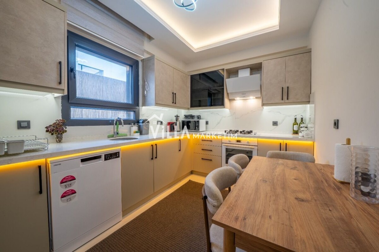 Mutfak : Modern Amerikan mutfaktır. Bulaşık makinesi, ankastre 4’lü ocak, buzdolabı, kaşık çatal seti, çamaşır makinesi, ankastre fırın, 8 kişilik yemek takımı, elektrikli su ısıtıcısı (kettle), tencere tava takımı ve bardaklar bulunmaktadır. Mutfak havuz katındadır.