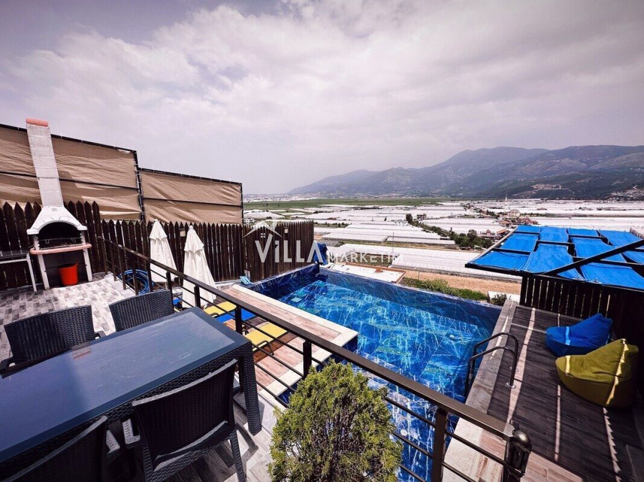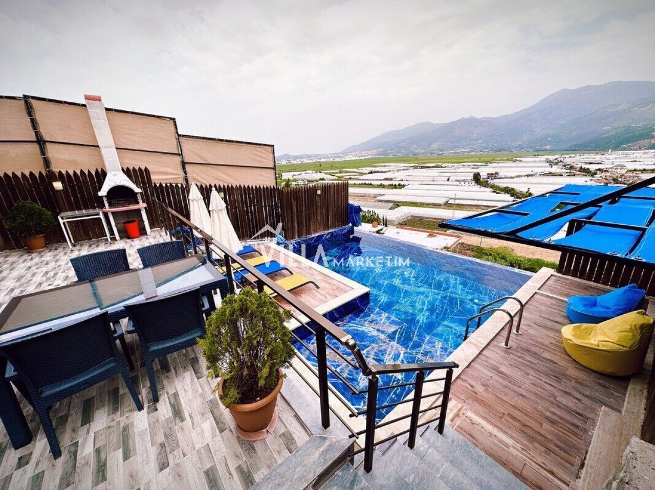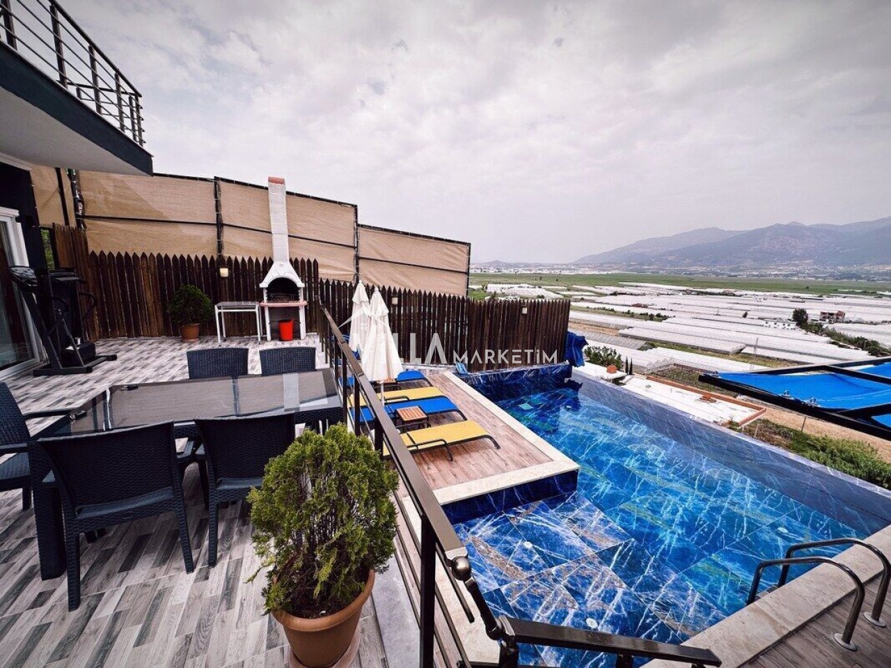 Havuz Terası : Havuz terasında, özel yüzme havuzu, 3 adet armut, yemek masası ve sandalyeler, şezlong, güneş şemsiyesi, salıncak, koşu bandı ve mangal bulunmaktadır.