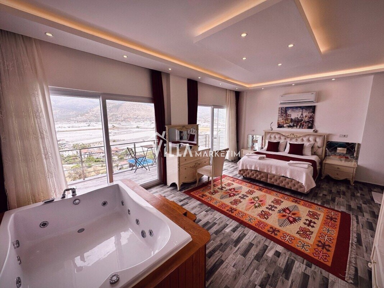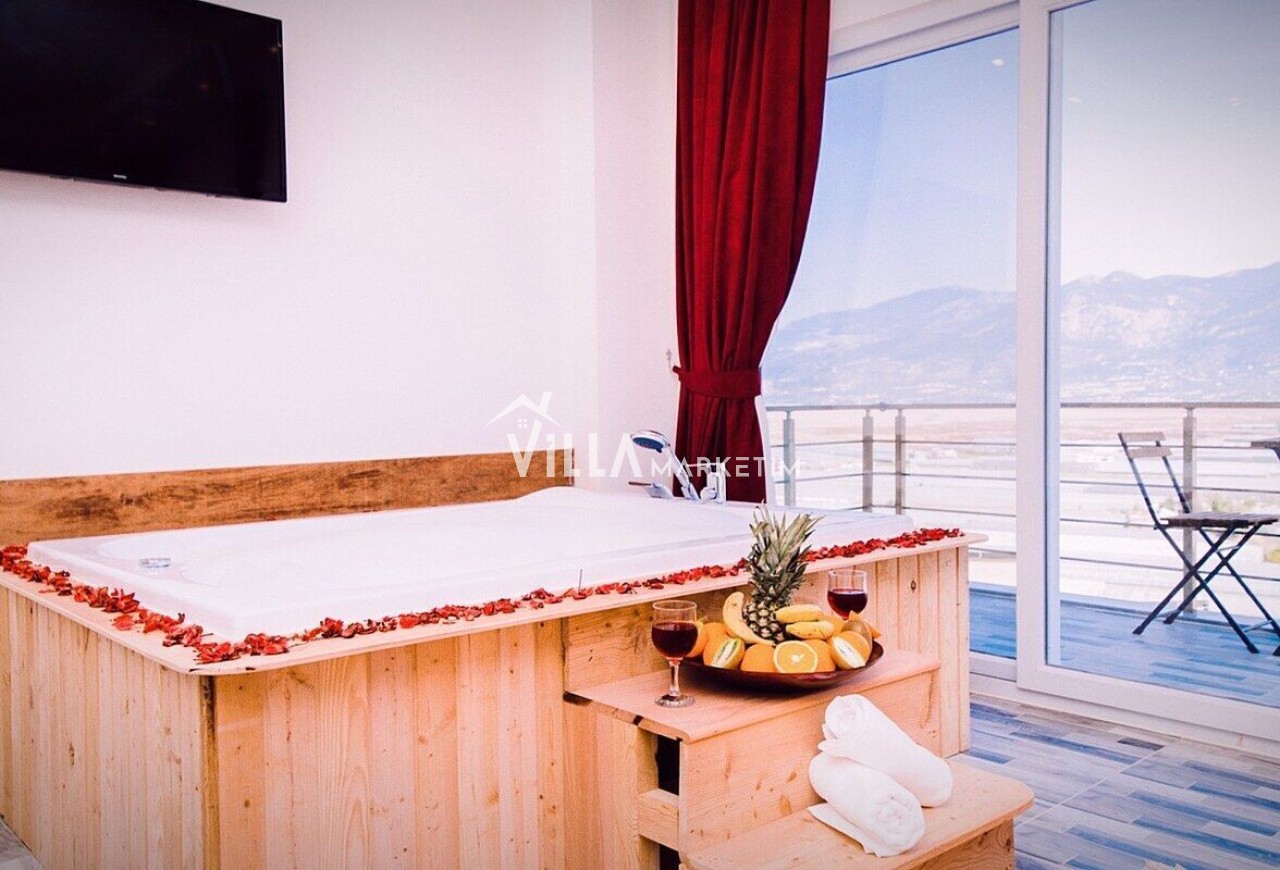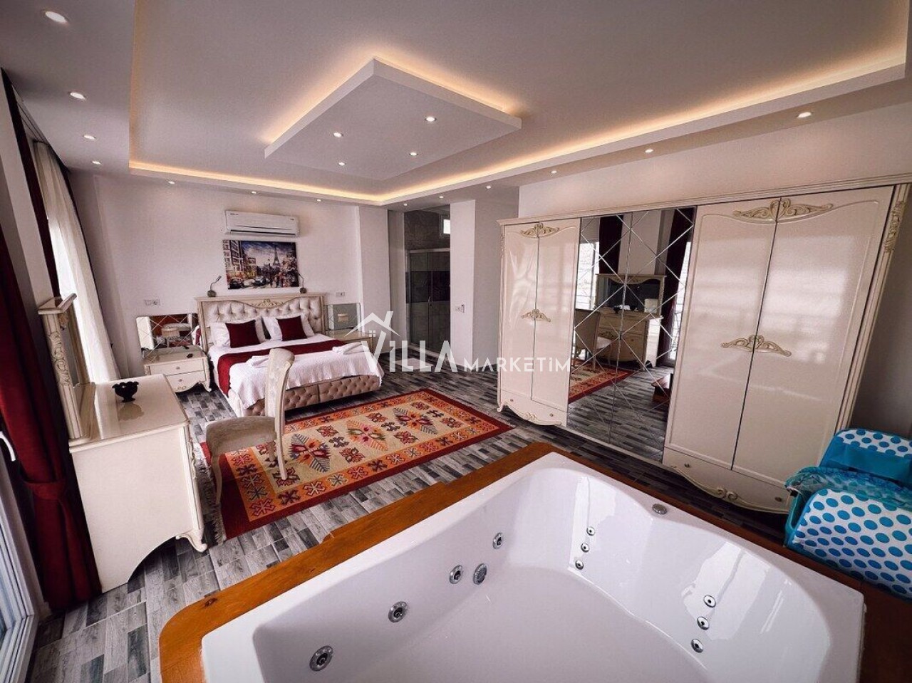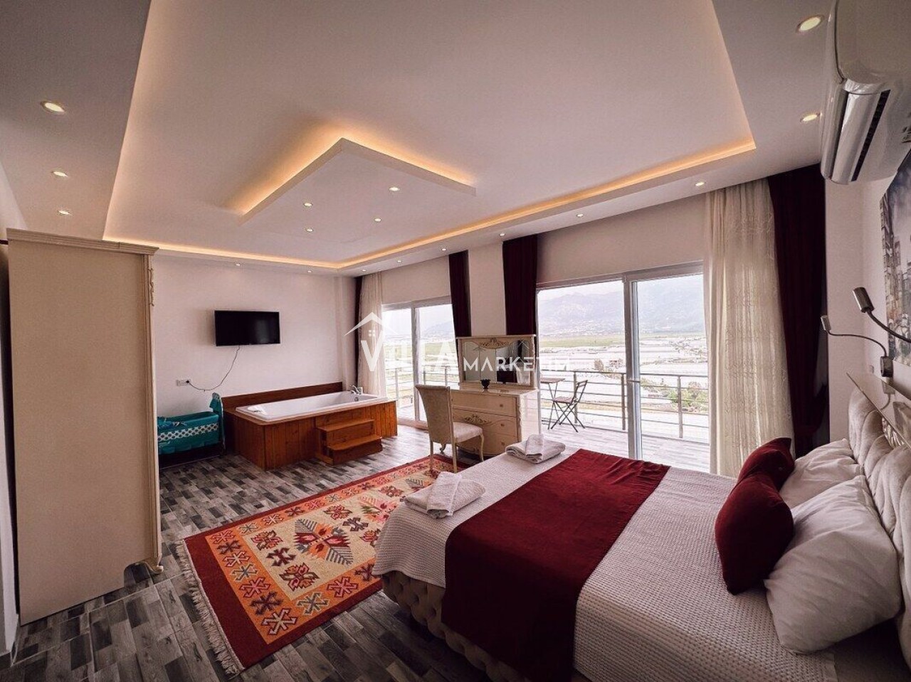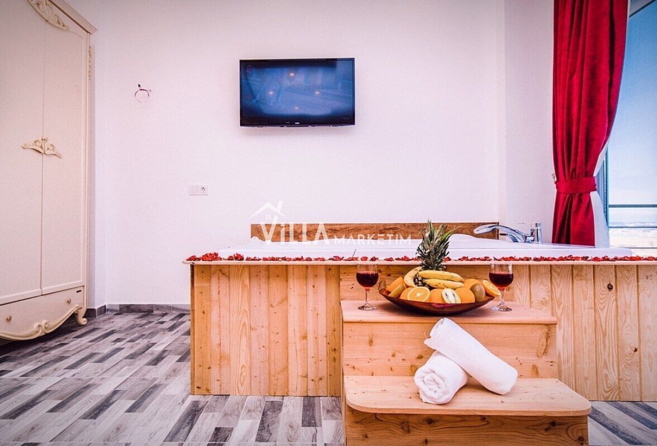 1. Yatak Odası : Klimalı, Suit aile yatak odasıdır. 1 adet çift kişilik yatak, jakuzi , makyaj masası, komodin, giysi dolabı, banyo & wc ve balkon bulunmaktadır. ( Balkon içerisinde 2 kişilik masa sandalye bulunmaktadır.)