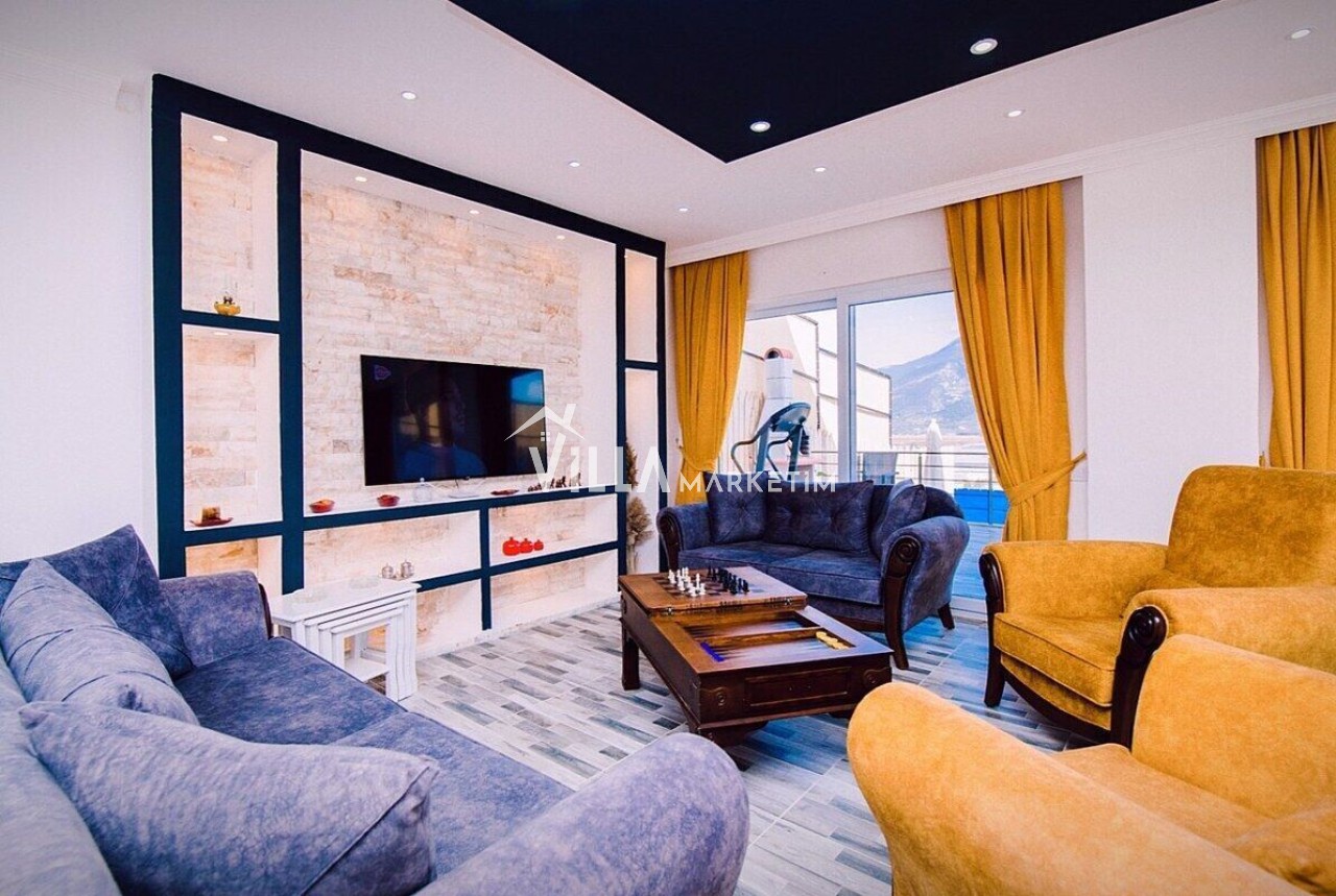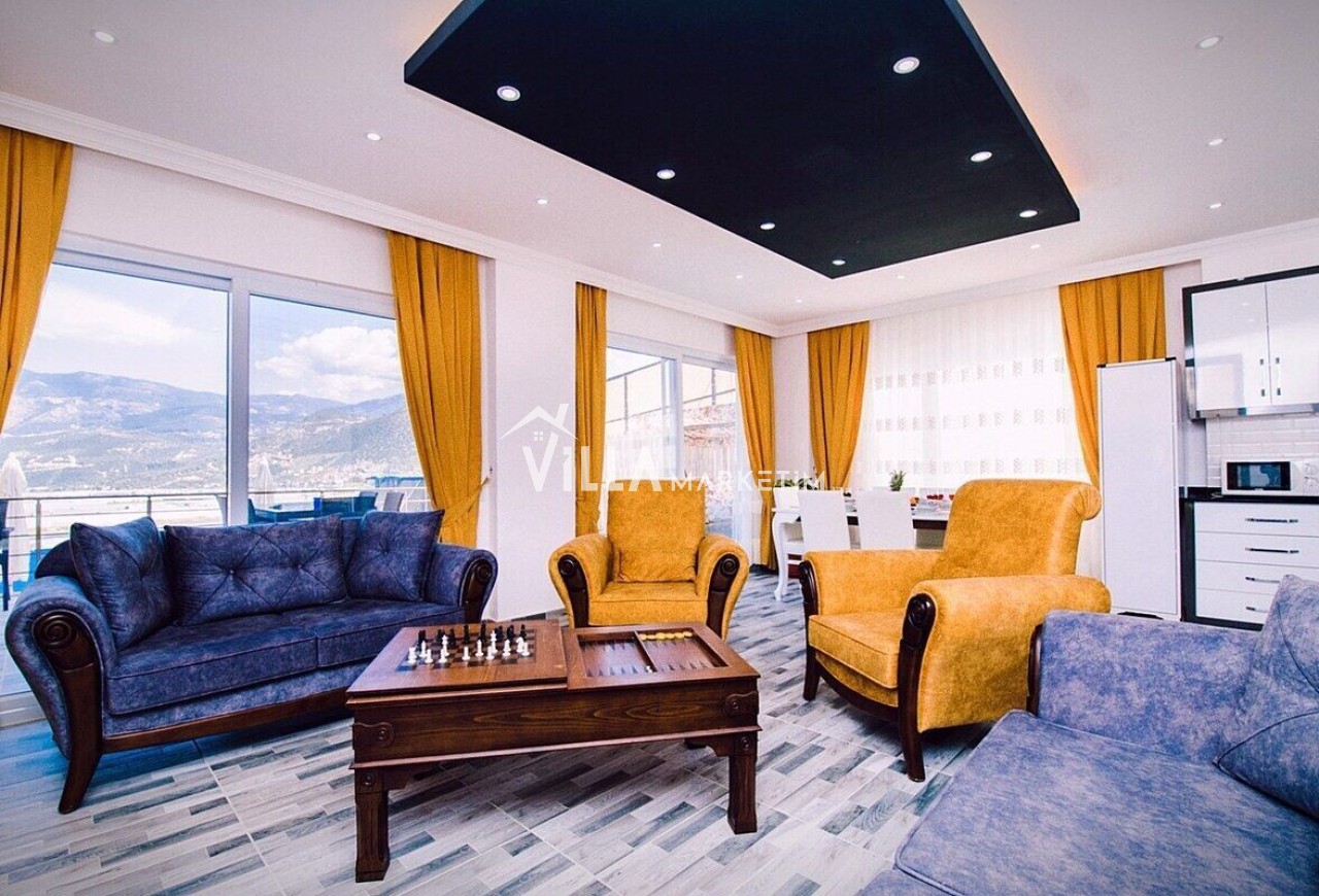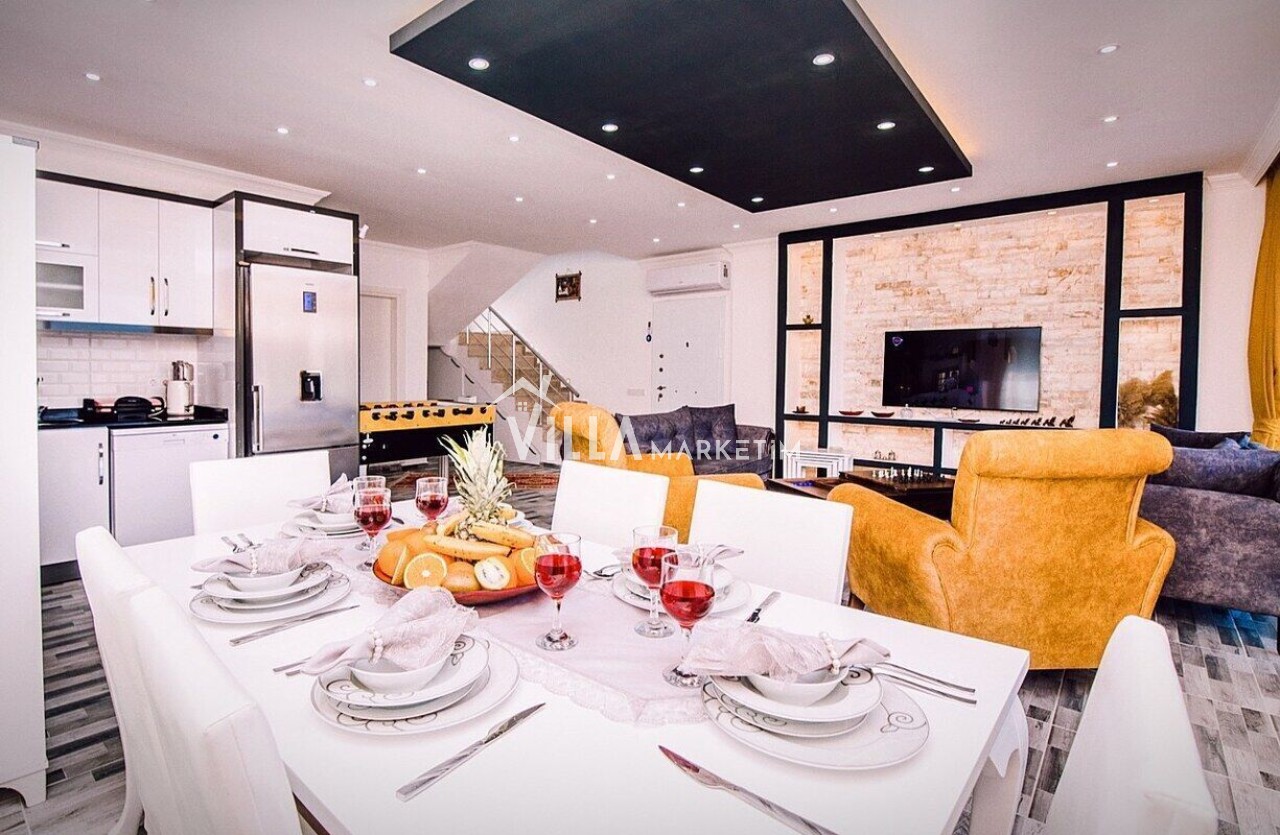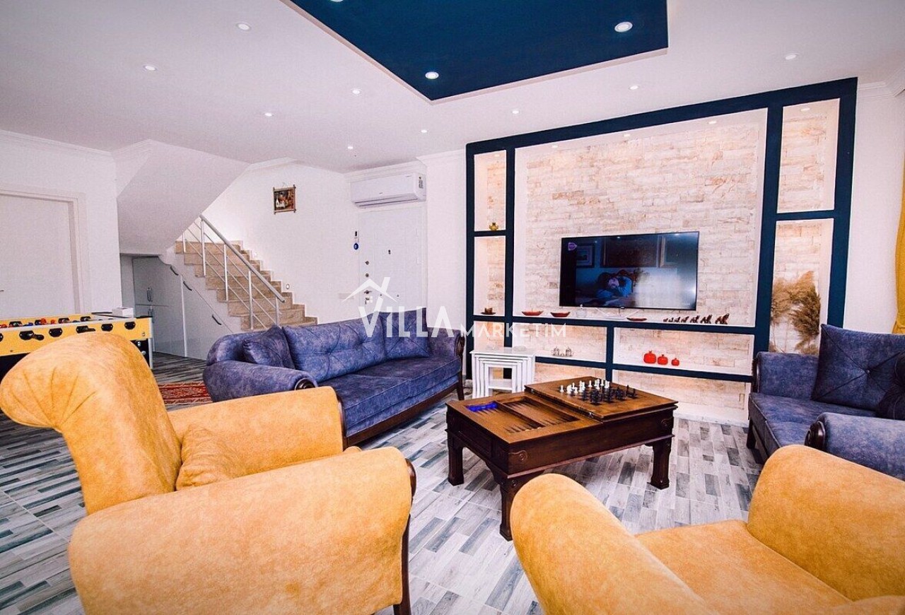 Salon : Modern ve konforlu oturma grubu, orta sehpa, sehpa , TV, uydu alıcısı, modem, langırt , yemek masası ve klima bulunmaktadır. Salondan havuz terasına çıkış mevcuttur.