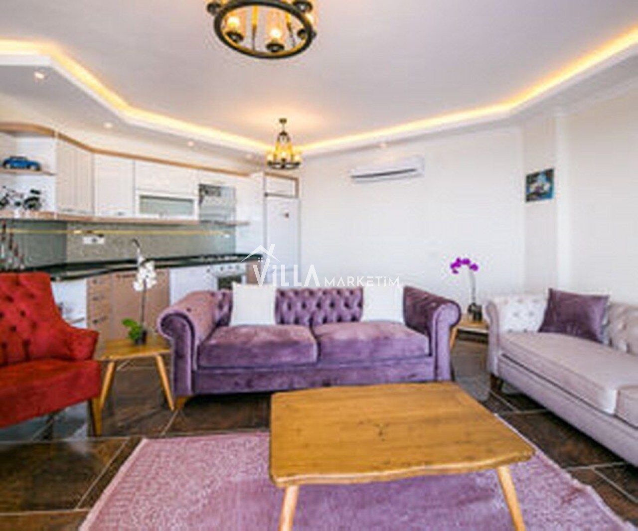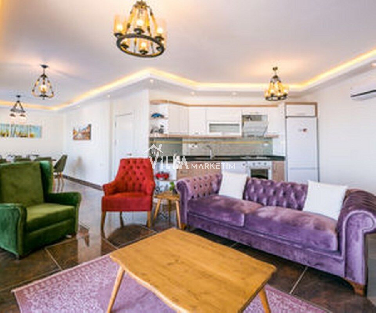 Mutfak : Modern açık Amerikan mutfaktır. Mutfakta; fırın, buzdolabı, bulaşık makinesi, 4’lü ocak, 6 kişilik yemek takımı, kaşık çatal takımı, tencere ve tava takımı, bardaklar vb yer almaktadır.