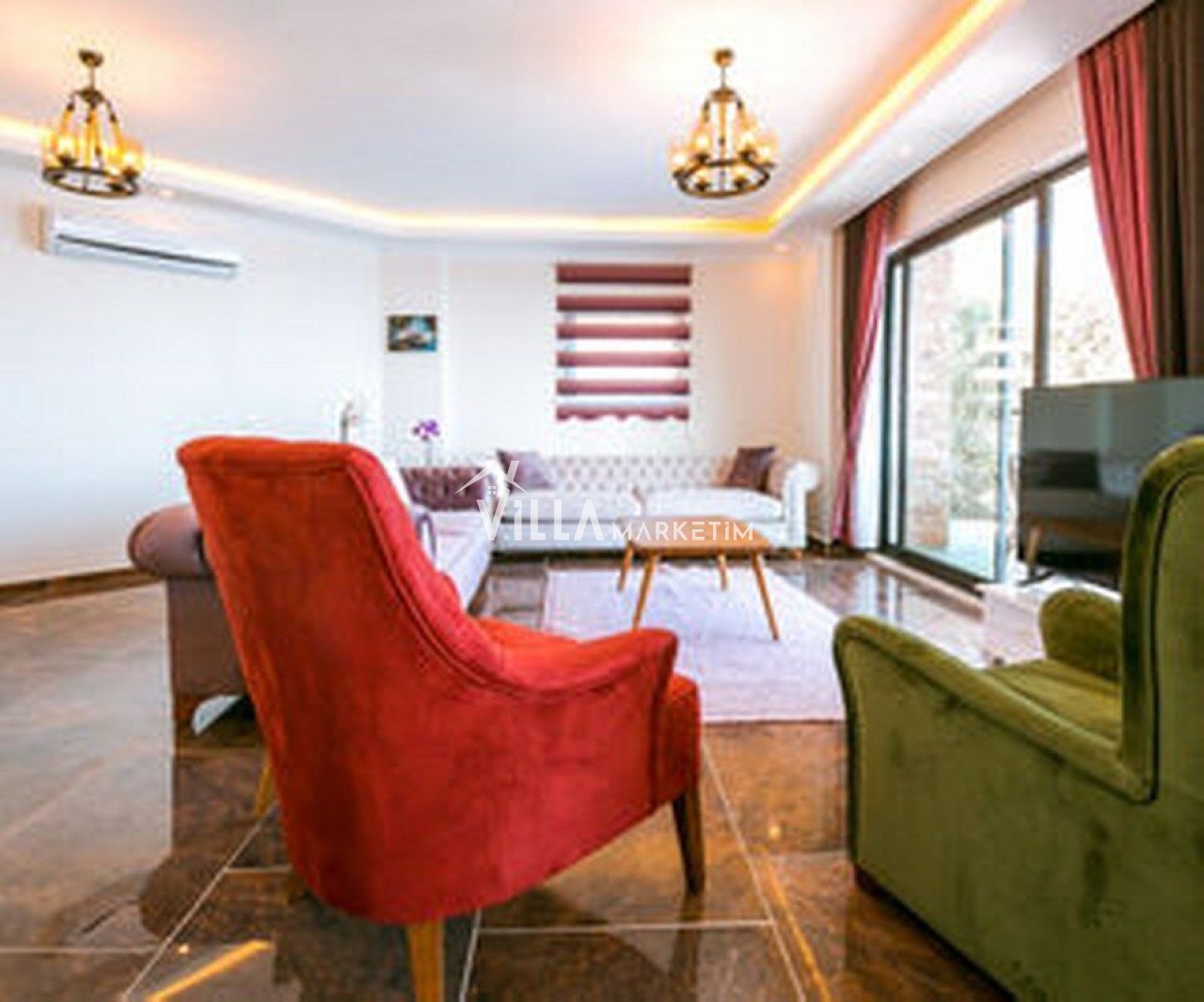 Salon : Modern bir anlayışla dekore edilen salonda oturma grubu, masa ve sandalyeler, klima, TV, uydu alıcısı, Wi-fi bulunmaktadır. Salondan havuz kenarına çıkış mevcuttur.