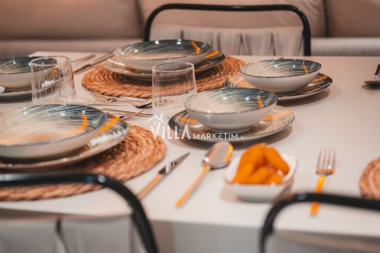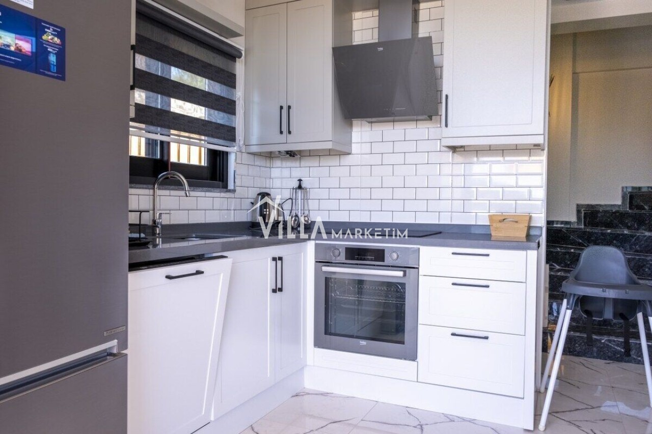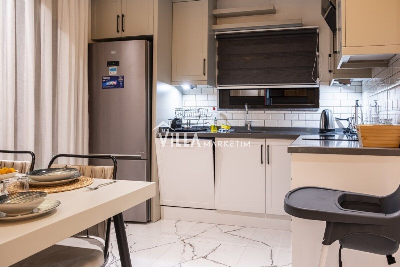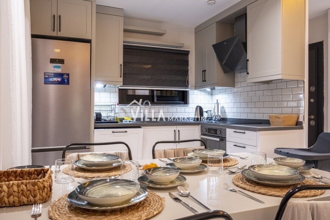 Mutfak : Modern Amerikan mutfak içerisinde buzdolabı, bulaşık makinesi, çamaşır makinesi, 4’lü ocak seti, davlumbaz, kettle, Türk kahvesi makinesi, mutfak araç gereçleri (tabak&bardaklar, tencere&tavalar vb.) ve 4 kişilik yemek masası mevcuttur.