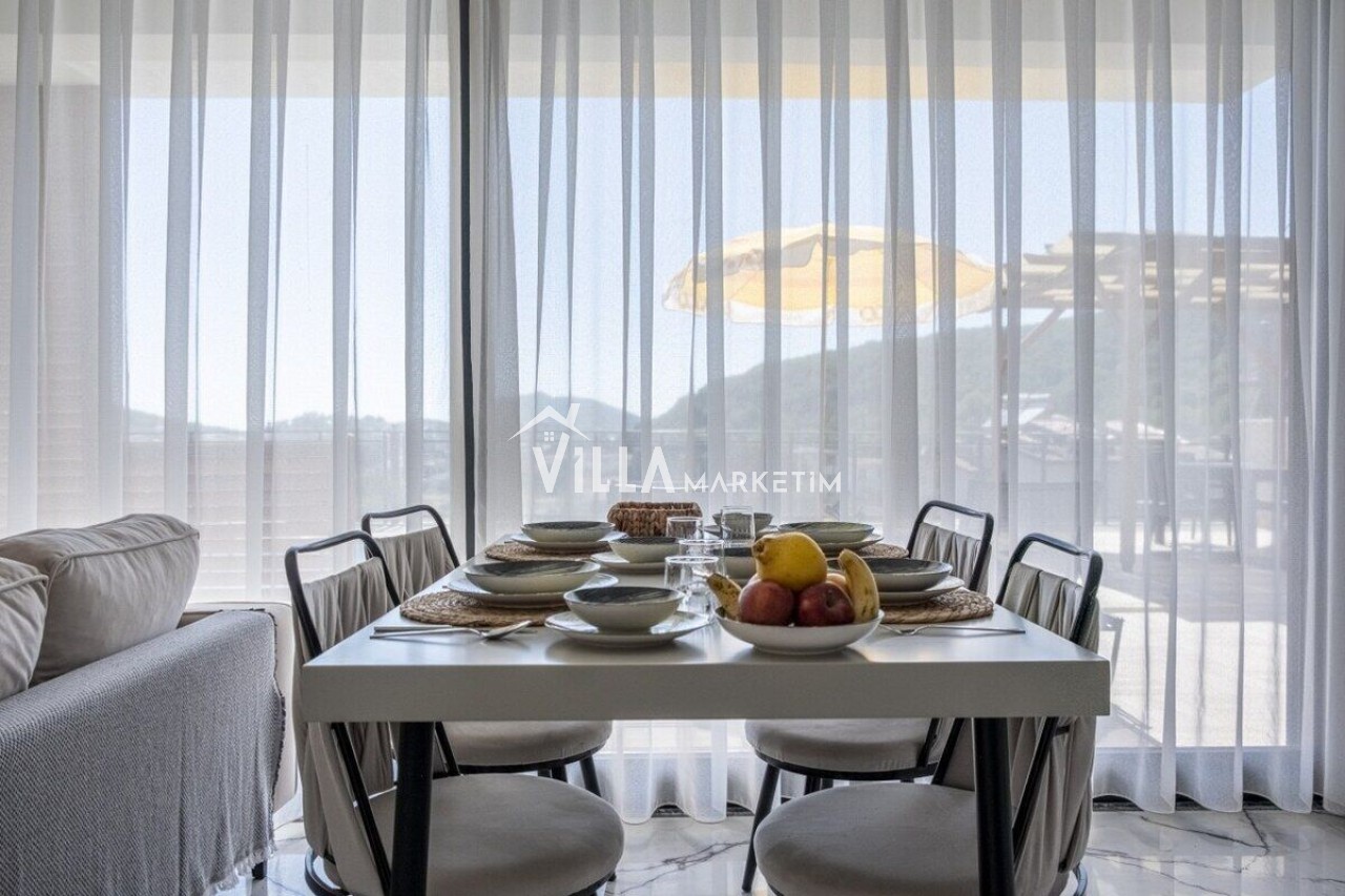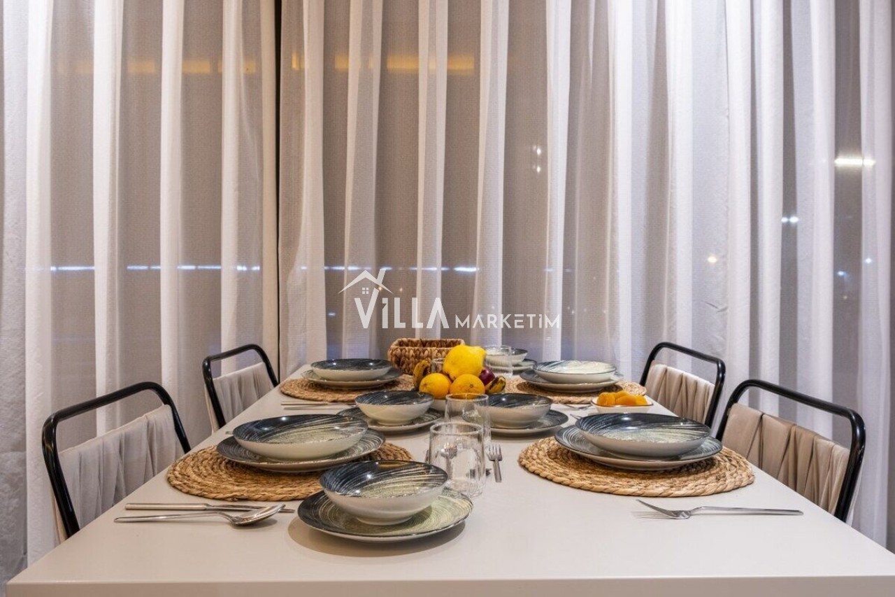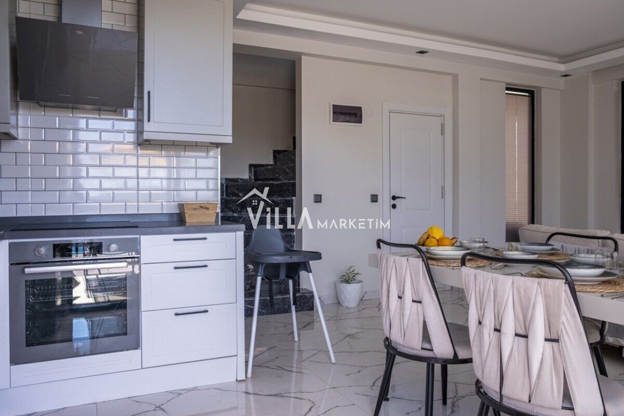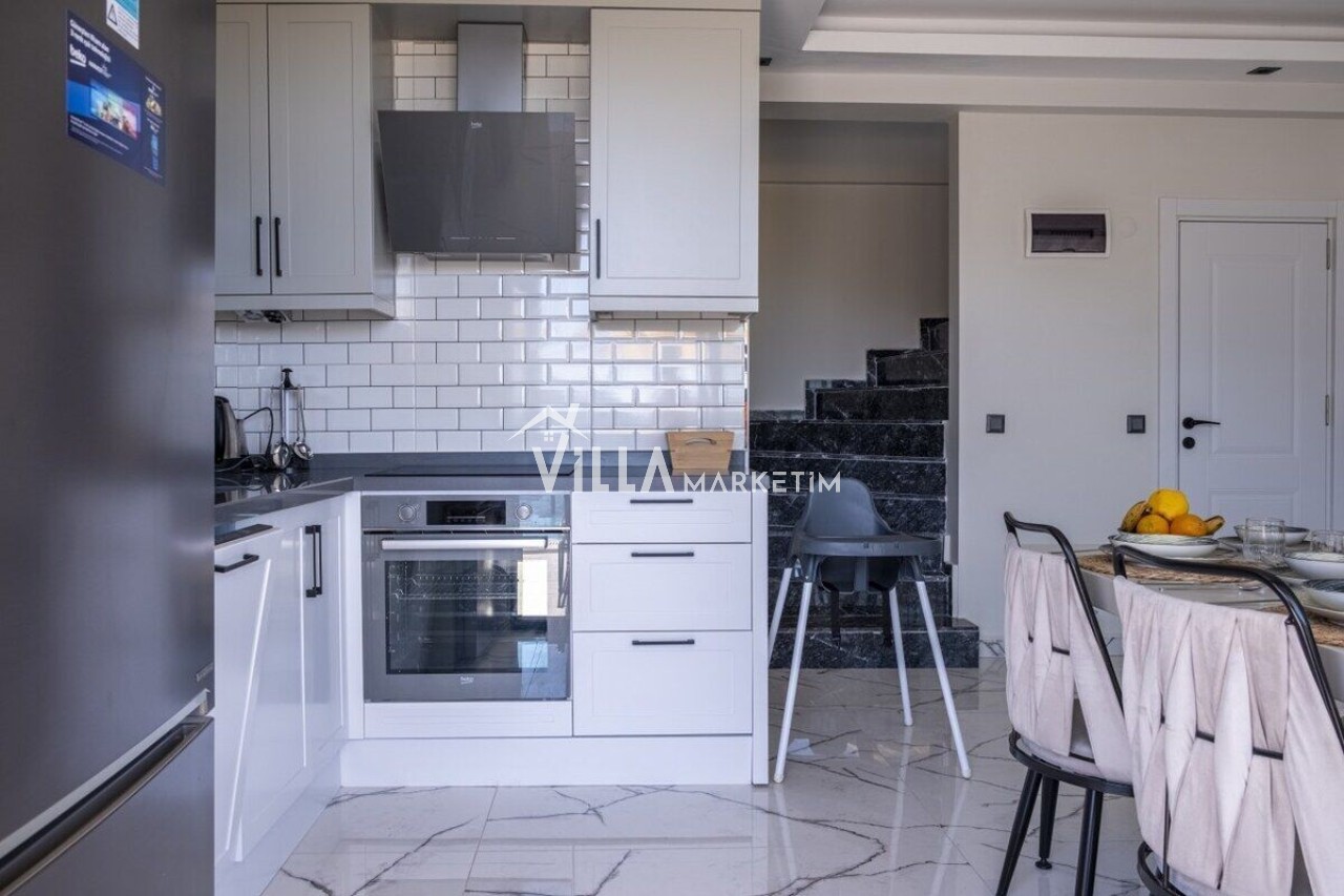 Mutfak : Modern Amerikan mutfak içerisinde buzdolabı, bulaşık makinesi, çamaşır makinesi, 4’lü ocak seti, davlumbaz, kettle, Türk kahvesi makinesi, mutfak araç gereçleri (tabak&bardaklar, tencere&tavalar vb.) ve 4 kişilik yemek masası mevcuttur.