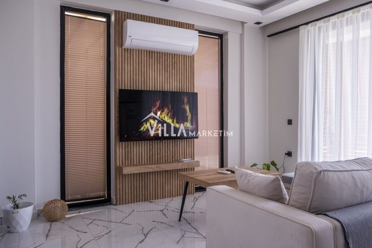 Salon : Salon içerisinde şık bir oturma grubu, orta sehpa, TV, klima, WC ve havuz terasına direkt çıkış mevcuttur.