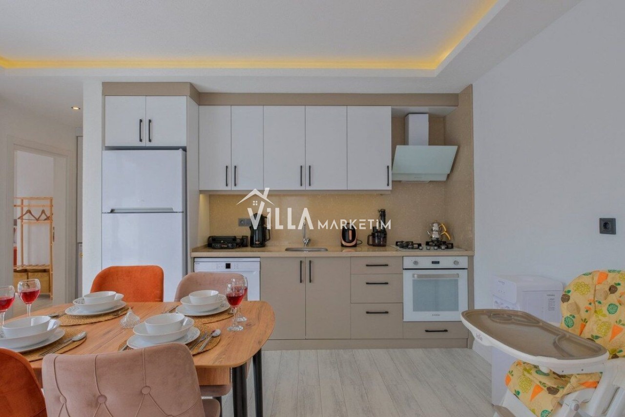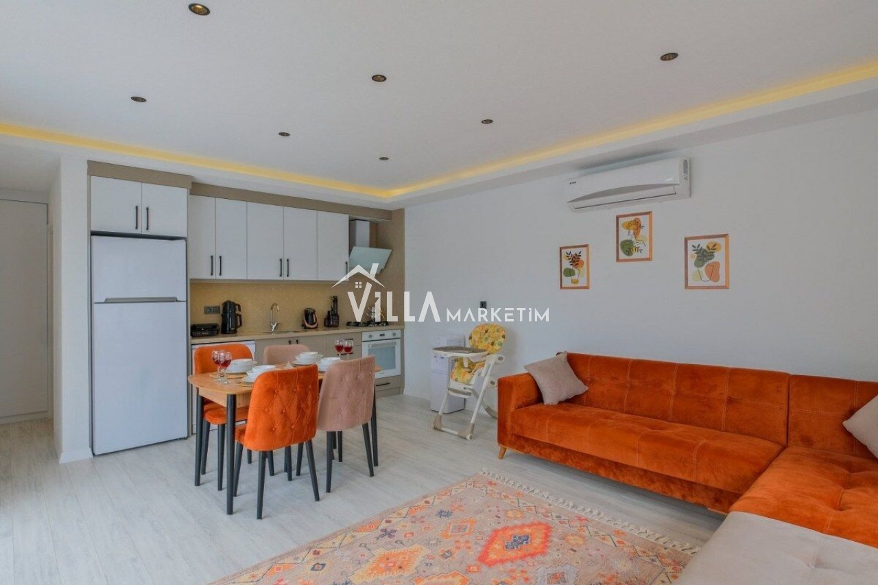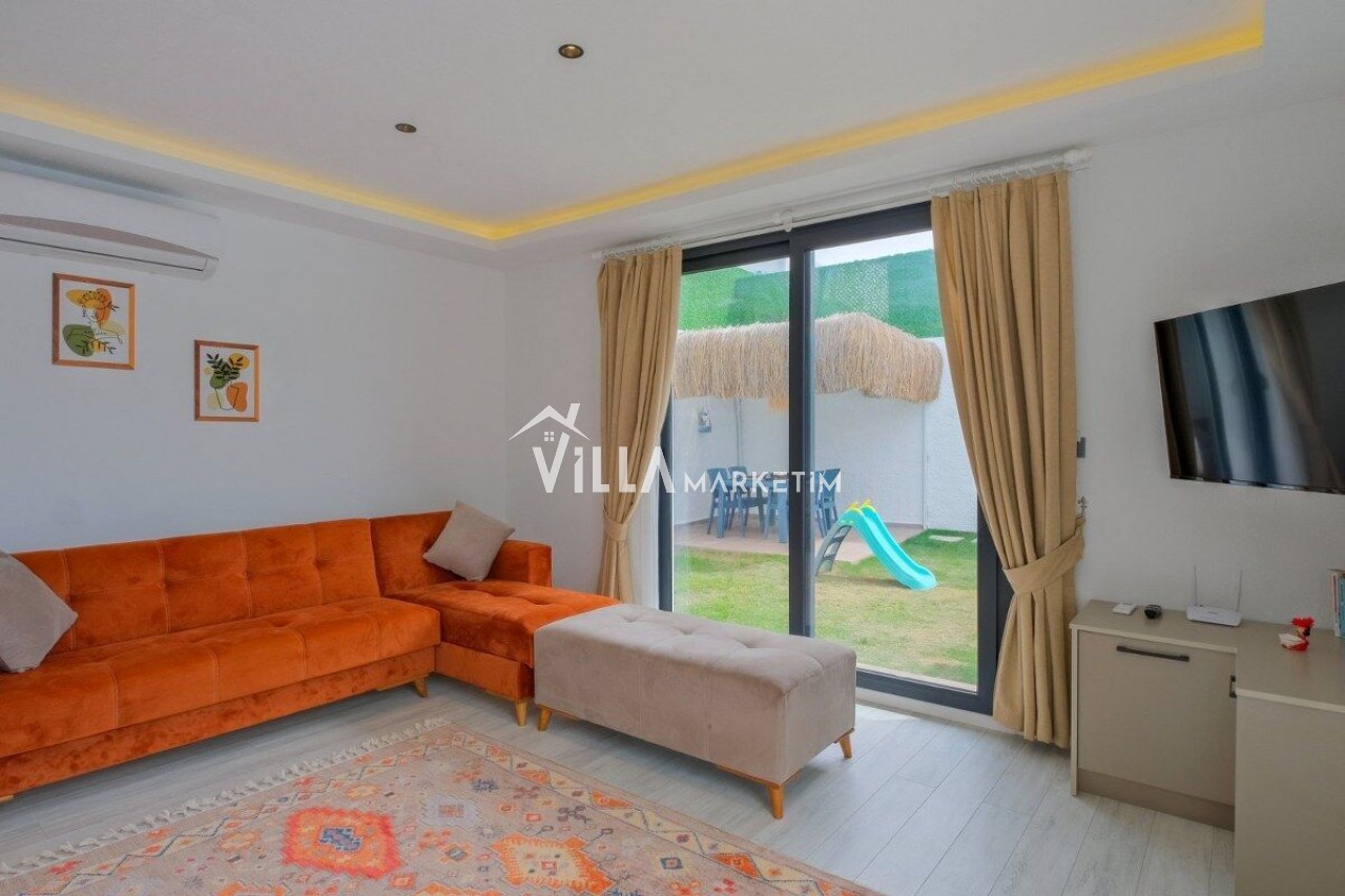 Salon: Özenle döşenmiş açık mutfaklı salon, modern koltuklar, 4 kişilik yemek masası, mama sandalyesi, Lcd tv, uydu alıcısı ve klima bulunmaktadır. Salondan havuz ve bahçeye açılan kapısı mevcuttur.