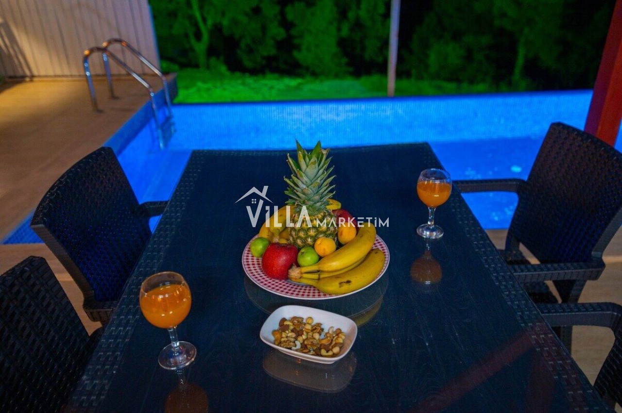 Havuz ve Bahçe : 8 x 4 metre ve 1.50 cm. derinliğinde yüzme havuzu ve içerisinde jakuzi, şezlong, şemsiye, veranda, bahçe oturma grubu, salıncak, mangal, masa ve sandalye, Bahçe ve havuz bakımı günde 1 kez sabah yapılır.
