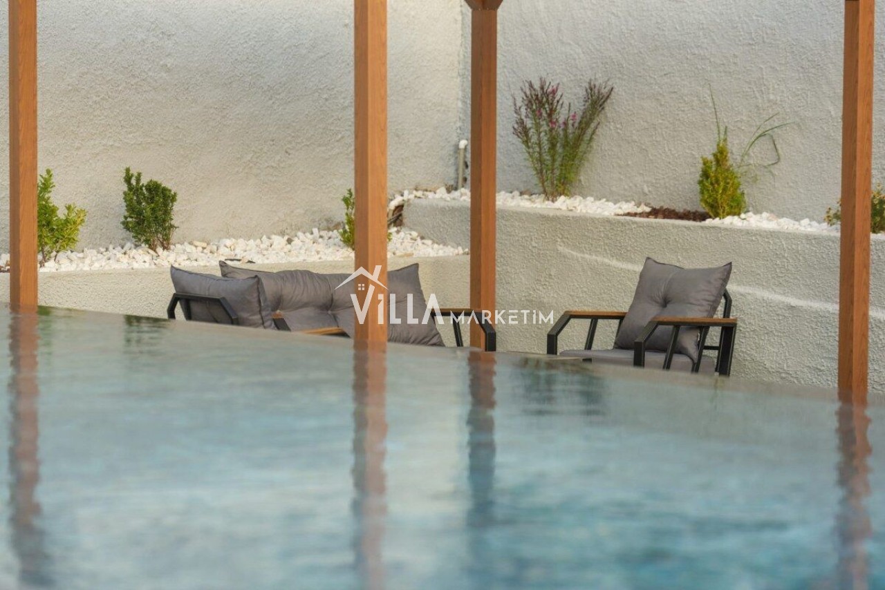 Toplam 4 yatak odasından oluşmuş, 8 kişi konaklama kapasitesine sahiptir. Geniş aileler ve kalabalık arkadaş grupları için oldukça idealdir. Oldukça şık ve modern bir şekilde döşenmiş olan villamızda misafirlerimiz için herşey düşünülmüştür. Havuz terasında bulunan şezlonglarda güneşlenebilir, bahçe masasında muhteşem yemekler yiyebilir, salıncakta sallanıp keyifli dakikalar geçirebilirsiniz.